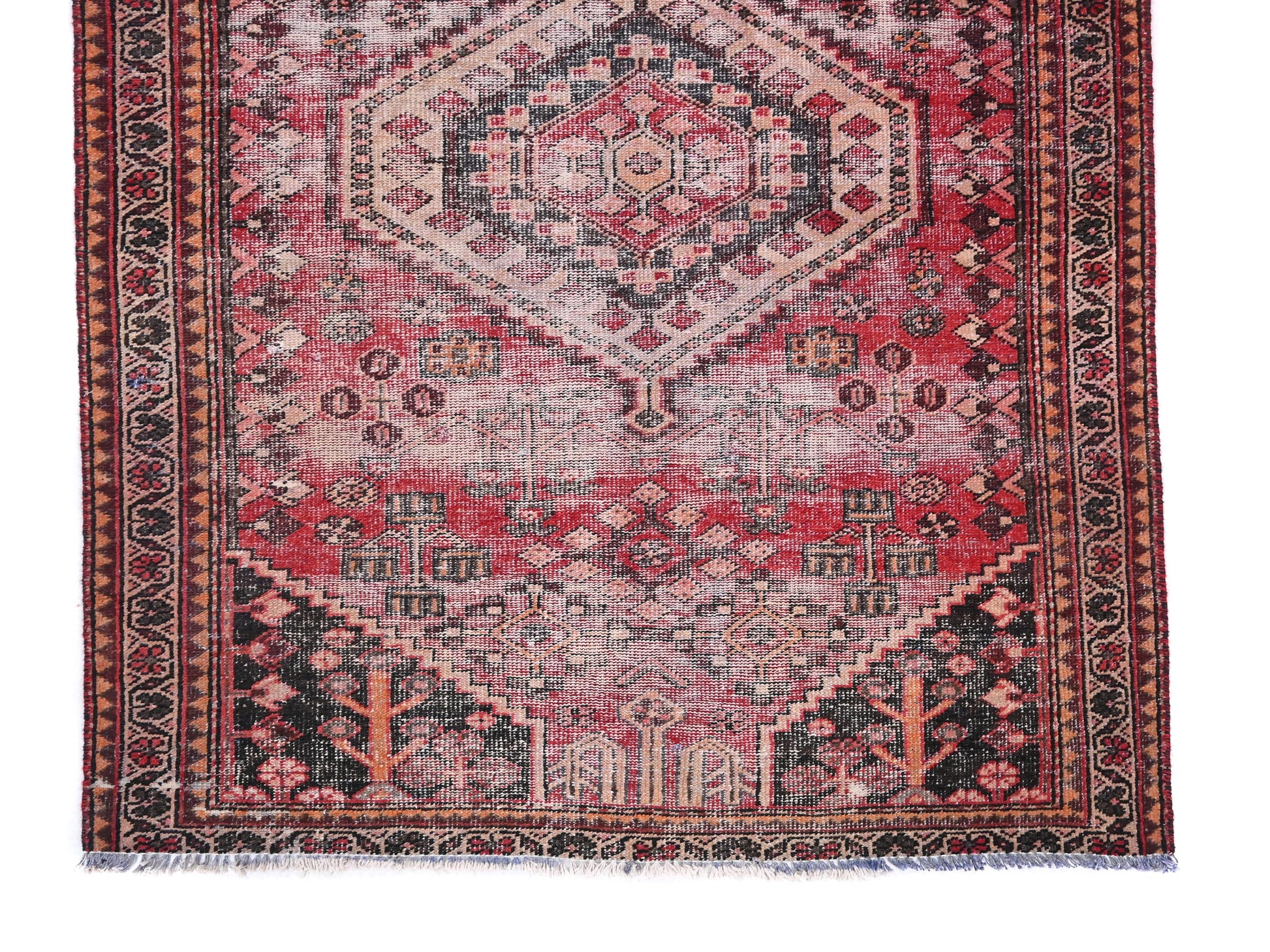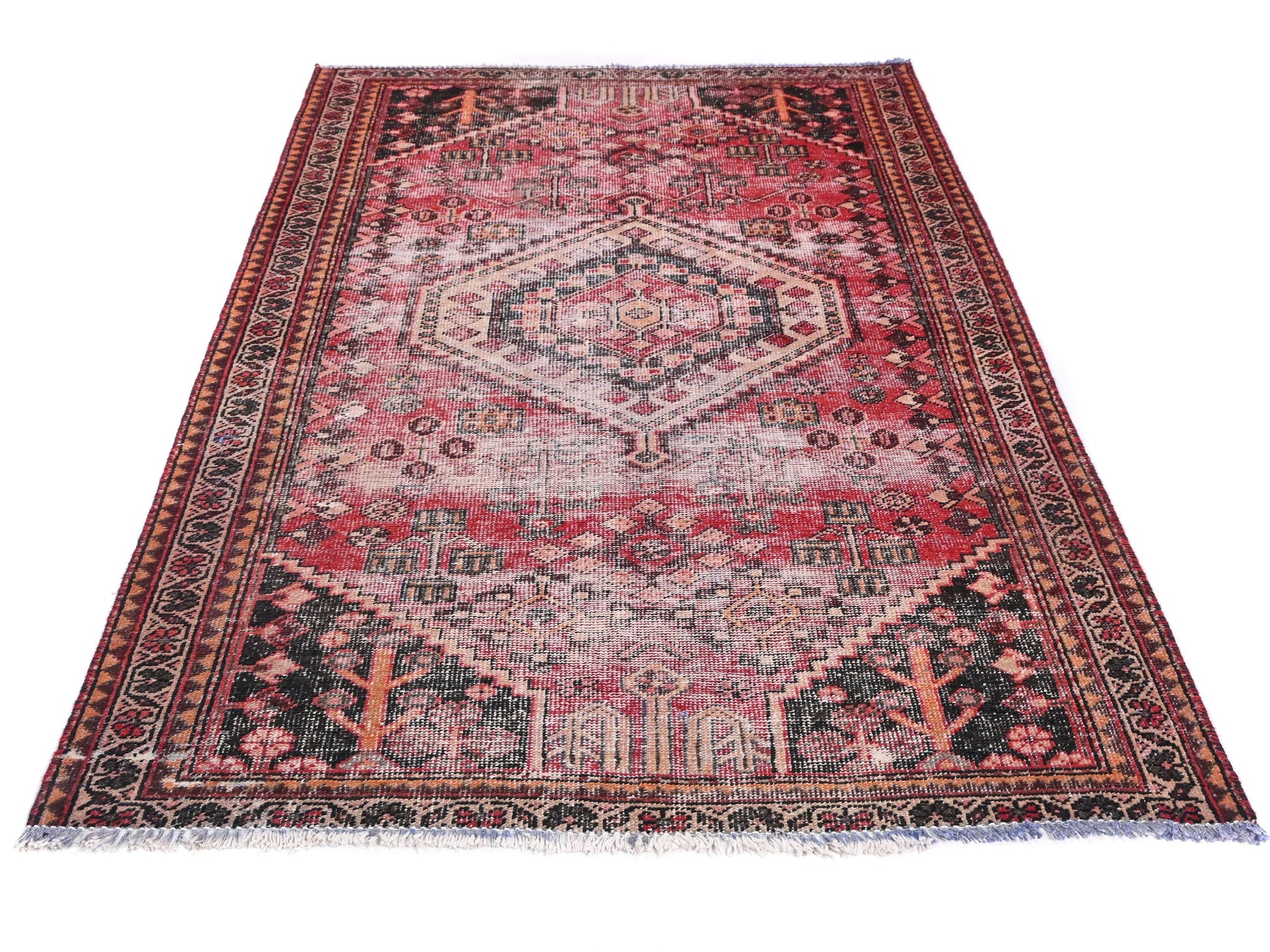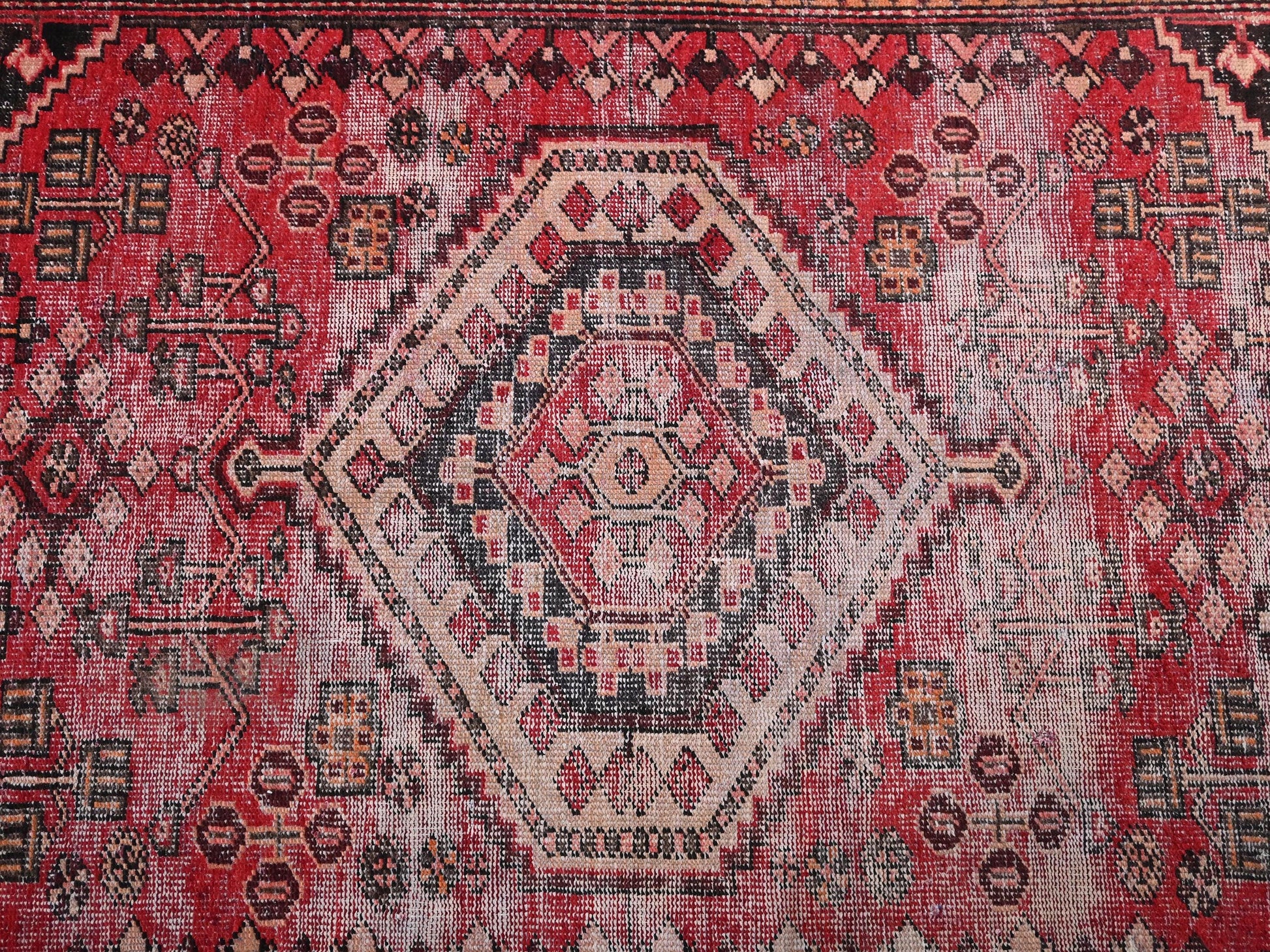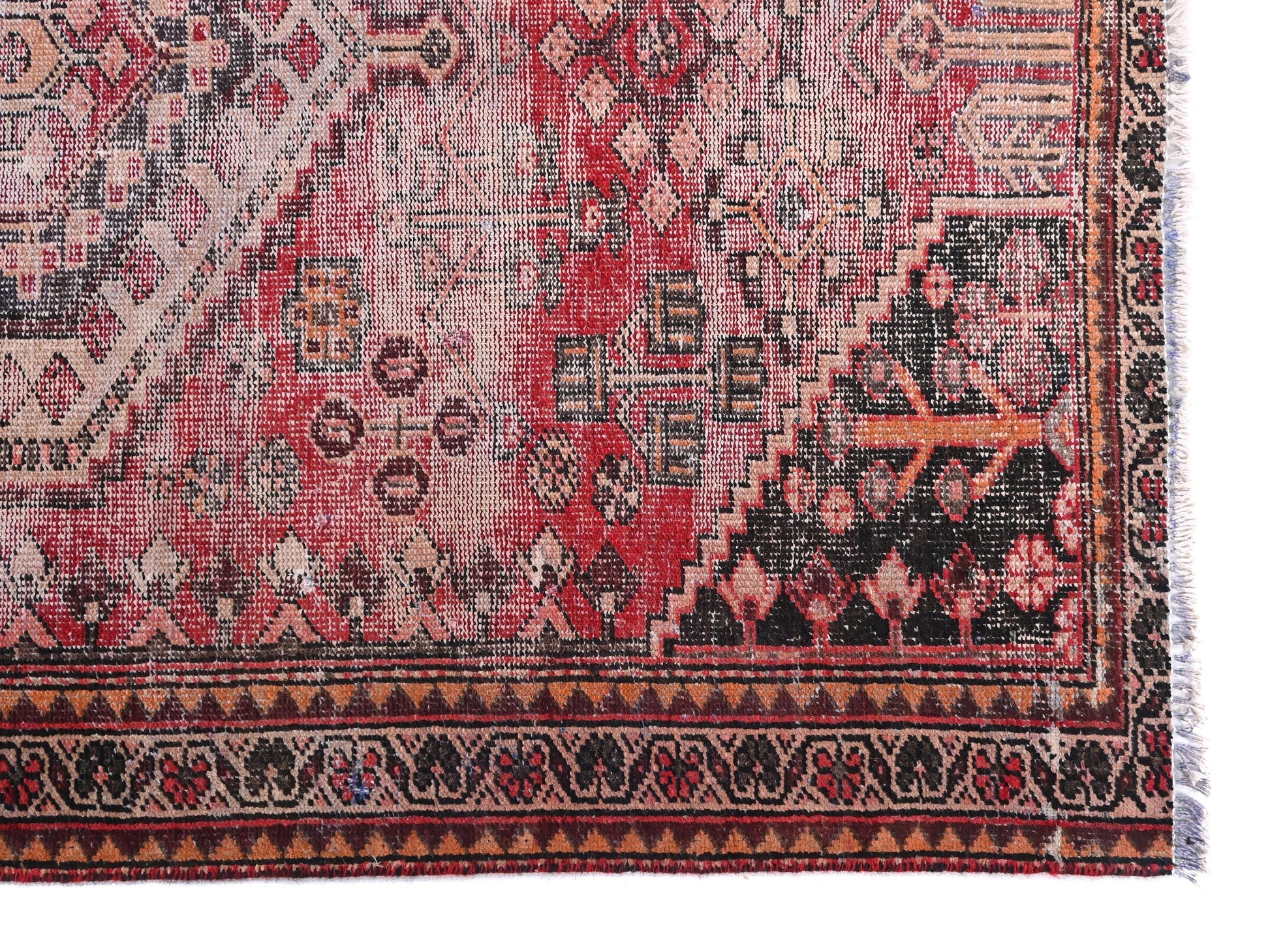 A masterfully woven composition of geometry and heritage, this deep rose-toned tribal rug features a serrated diamond medallion nestled in the heart of a textured field. The palette—rich with crimson reds, walnut brown, and off-white—softens with the gentle patina earned through time, blending tribal motifs and floral hints that appear like fragments of mosaic art across the field.