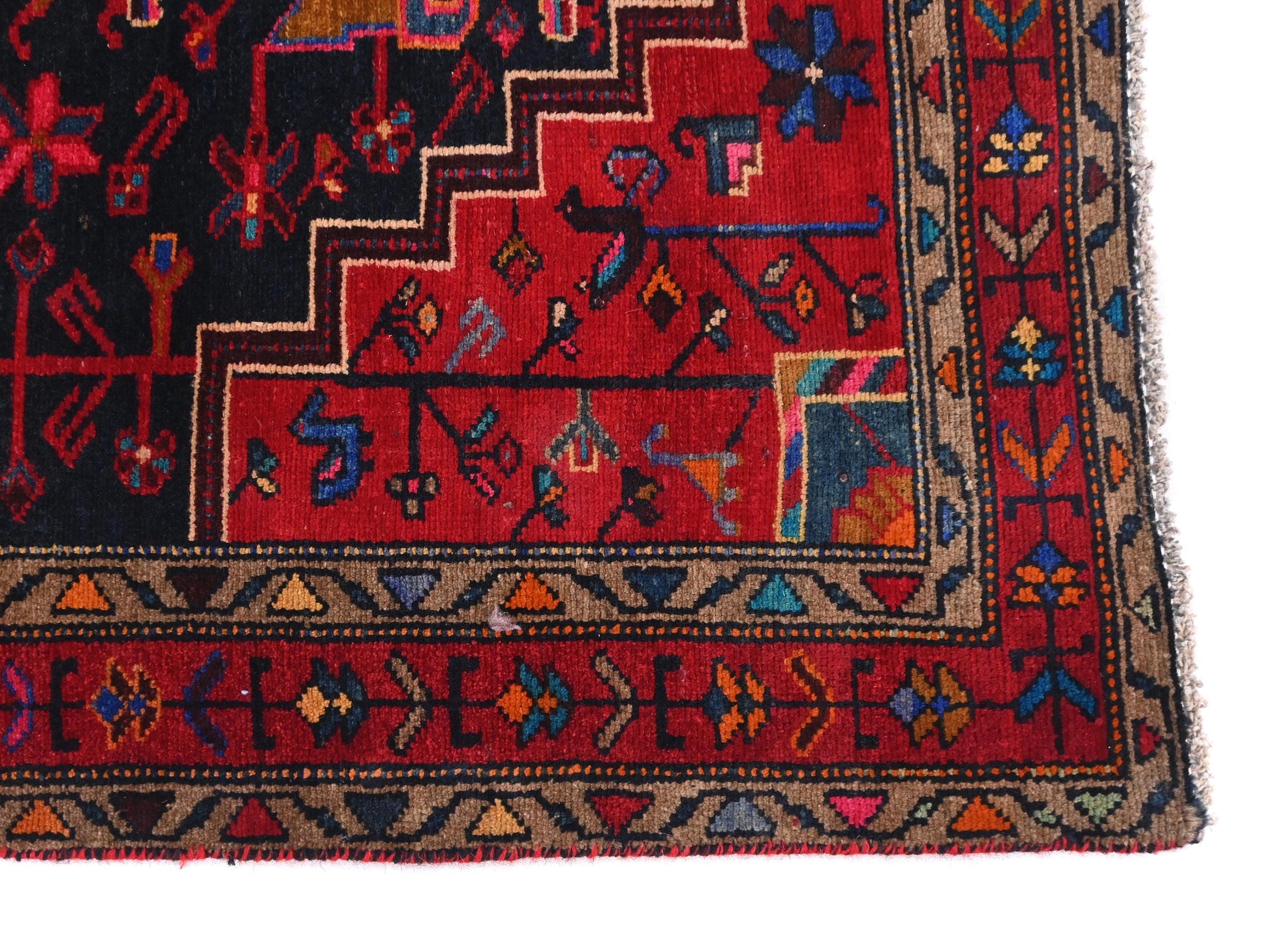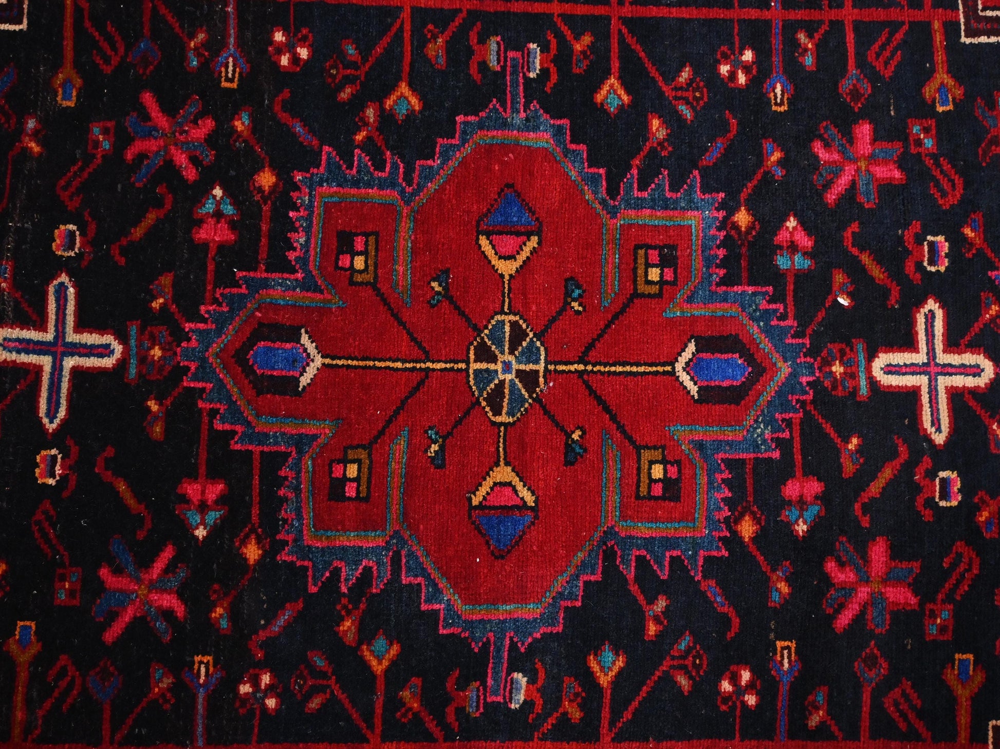 This striking piece evokes a mysterious charm, anchored by a commanding navy field and geometric medallion in bold crimson and saffron. Delicate tribal motifs scatter the canvas like stars in a desert night, while the jagged contour work in ivory and oxblood give this piece an energetic pulse that speaks of ancient mountain craft.