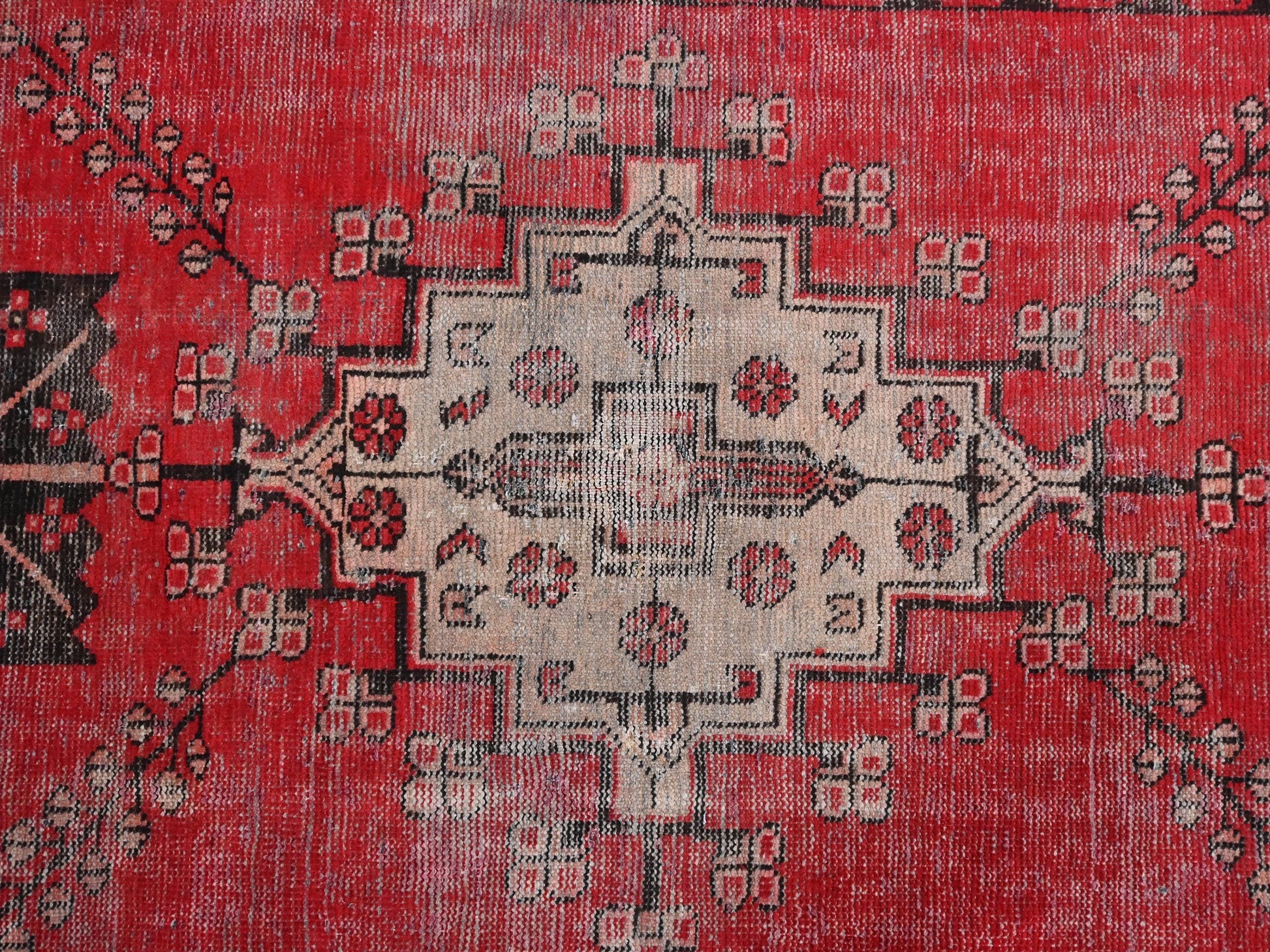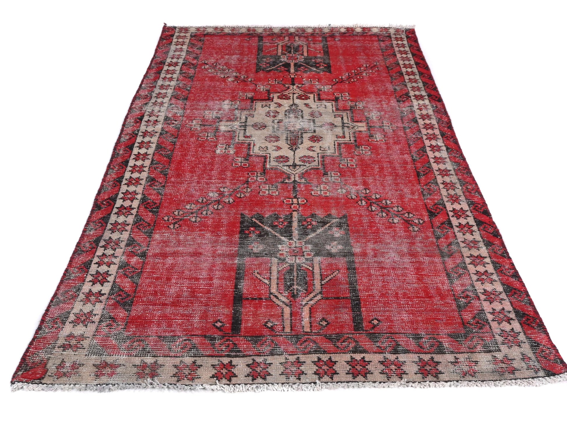 This striking Turkish tribal rug from 1980 commands attention with its bold red field and ornate central diamond medallion. Pale ivory details weave into the structure, evoking floral branches and subtle symmetry across the composition. The faded black corner motifs and crisp white borders frame the piece in timeless Anatolian elegance.
