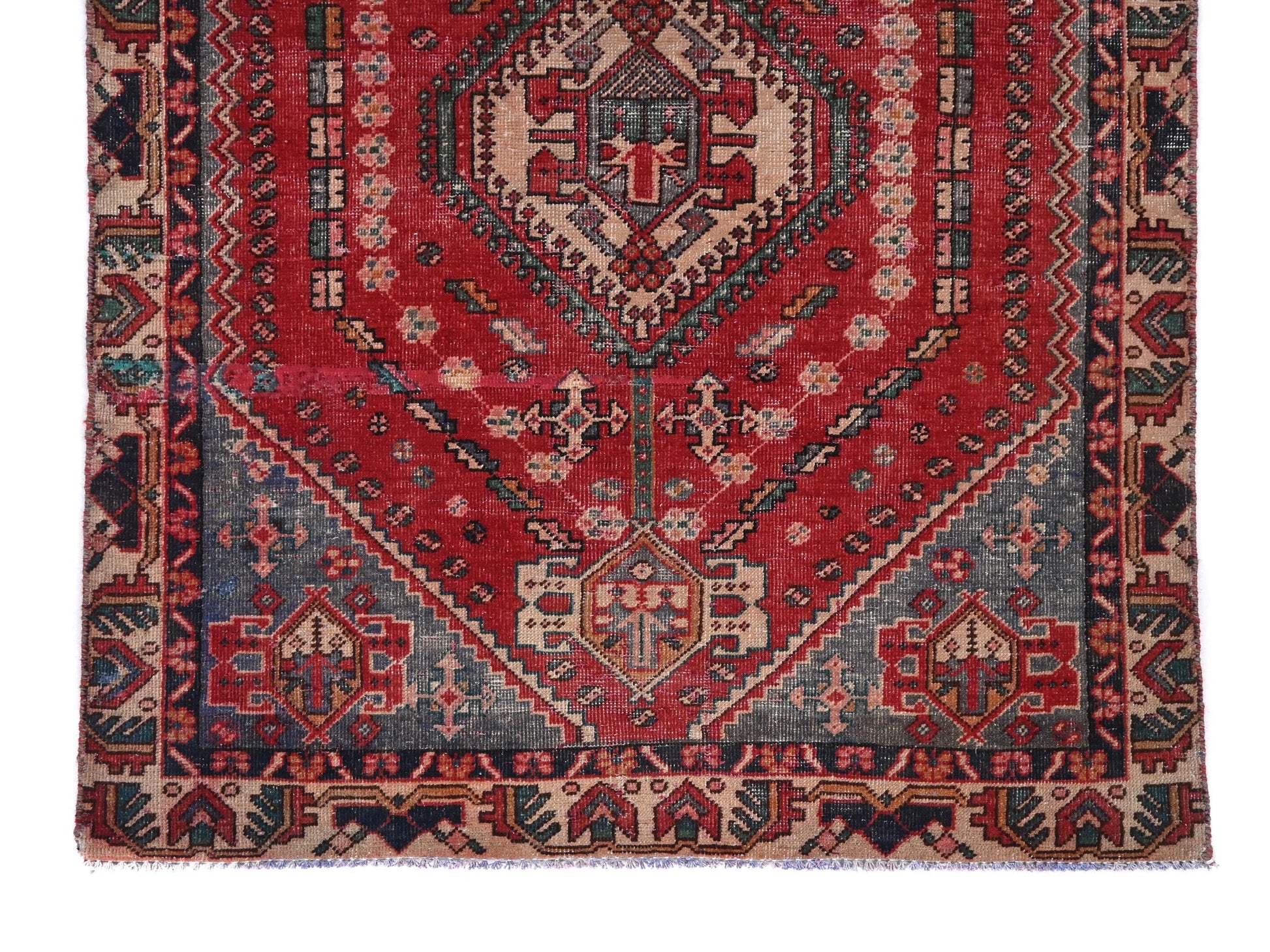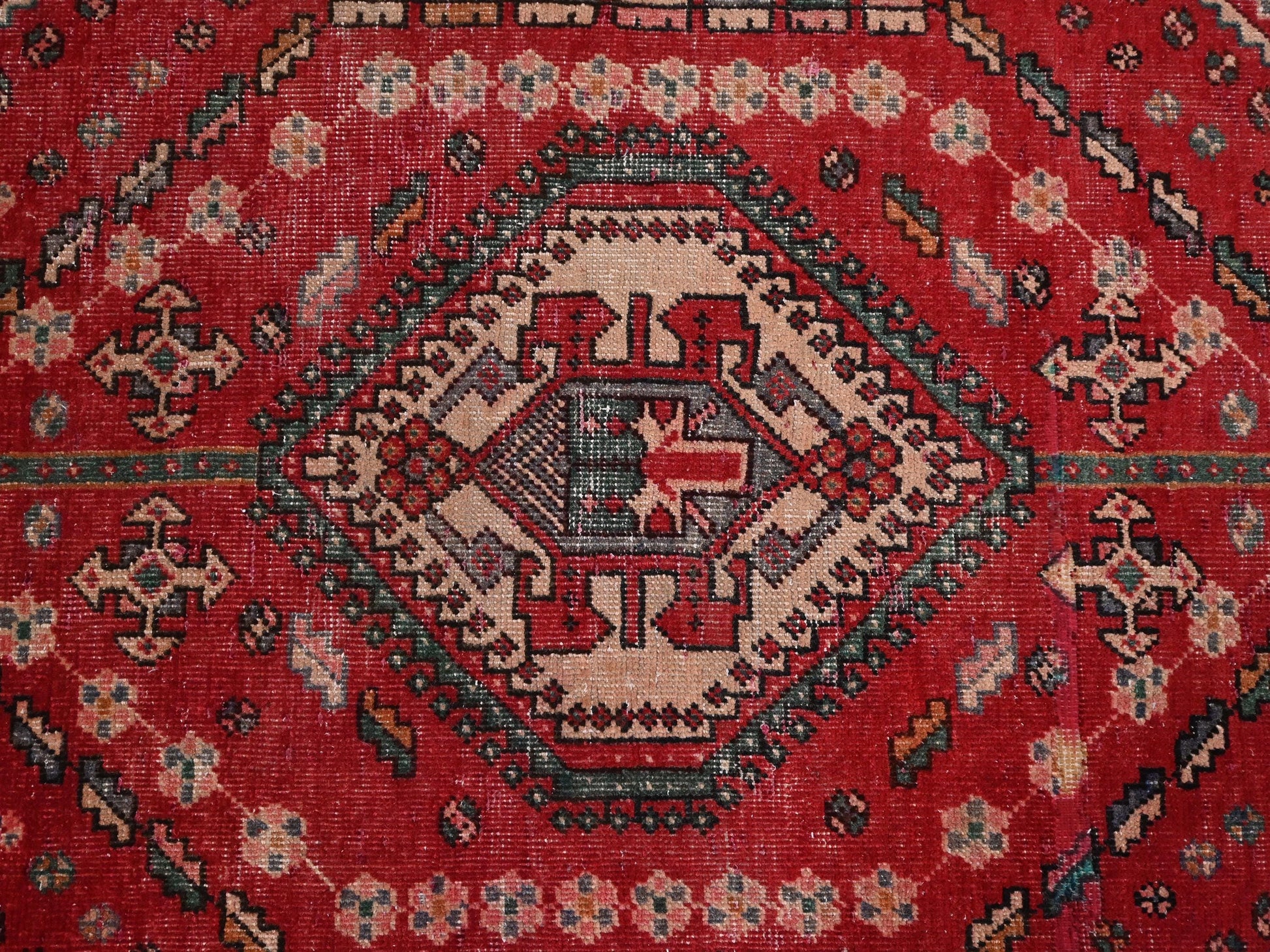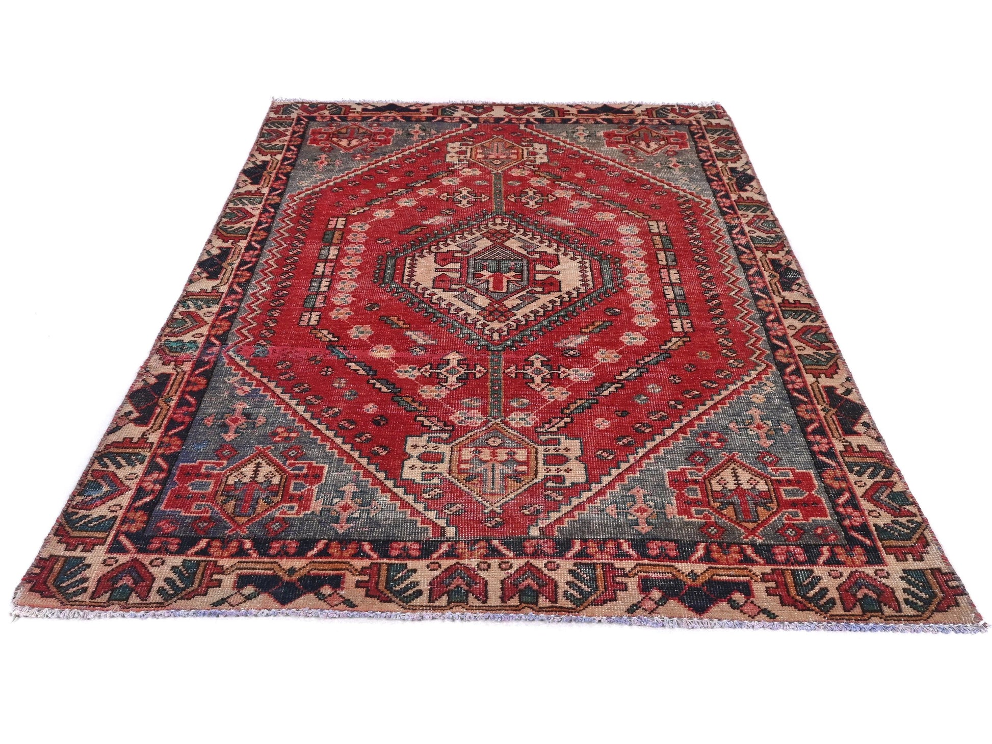 4x6 Handmade Turkish Vintage Tribal Rug | Red Hexagon Field With Sky Blue Triangles | Boho Rug, Anatolian Rug | SHR441 | From 1980