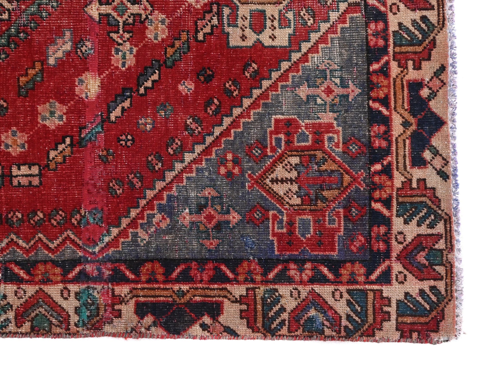 This antique Turkish tribal rug commands attention with its radiant red diamond field, wrapped in faded indigo corners and adorned with delicate floral medallions. The geometric centerpiece balances bold structure with worn charm, offering a rustic yet refined feel that elevates any interior with character.