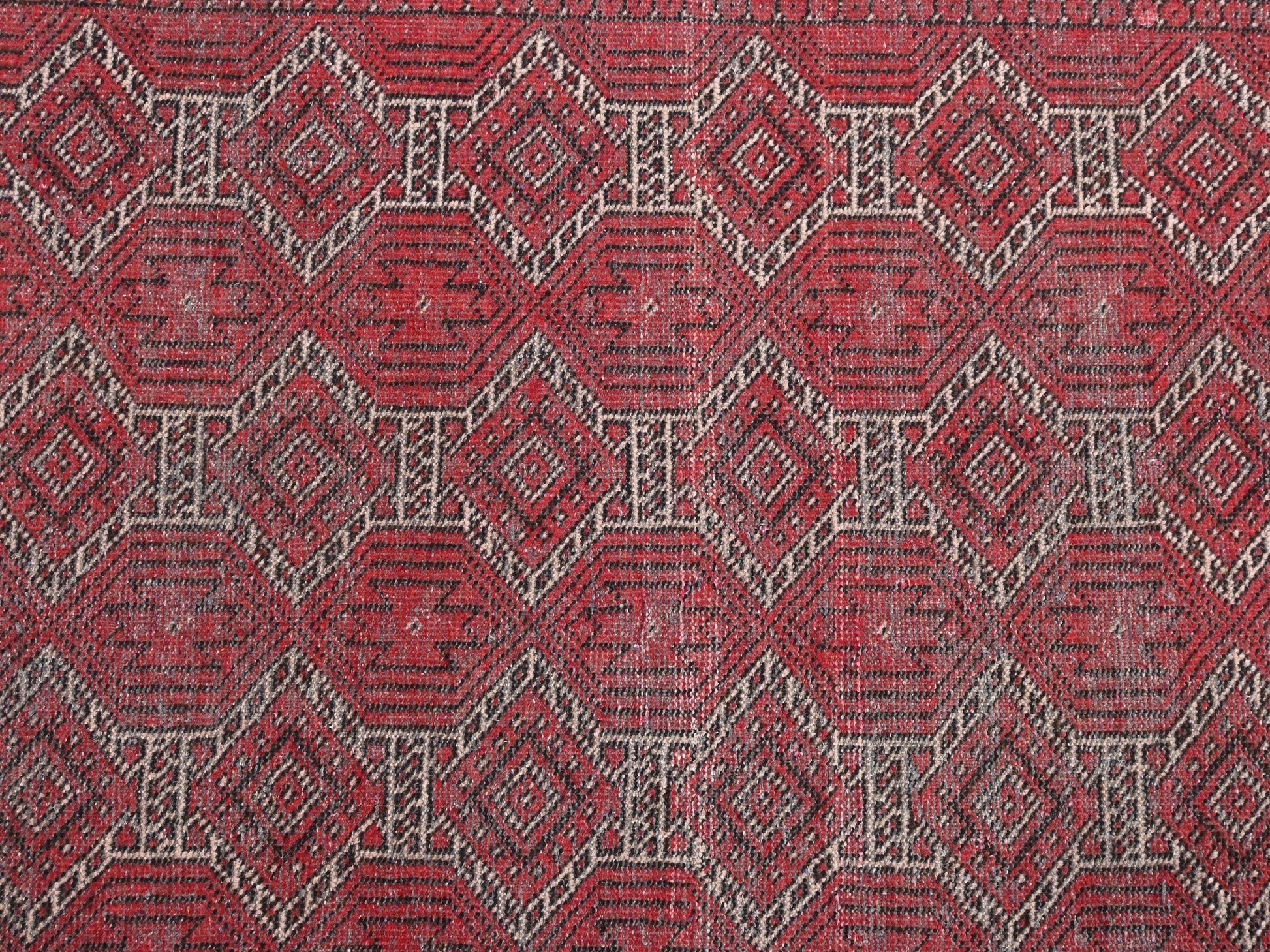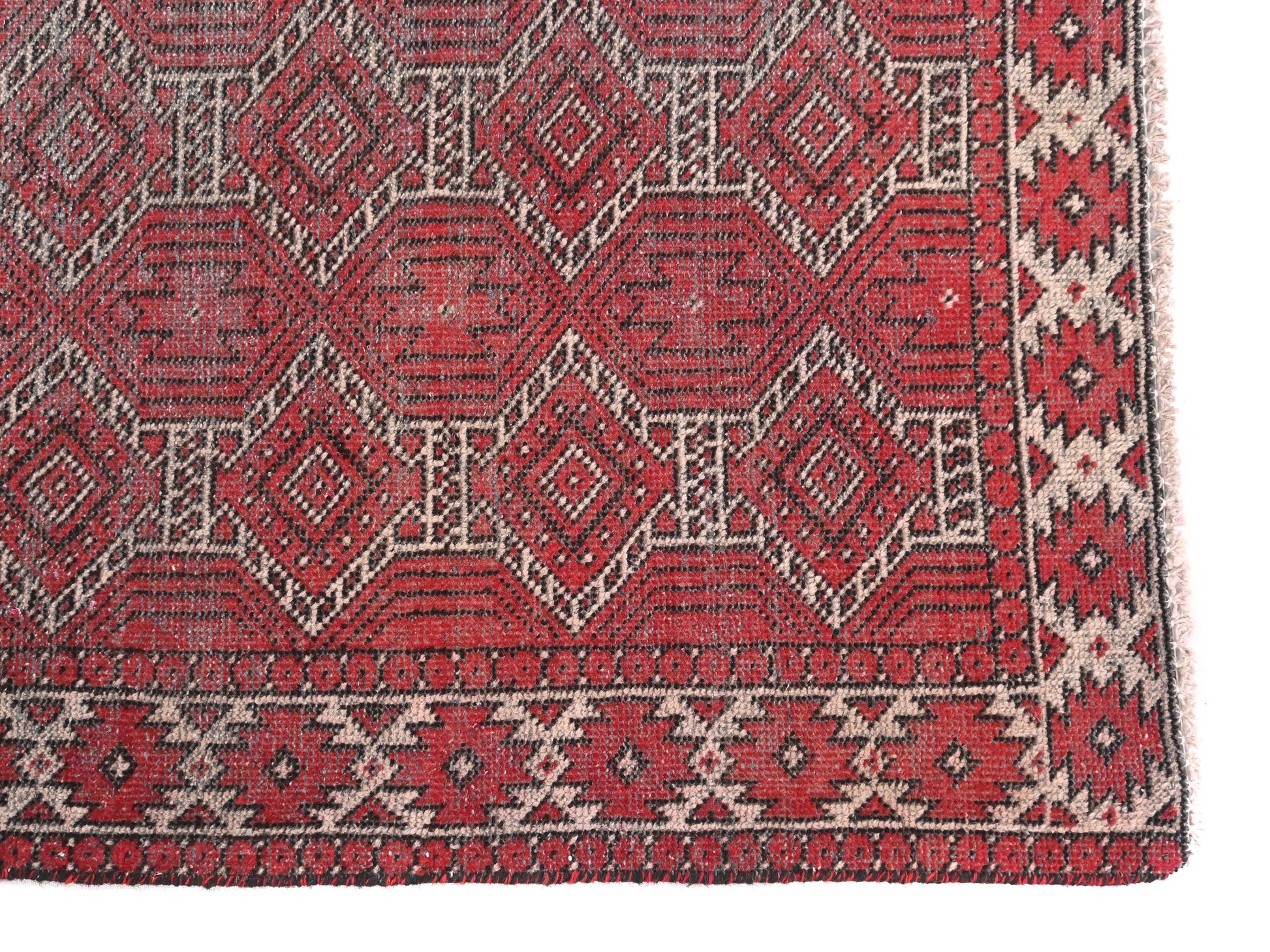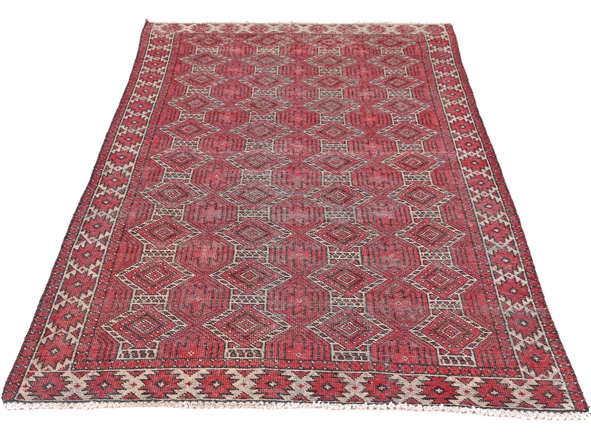 This 4x6 handmade Turkish vintage tribal rug is a captivating piece, adorned with a continuous cascade of diamond medallions set against a deep crimson backdrop, creating a sense of depth and luxury. The design is a tribute to the exquisite patterns typical of Anatolian heritage, with each medallion intricately woven to showcase a variety of traditional motifs.