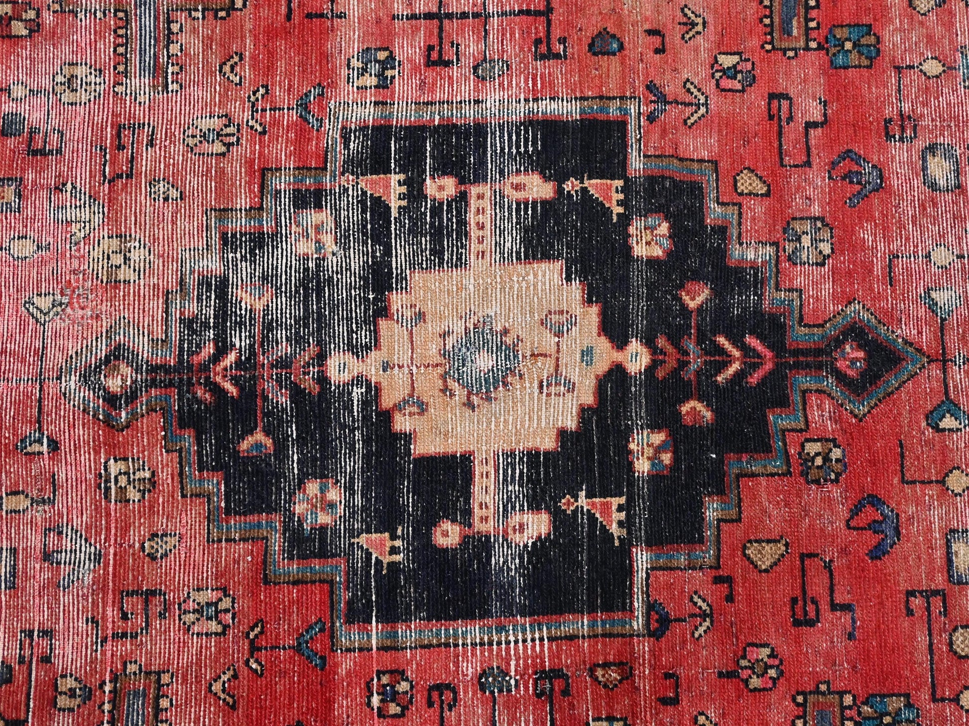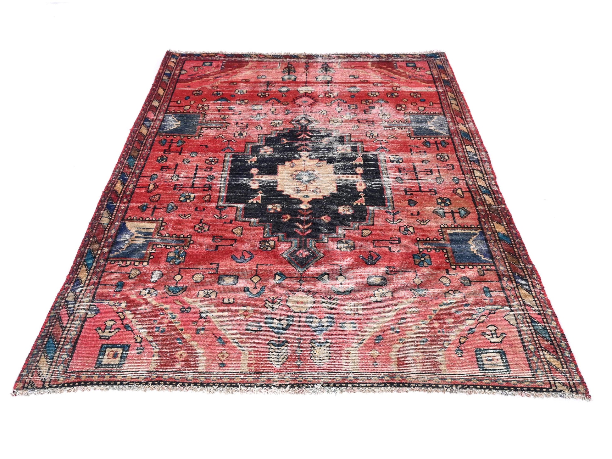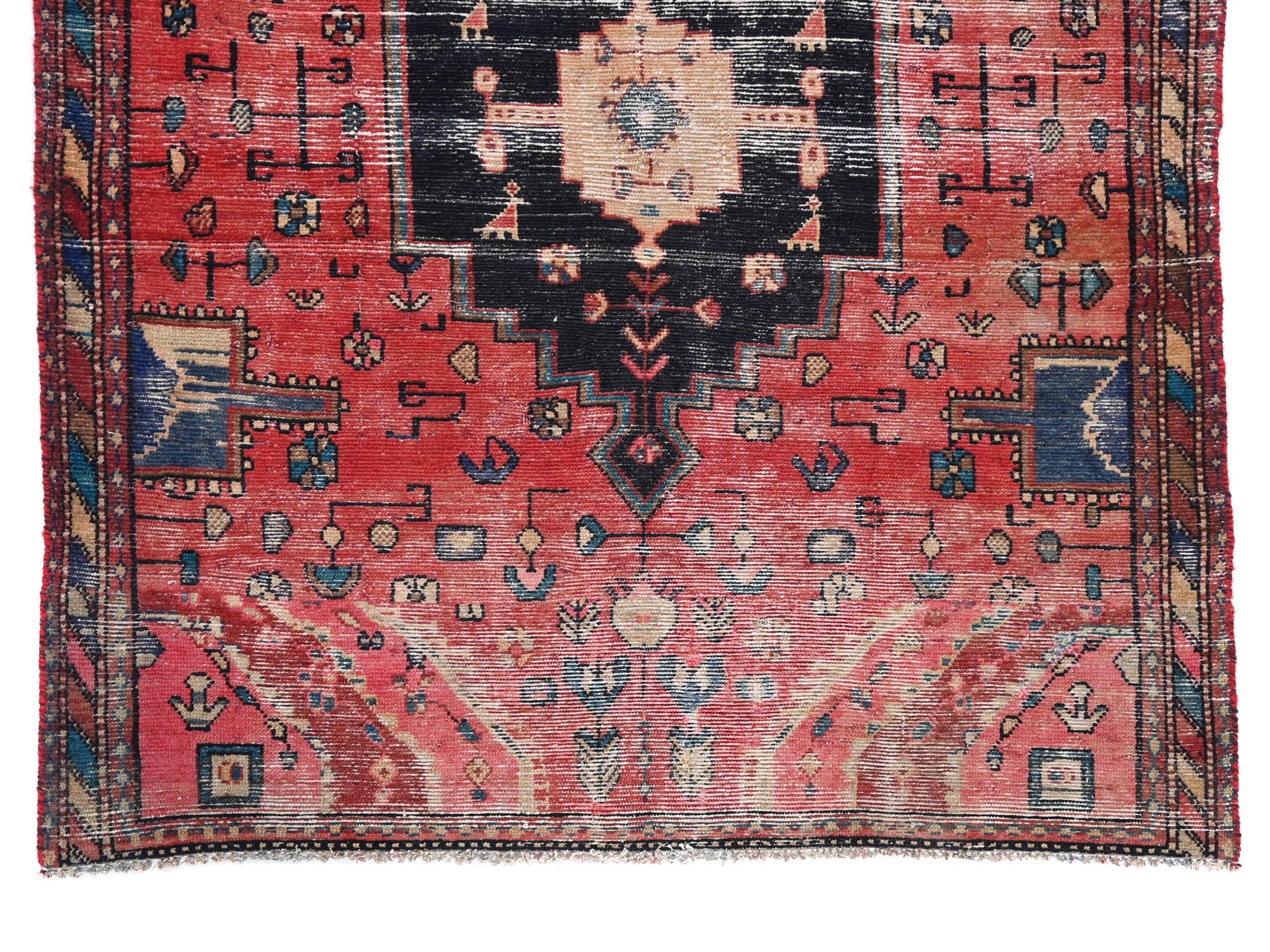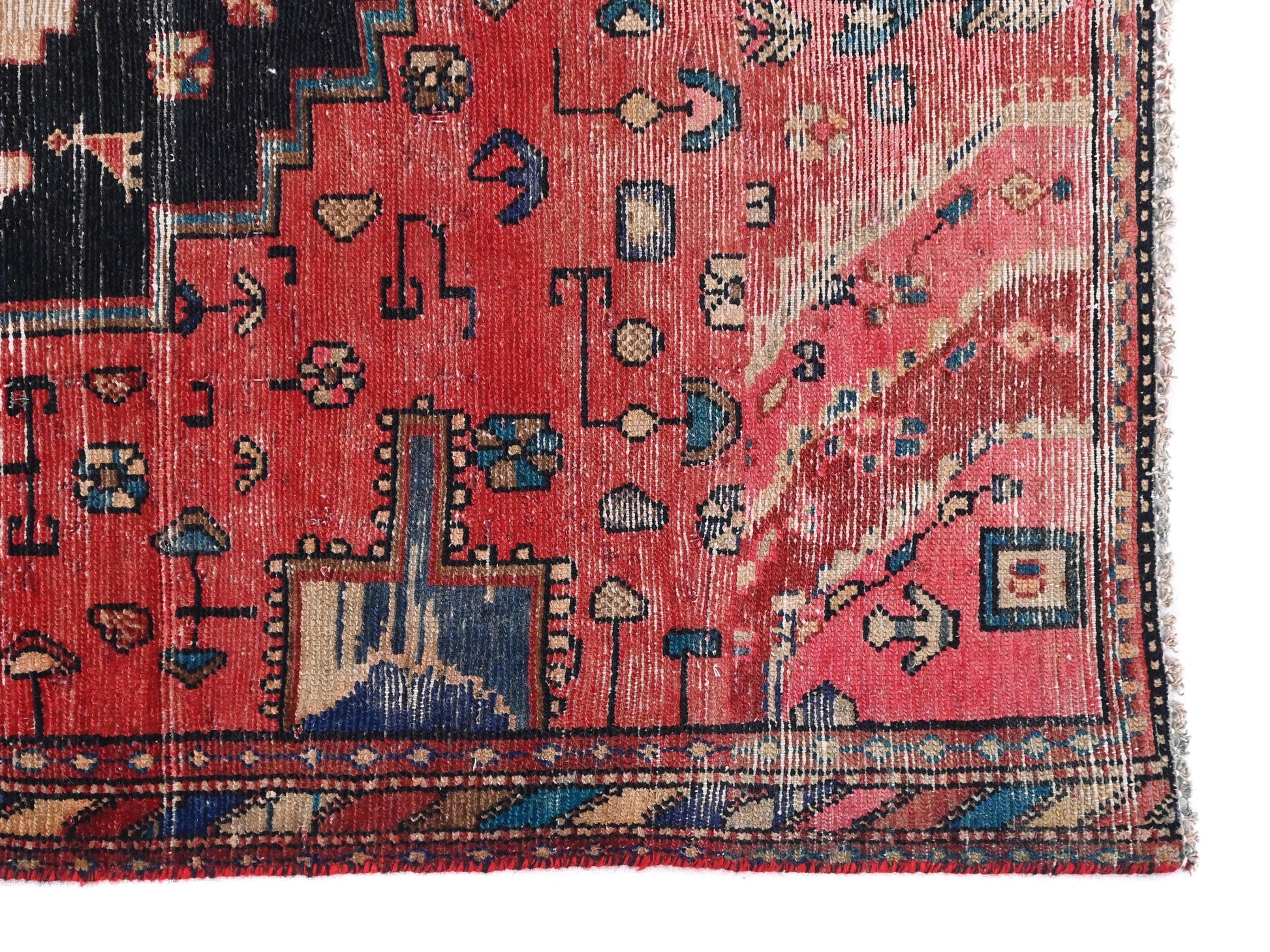 This handwoven rug tribal rug features a rare faded black central medallion seated within a rose-red field, balanced by rich indigo corners and cream-beige spandrels. The design elements are dotted with scattered tribal glyphs, floral motifs, and arrow-like abstractions, invoking protective symbols passed through generations. The sunbleached central field brings a charming contrast, revealing decades of gentle wear that add to its character.