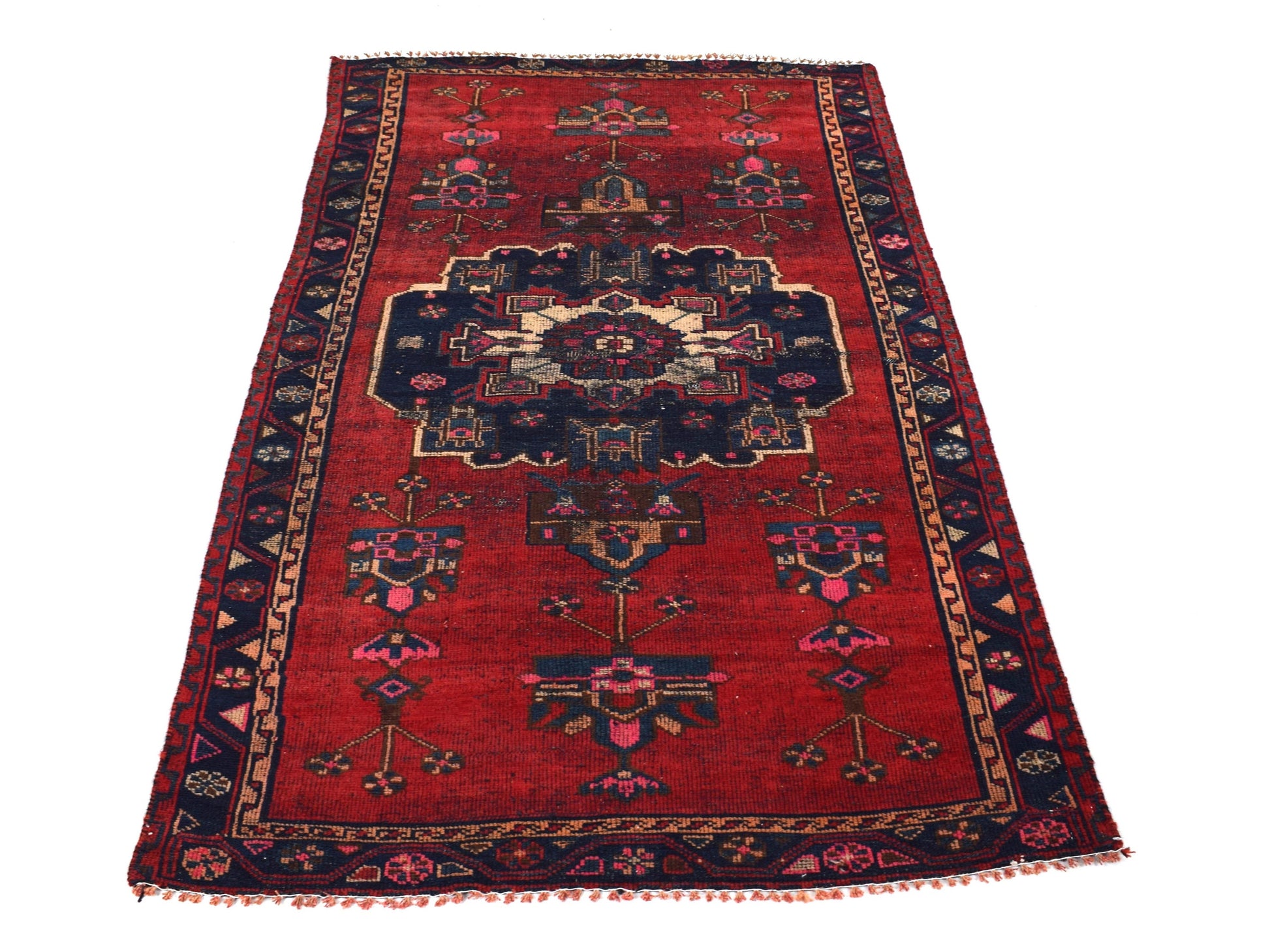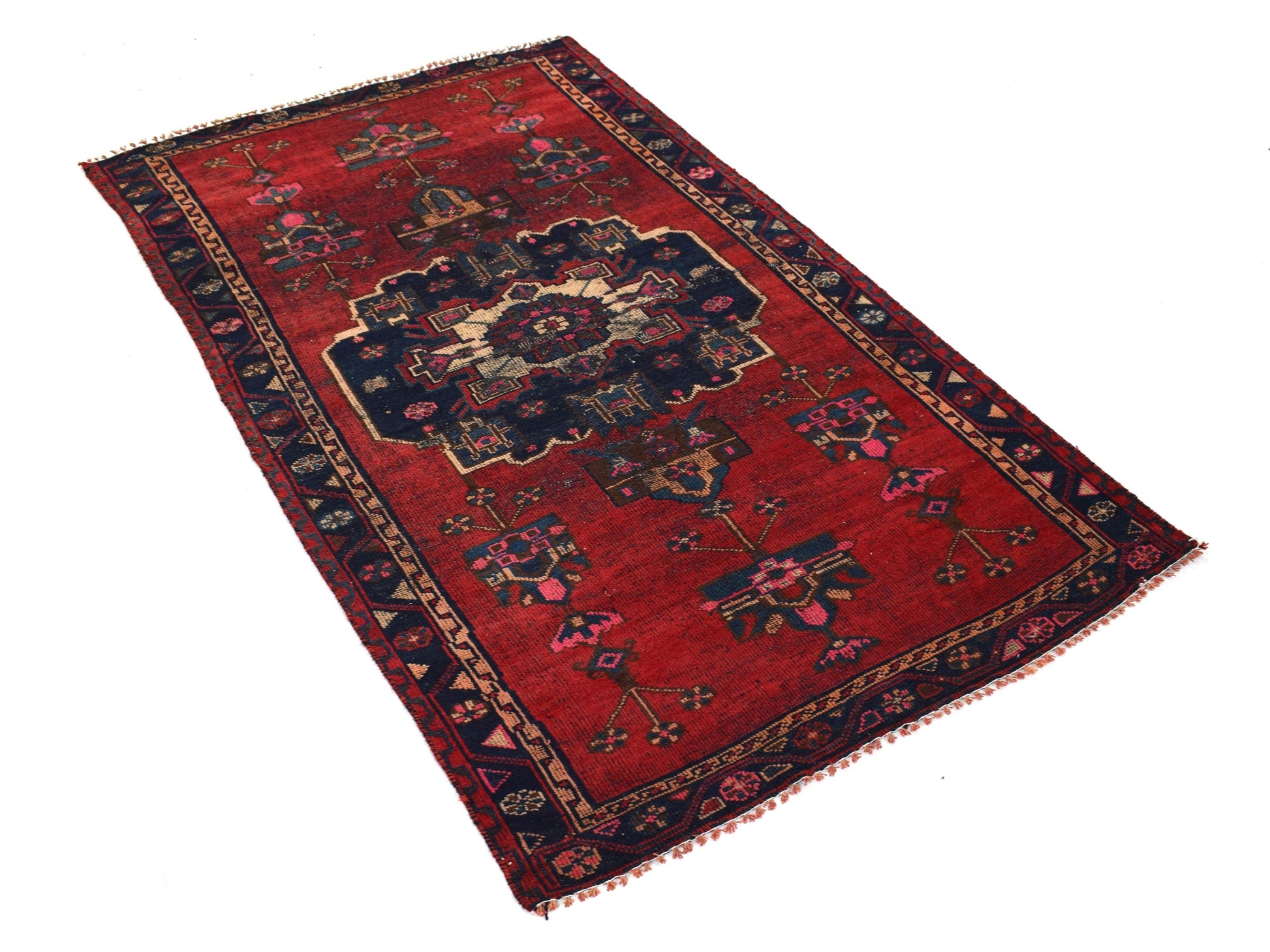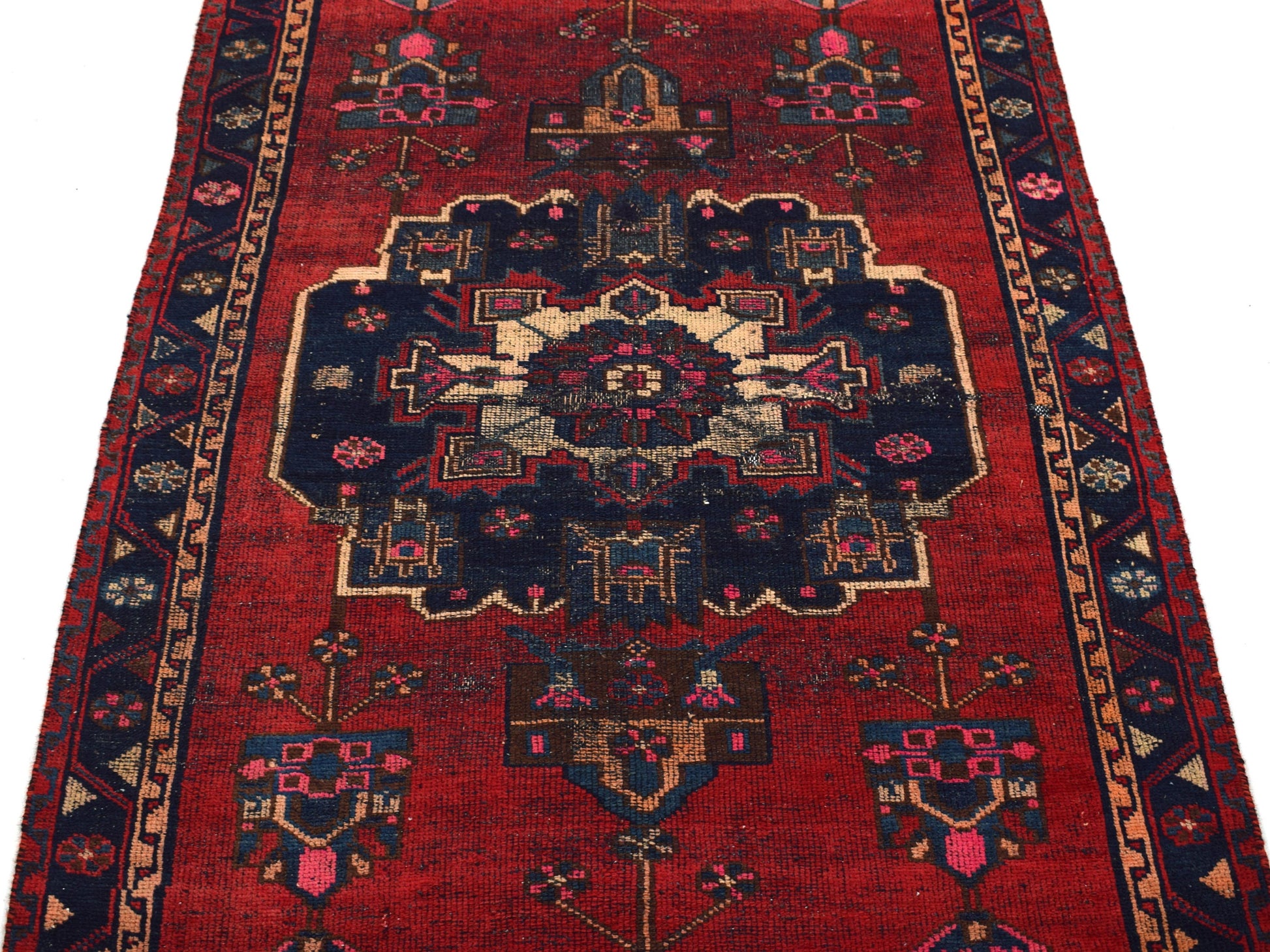The vintage rugs in our collection have a rich and deep color palette and feature the characteristic design of a central pole medallion interspersed with geometric patterns and symmetrical shapes. Across their borders are often smaller bands encompassing a larger band with palm and leaf designs. A common theme in these rugs is geometric floral motives in various colors.
