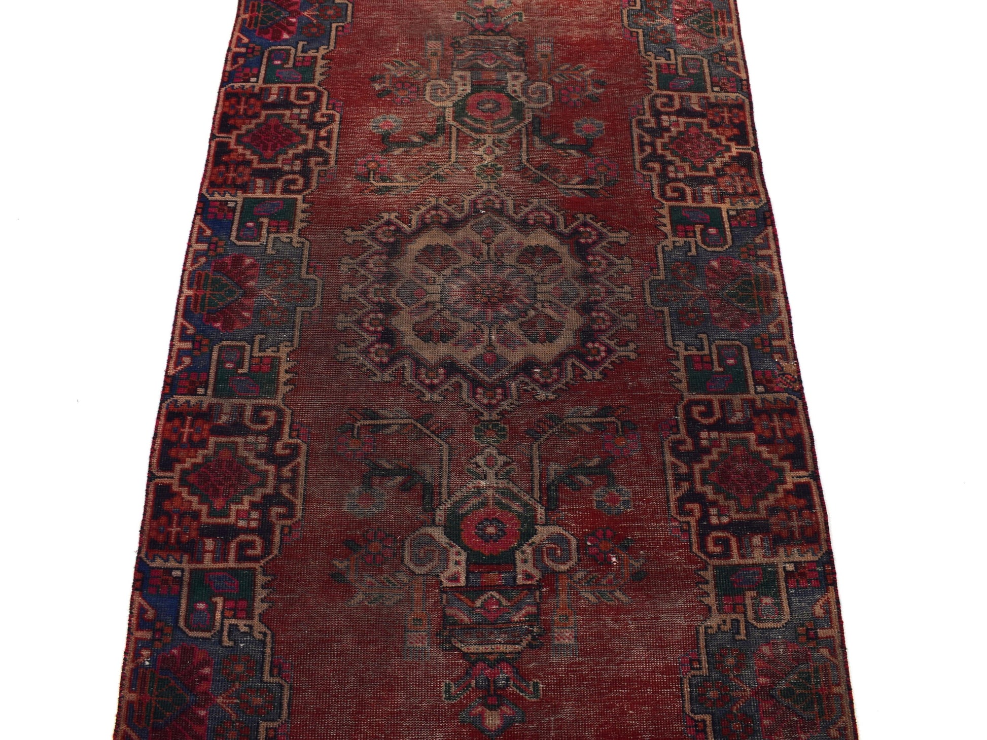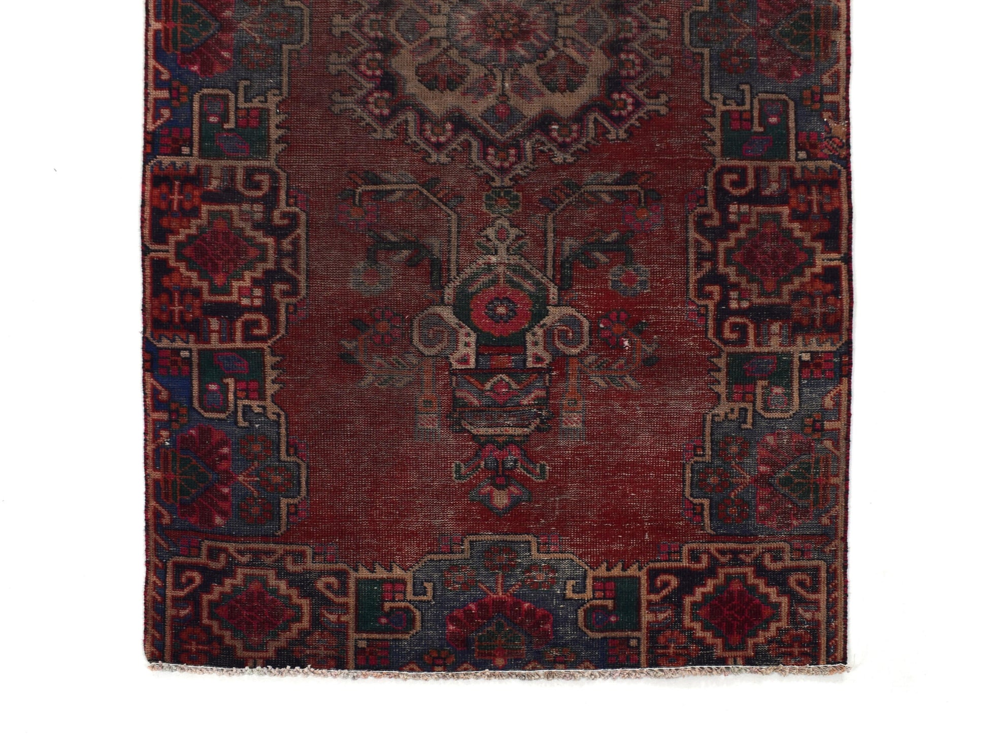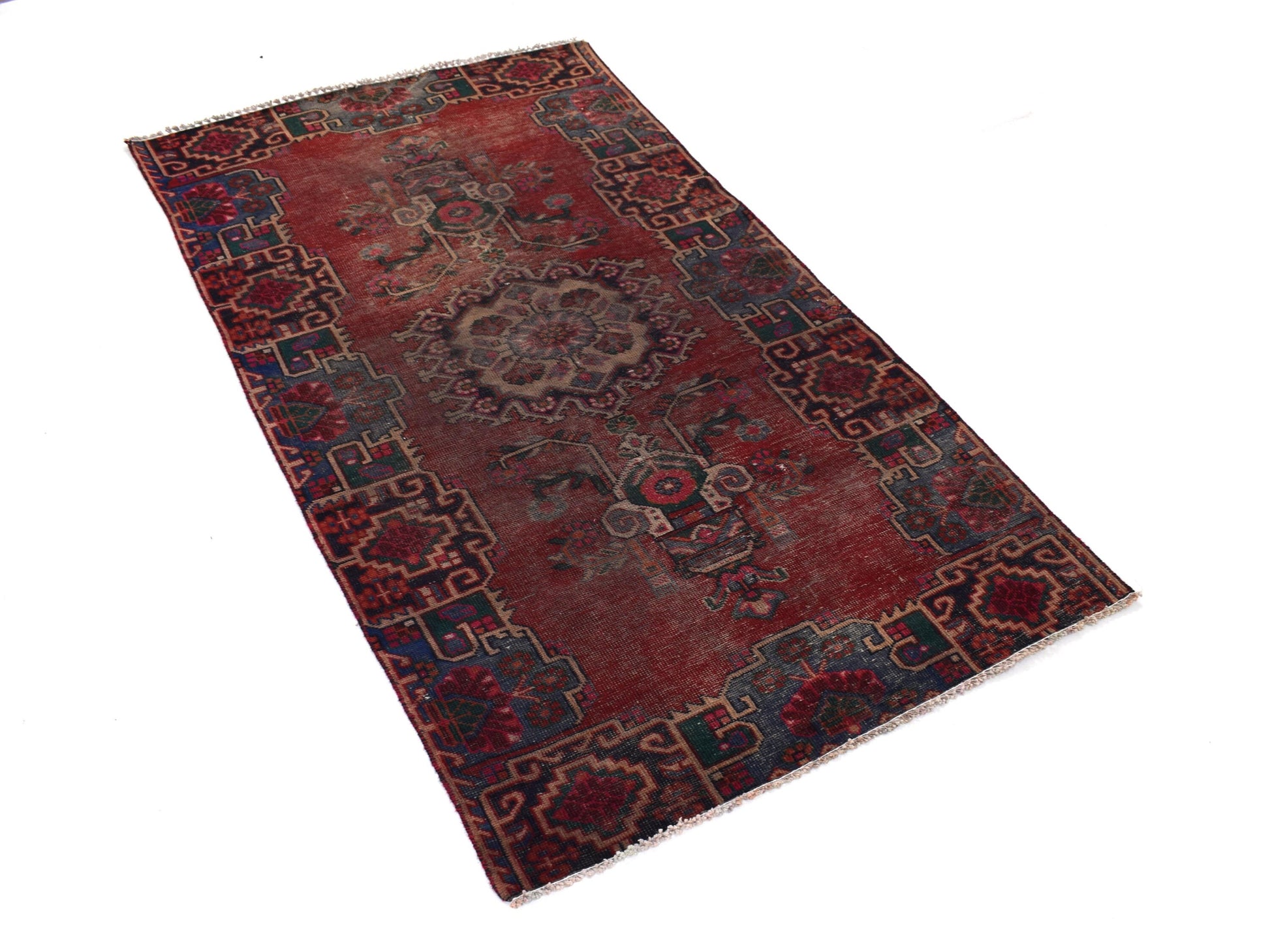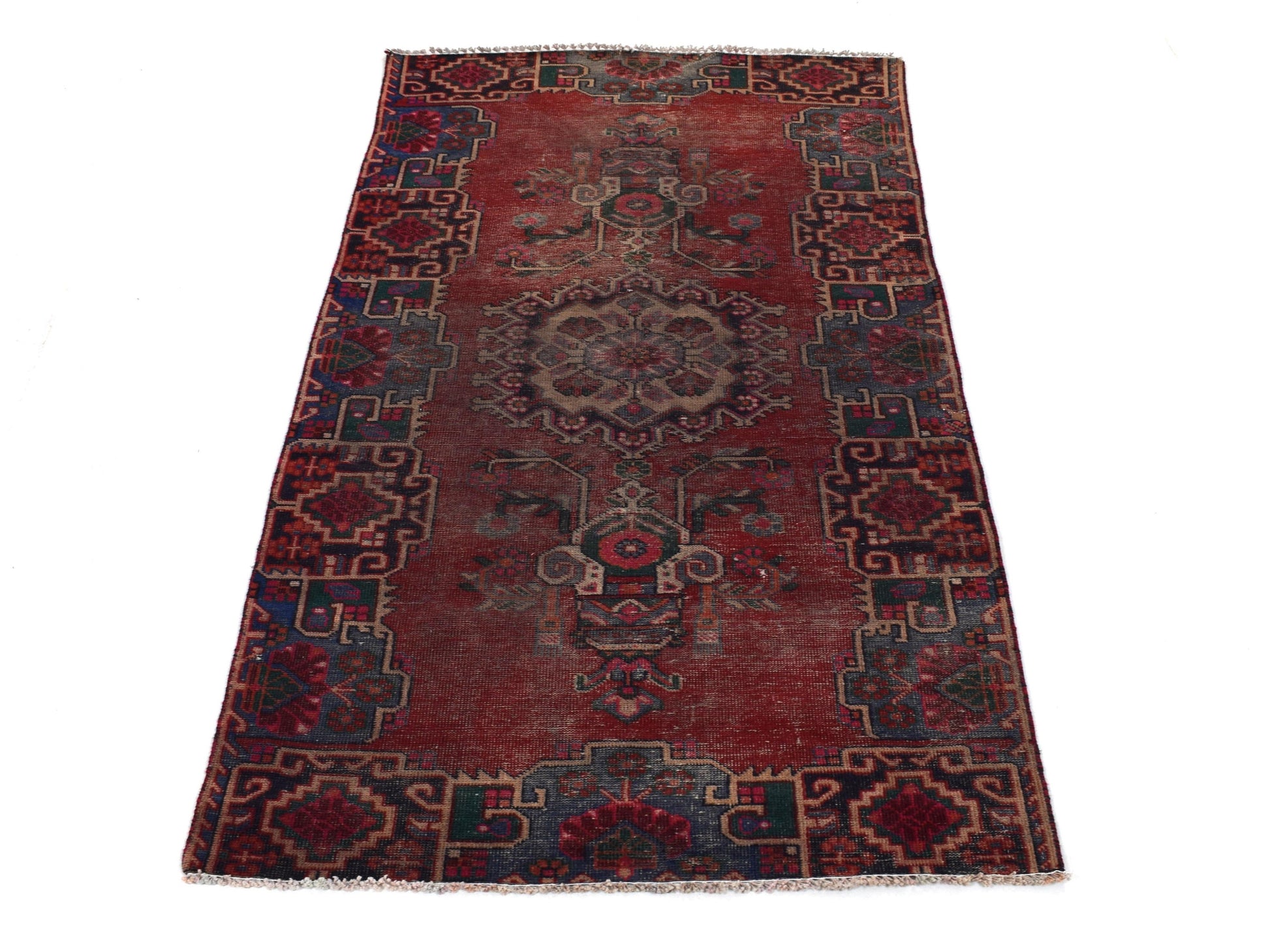 The vintage rugs in our collection have a rich and deep color palette and feature the characteristic design of a central pole medallion interspersed with geometric patterns and symmetrical shapes. Across their borders are often smaller bands encompassing a larger band with palm and leaf designs. A common theme in these rugs is geometric floral motives in various colors.