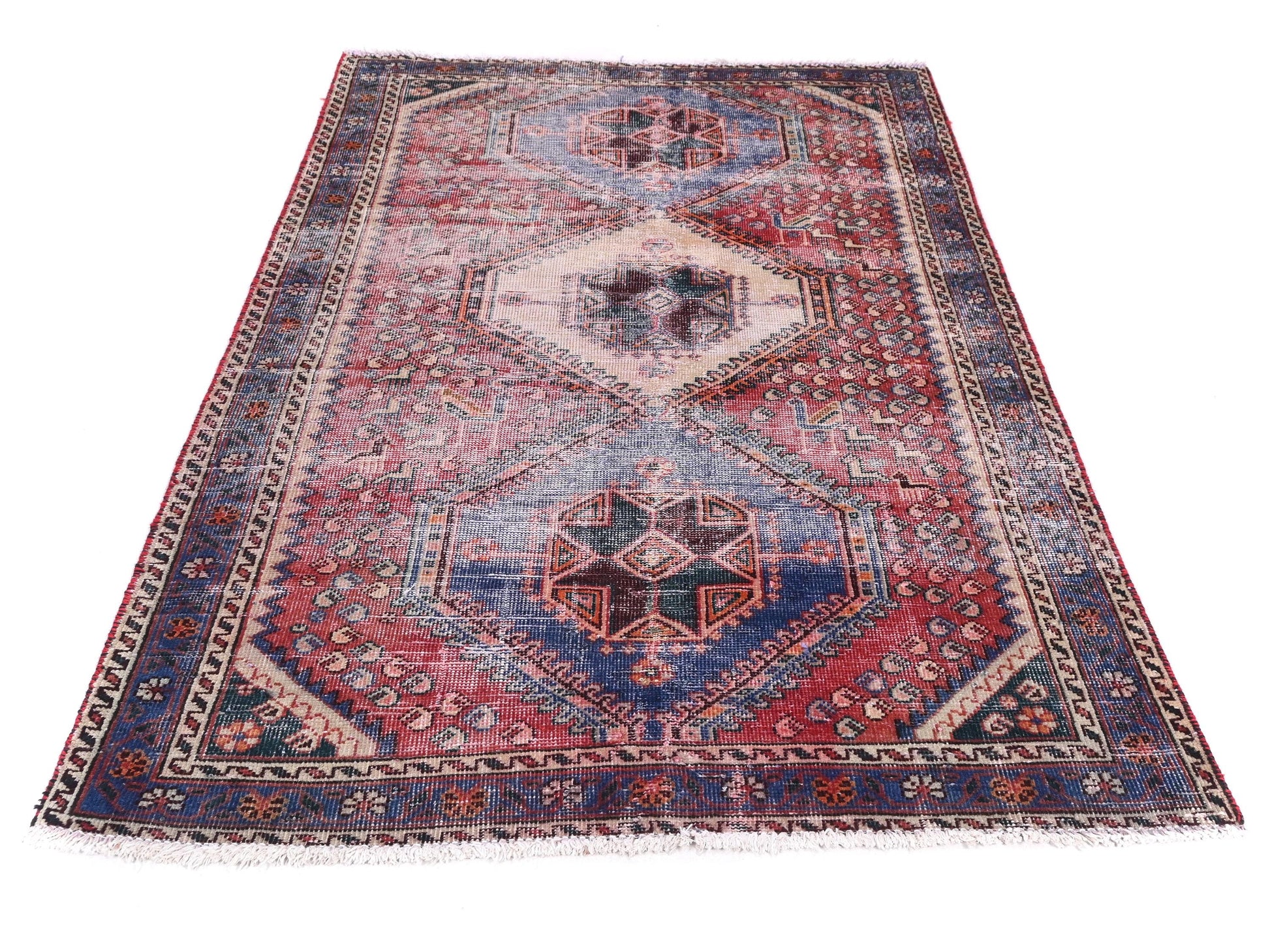 4x7 Handmade Turkish Vintage Tribal Rug | Azure Trio Petal Drop Hexagonal Field | Boho Rug, Antique Anatolian Rug | SHR470 | From 1970