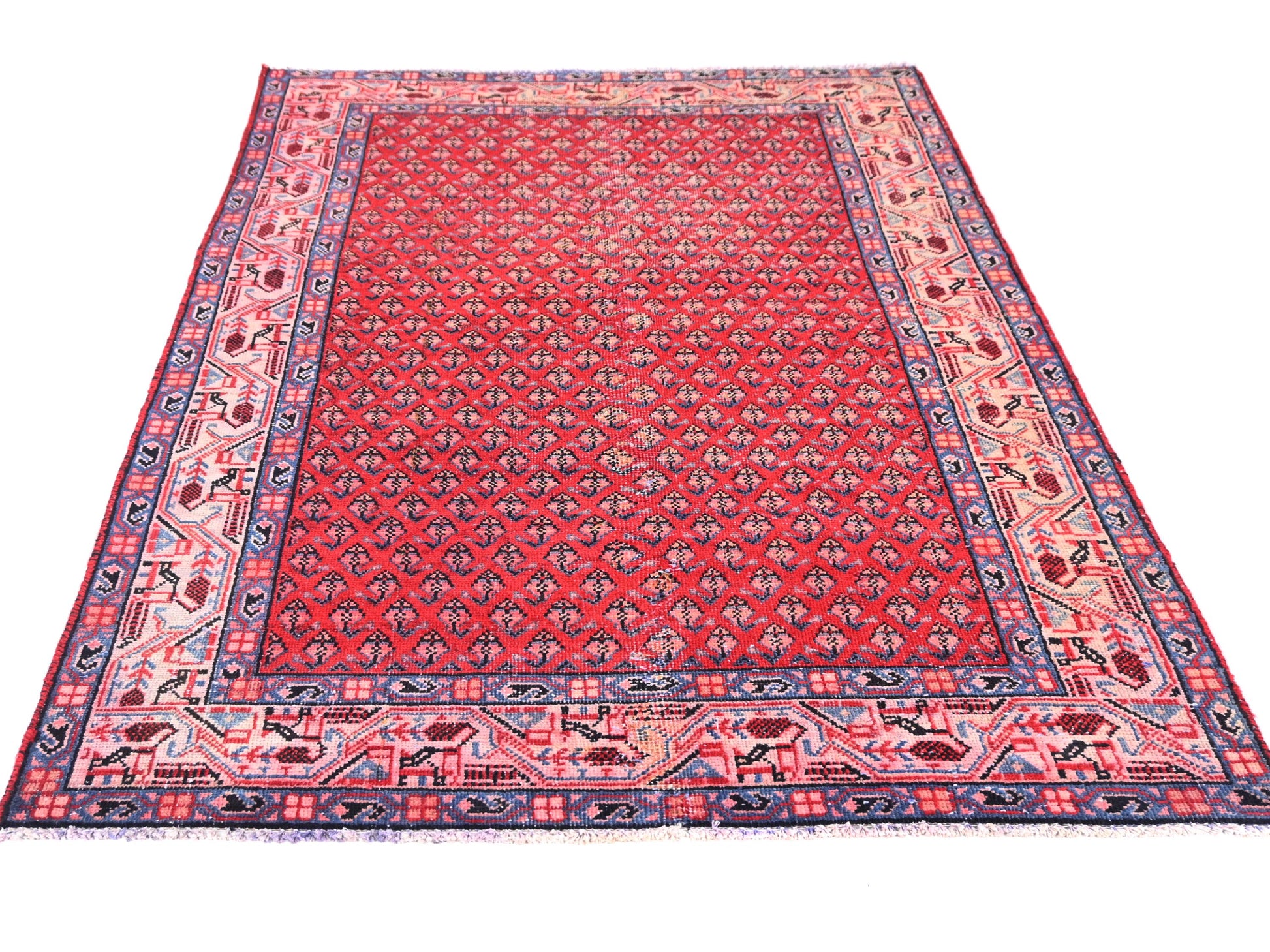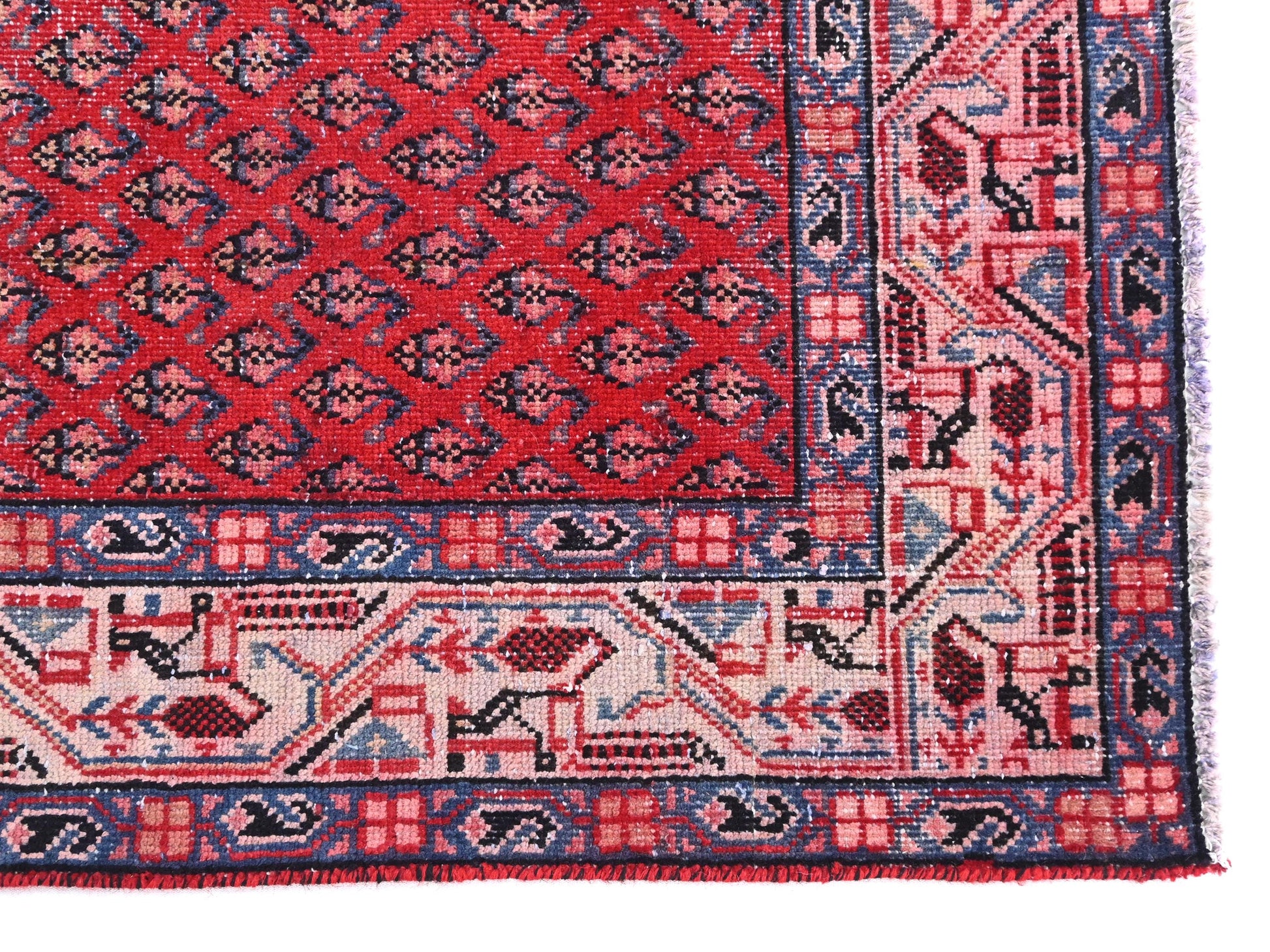 A rare example of Anatolian finesse, this tribal rug features a rhythmic arrangement of repeating geometric boteh motifs across a deep ruby-red field. Framed by a striking border of stylized deer and floral emblems, this piece evokes nature, folklore, and balance in every inch.