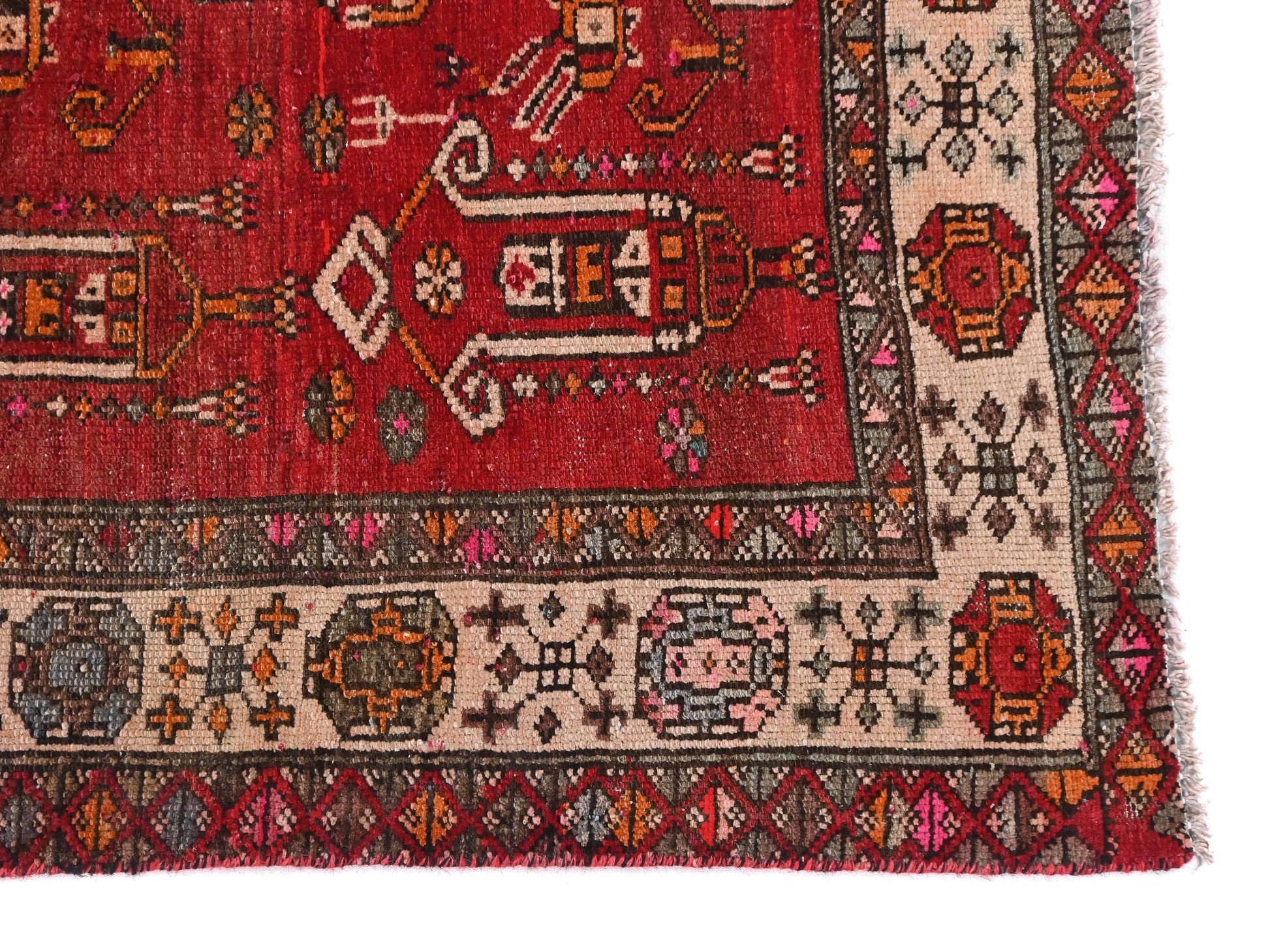 This handwoven Turkish rug rug carries a unique spiritual energy with its mirrored altar-style medallions and tree-of-life inspired motifs, contrasted against a weathered crimson field and ivory border. The blend of soft pastels and deep reds evokes a ceremonial elegance, giving it a rare and meaningful vintage presence.