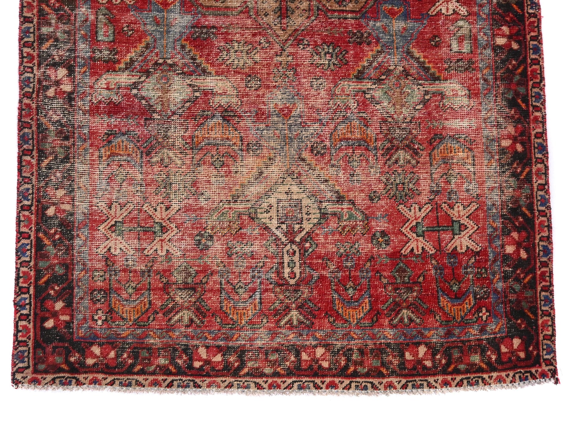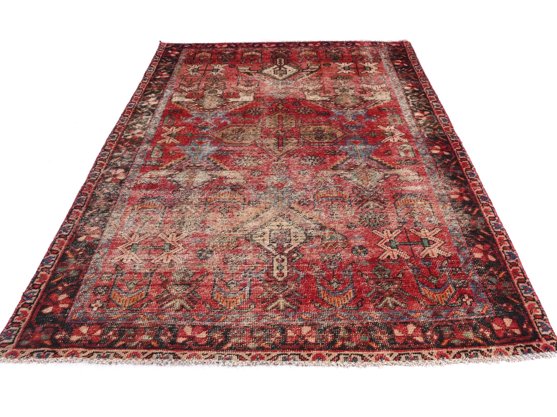 This rare 4x7 Turkish vintage tribal rug, dated to 1980, presents a stunning tapestry of stylized botanical motifs in a bold rust red field, grounded by deeply aged black, sky blue, and earthy green flourishes. Four crowned medallions anchor the corners while a central floral medallion blooms outward, inviting the eye to dance along its geometric precision and folklore-inspired structure.