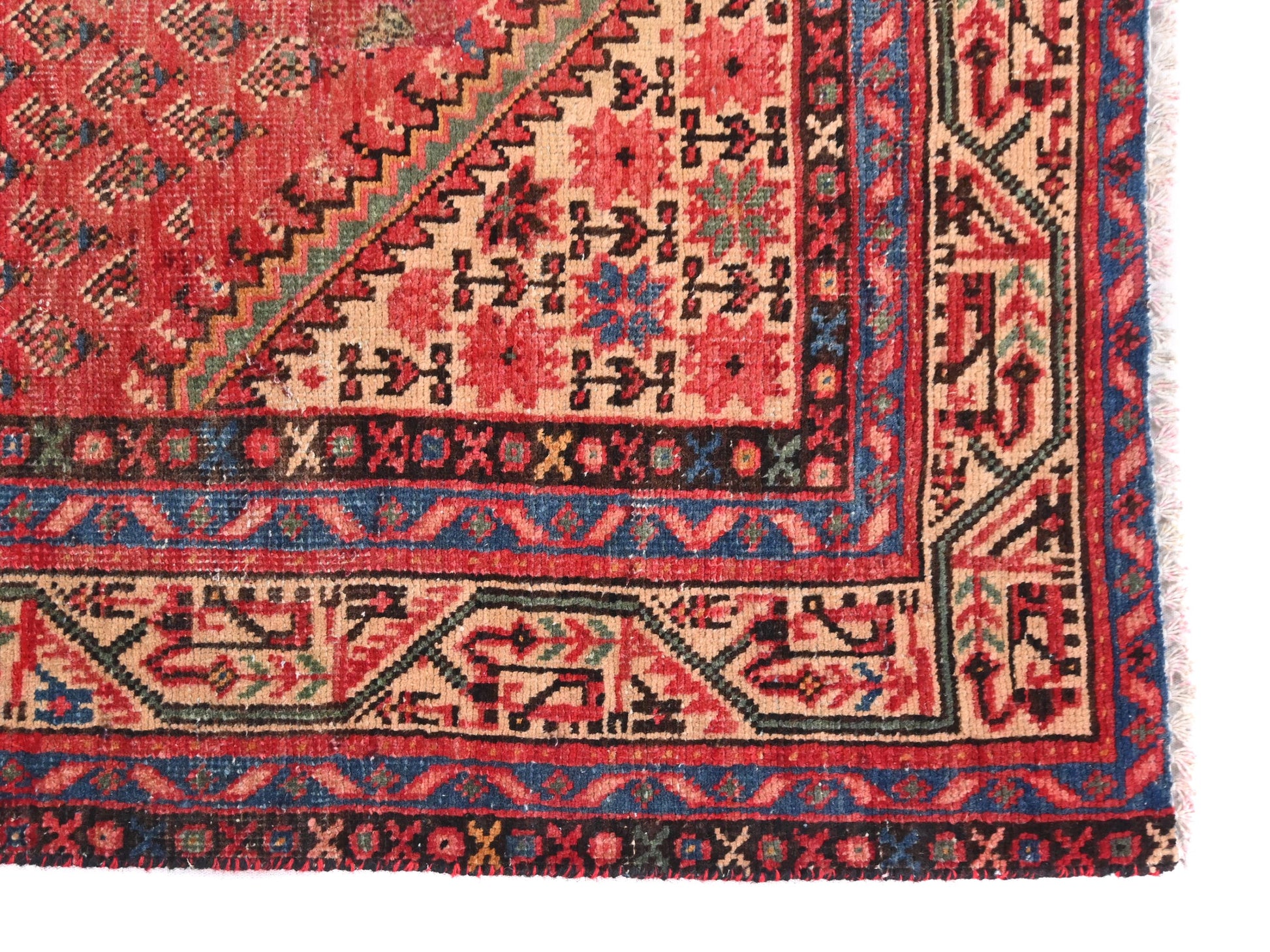 Red patterned rug with intricate designs on a white background