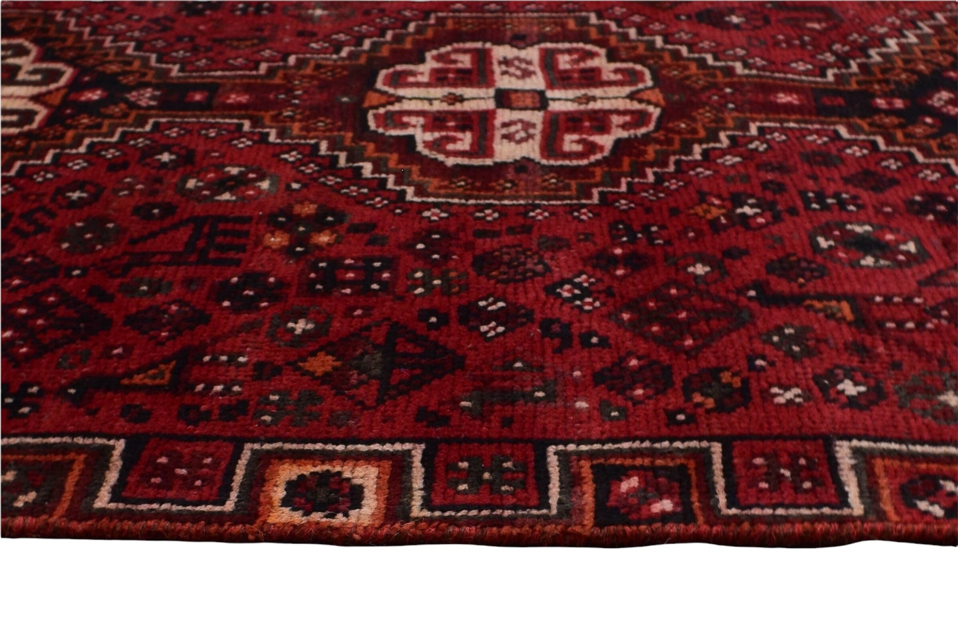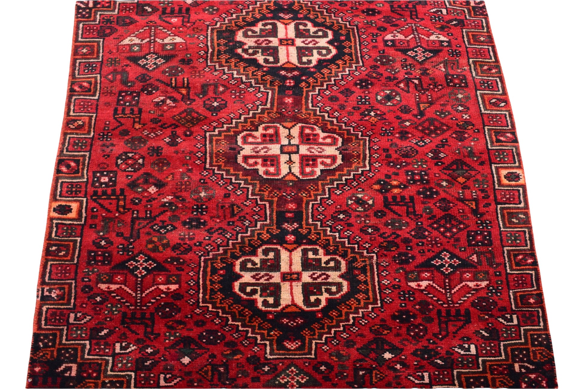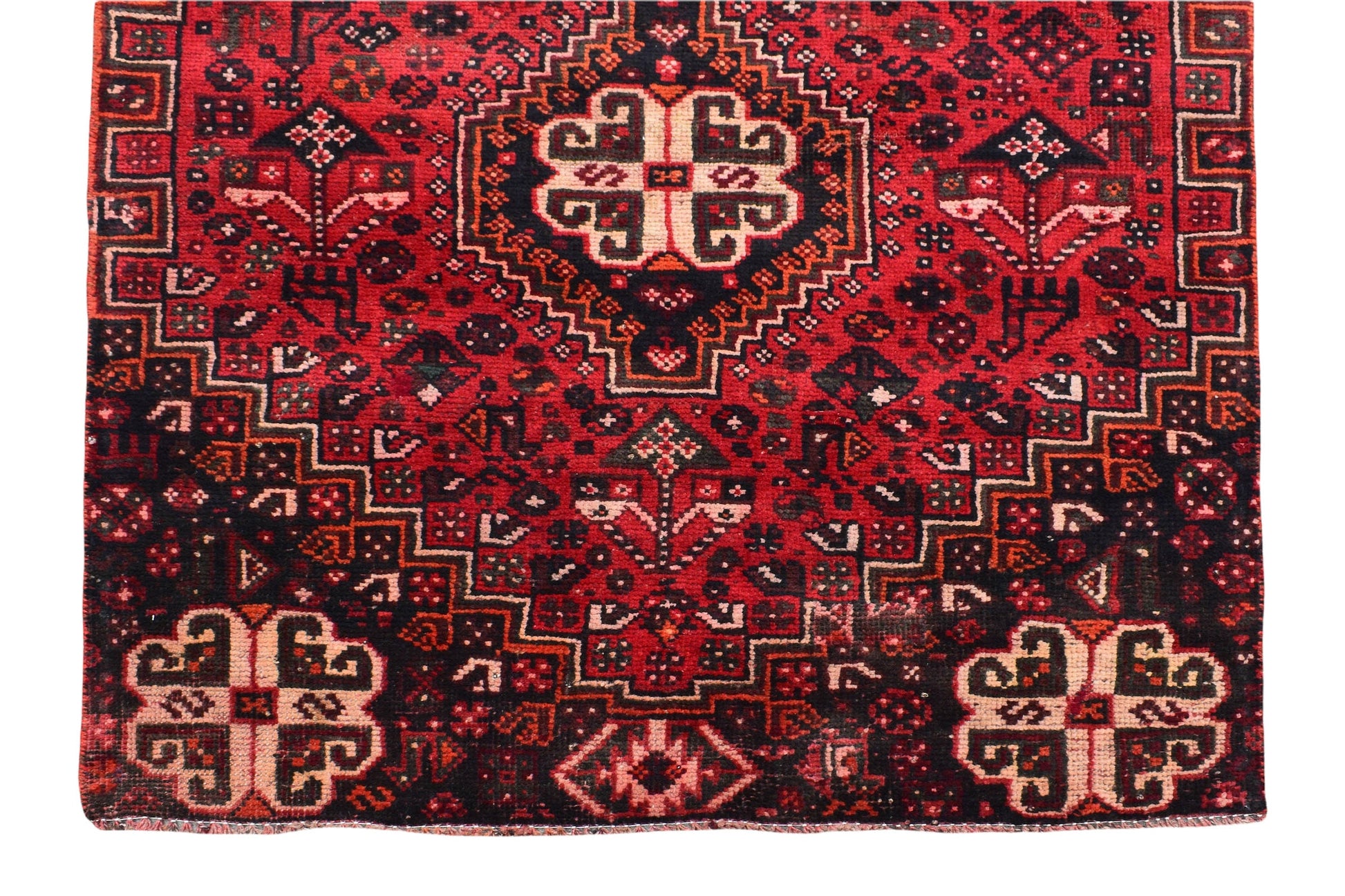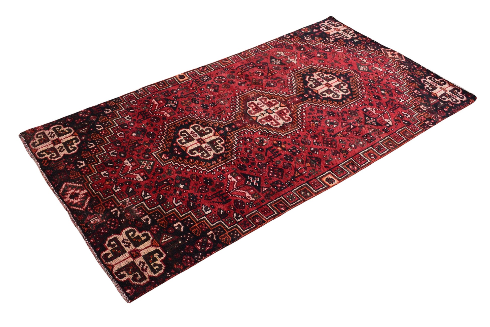 The vintage rugs in our collection have a rich and deep color palette and feature the characteristic design of a central pole medallion interspersed with geometric patterns and symmetrical shapes. Across their borders are often smaller bands encompassing a larger band with palm and leaf designs. A common theme in these rugs is geometric floral motives in various colors.