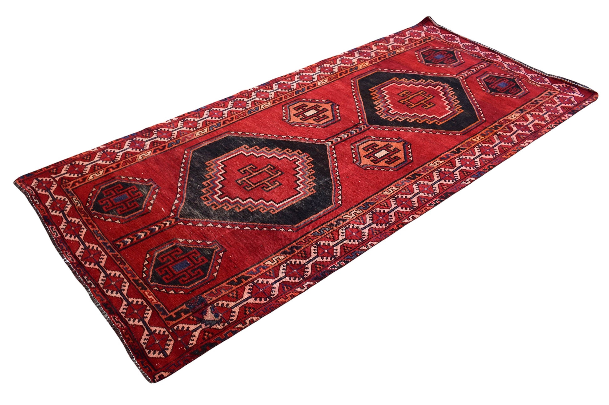 The vintage rugs in our collection have a rich and deep color palette and feature the characteristic design of a central pole medallion interspersed with geometric patterns and symmetrical shapes. Across their borders are often smaller bands encompassing a larger band with palm and leaf designs. A common theme in these rugs is geometric floral motives in various colors.