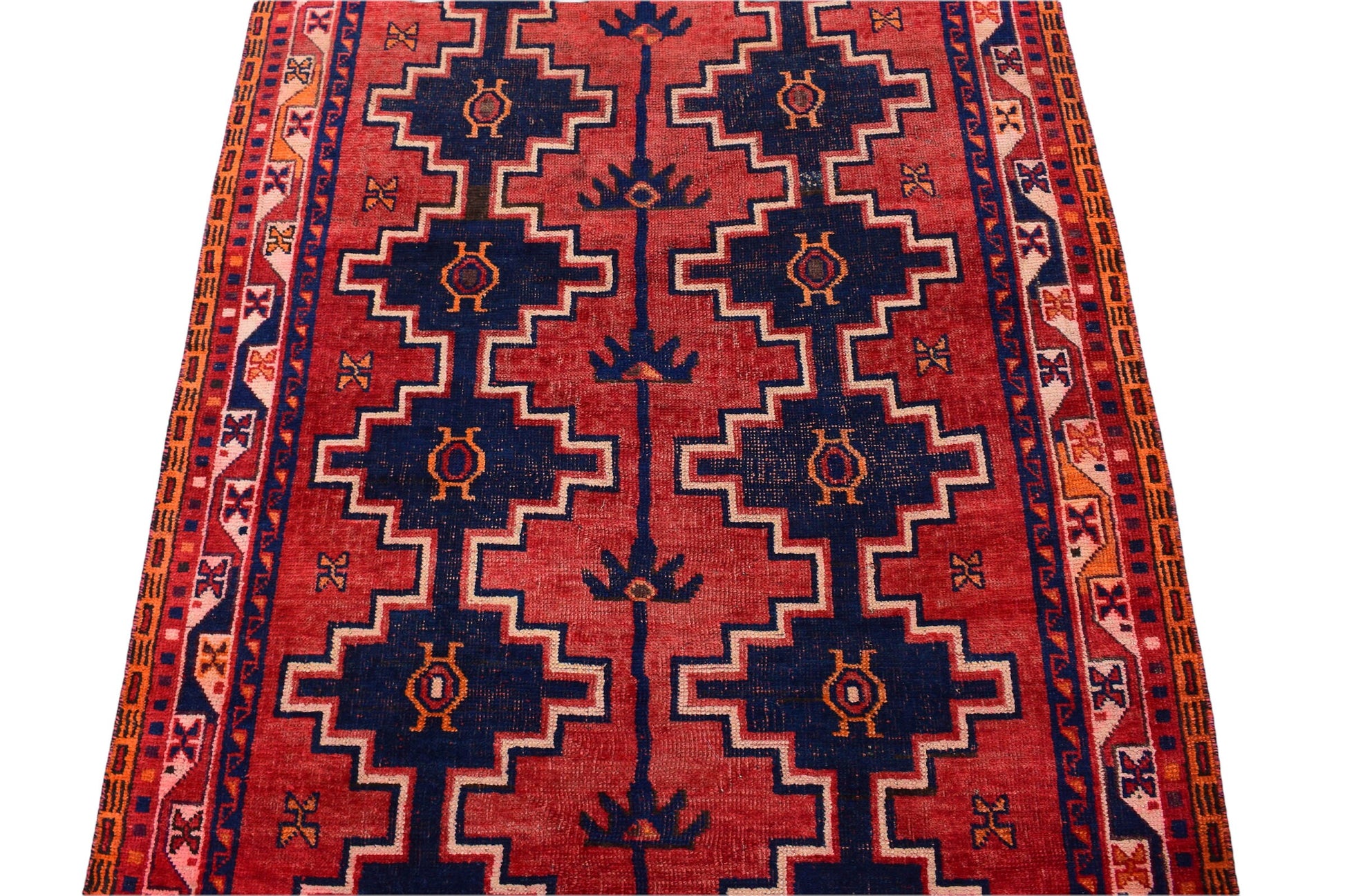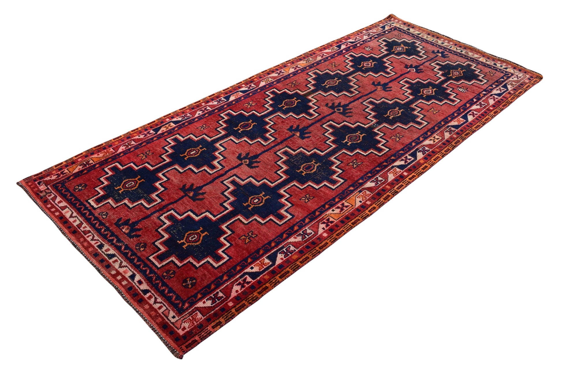 The vintage rugs in our collection have a rich and deep color palette and feature the characteristic design of a central pole medallion interspersed with geometric patterns and symmetrical shapes. Across their borders are often smaller bands encompassing a larger band with palm and leaf designs. A common theme in these rugs is geometric floral motives in various colors.