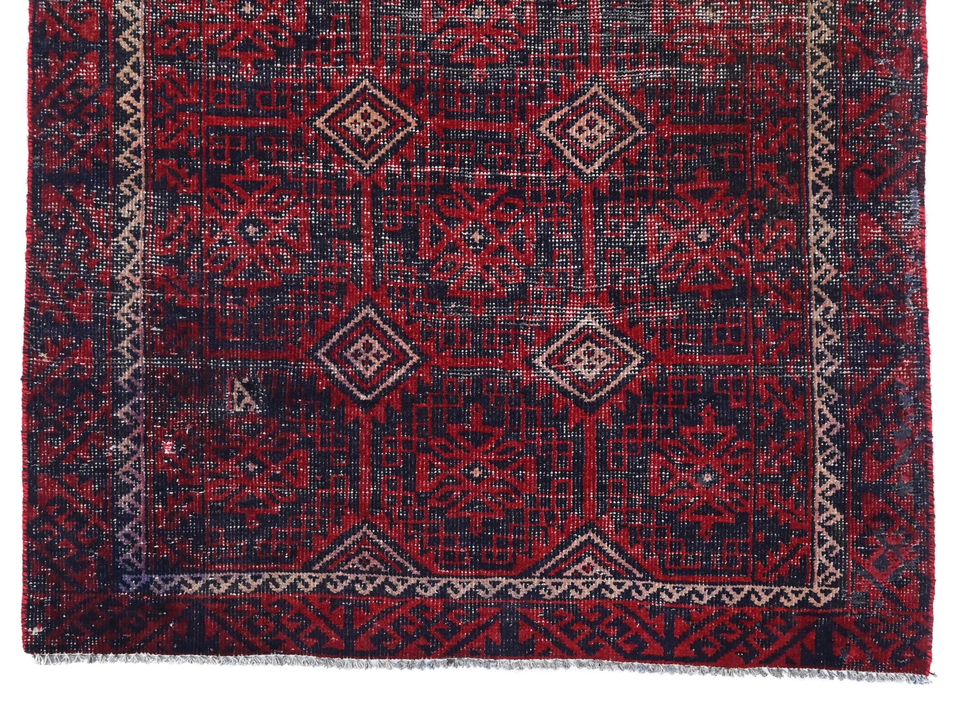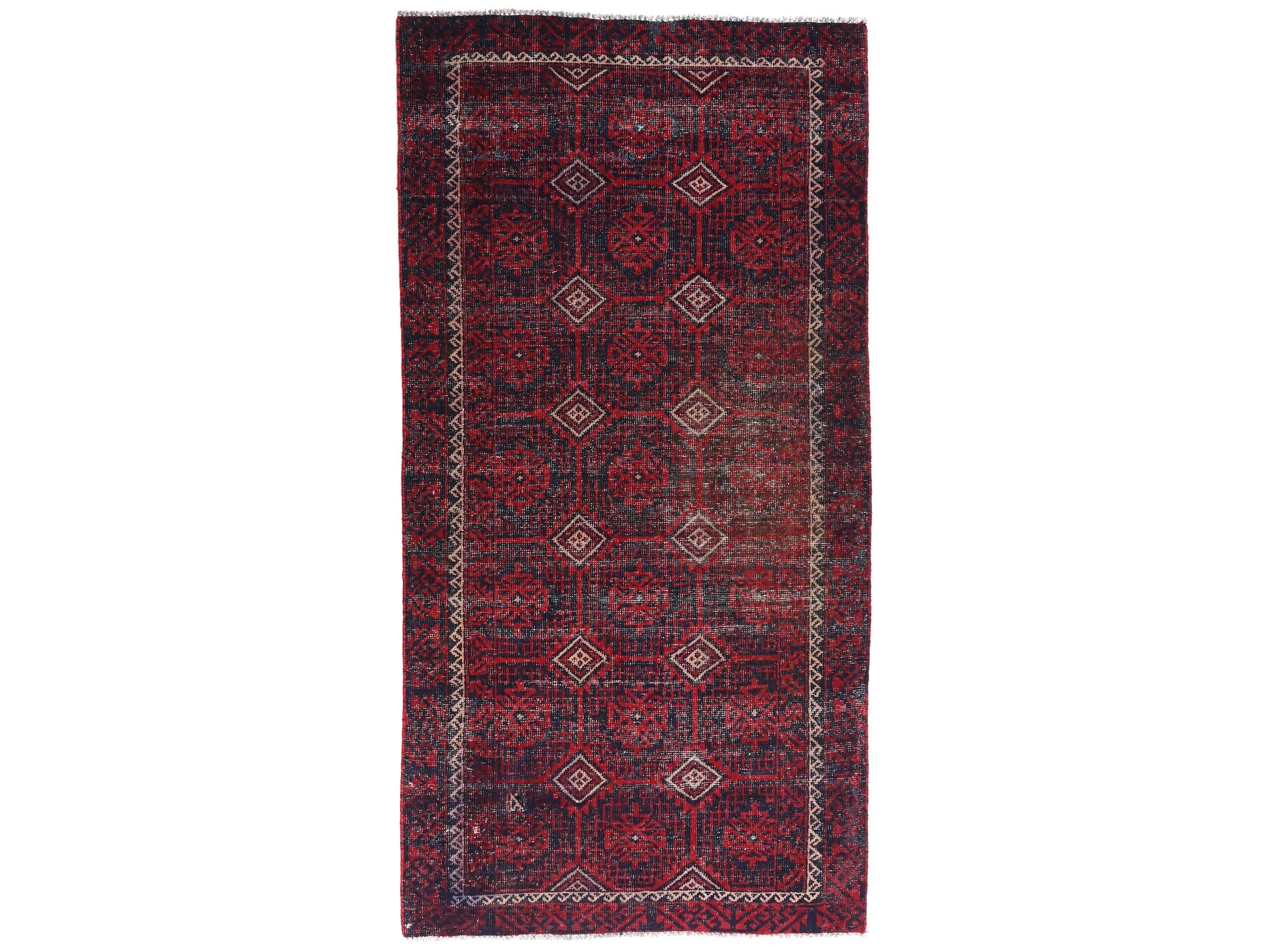 This 4x9 handmade Turkish vintage rug from 1980 features a richly saturated navy base layered with symmetrical red floral medallions, creating a mesmerizing grid of pattern and depth. Framed by an ivory zigzag border and flanked with a geometric crimson frame, the rug captures both energy and balance in its detailed structure. The repeating diamond medallions lend a rhythmic elegance while enhancing the visual harmony across its length.