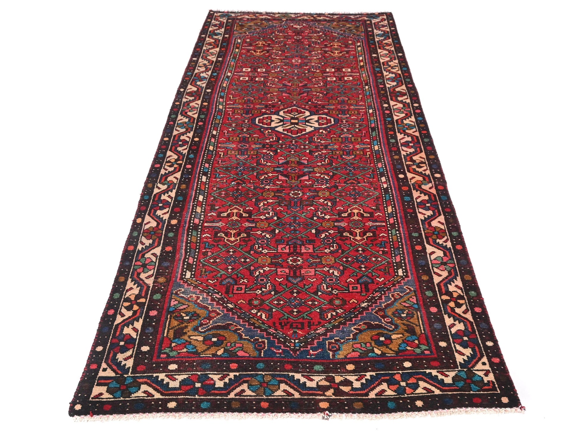 This 4x9 handmade Turkish vintage rug from 1980 features a visually rich red field, layered with an intricate network of micro-florals and anchored by a striking ivory emblem at the center. The midnight blue and cream borders wrap around the design like a frame, enhancing its symmetrical beauty. With 12 knots per square inch, this rug reflects the kind of master craftsmanship that makes Anatolian weaving so revered.