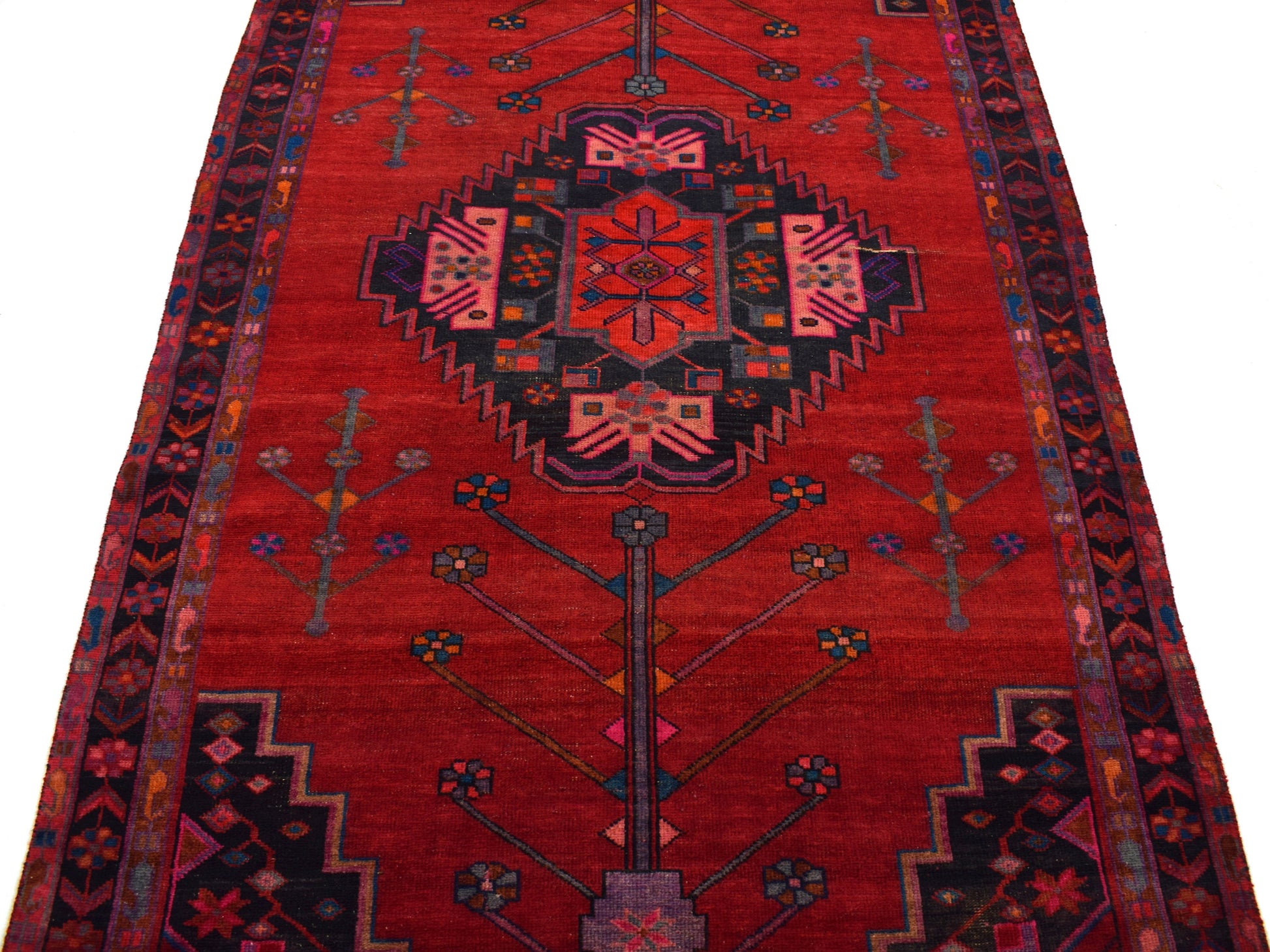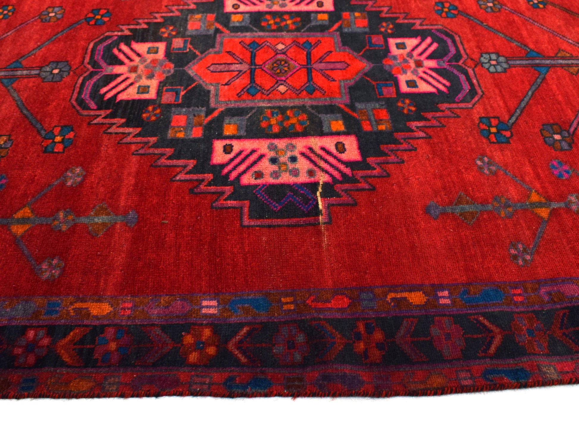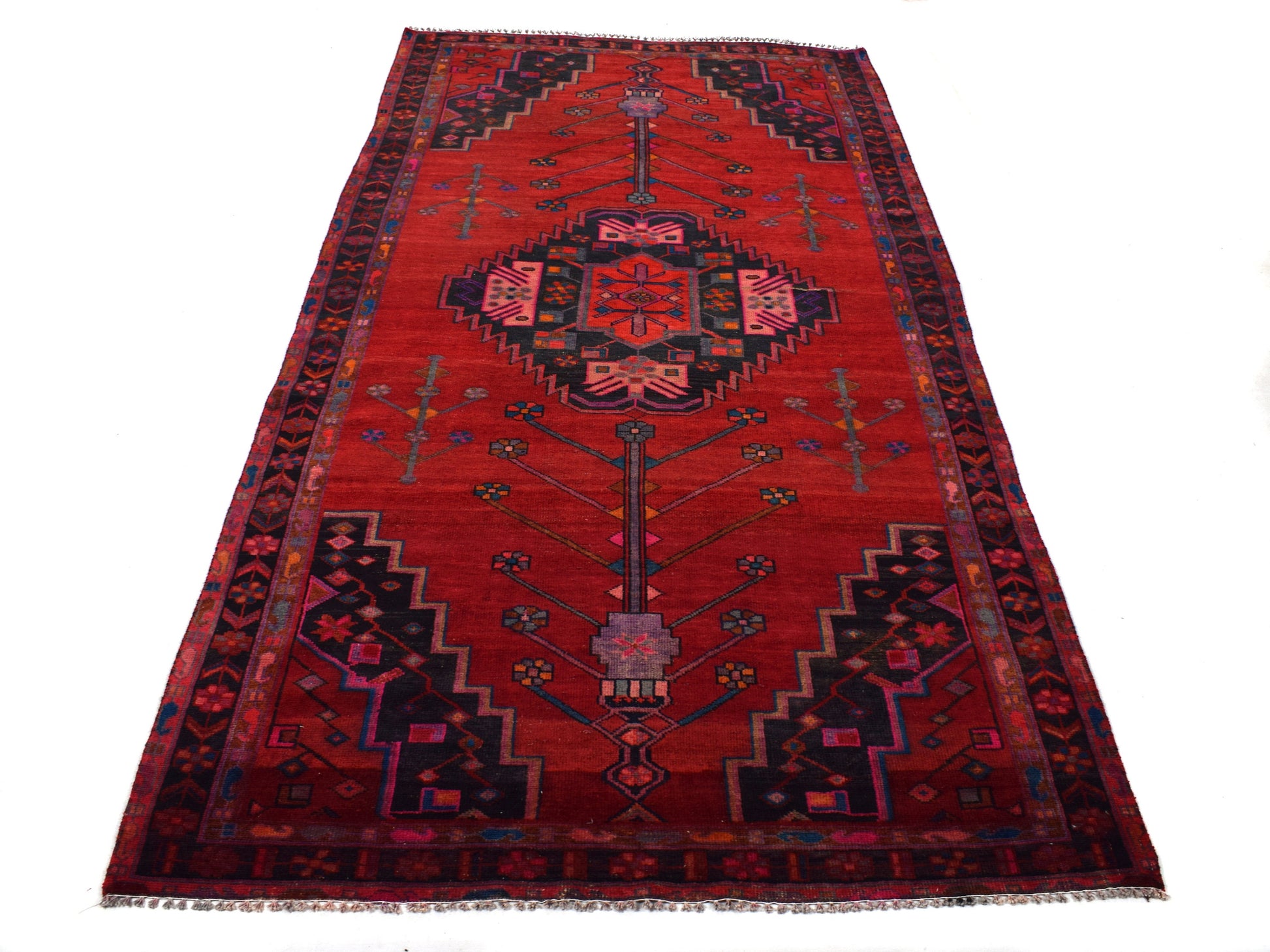 The vintage rugs in our collection have a rich and deep color palette and feature the characteristic design of a central pole medallion interspersed with geometric patterns and symmetrical shapes. Across their borders are often smaller bands encompassing a larger band with palm and leaf designs. A common theme in these rugs is geometric floral motives in various colors.