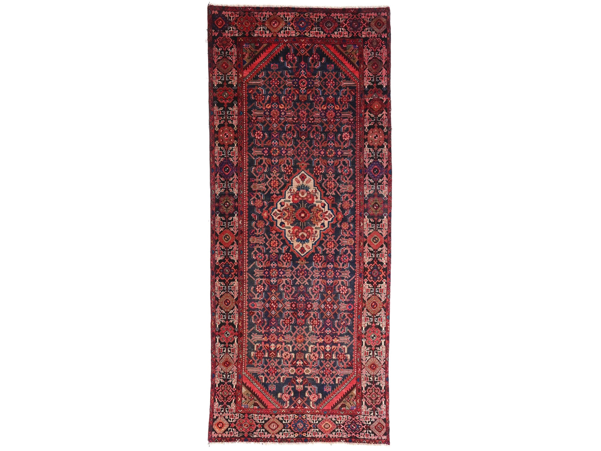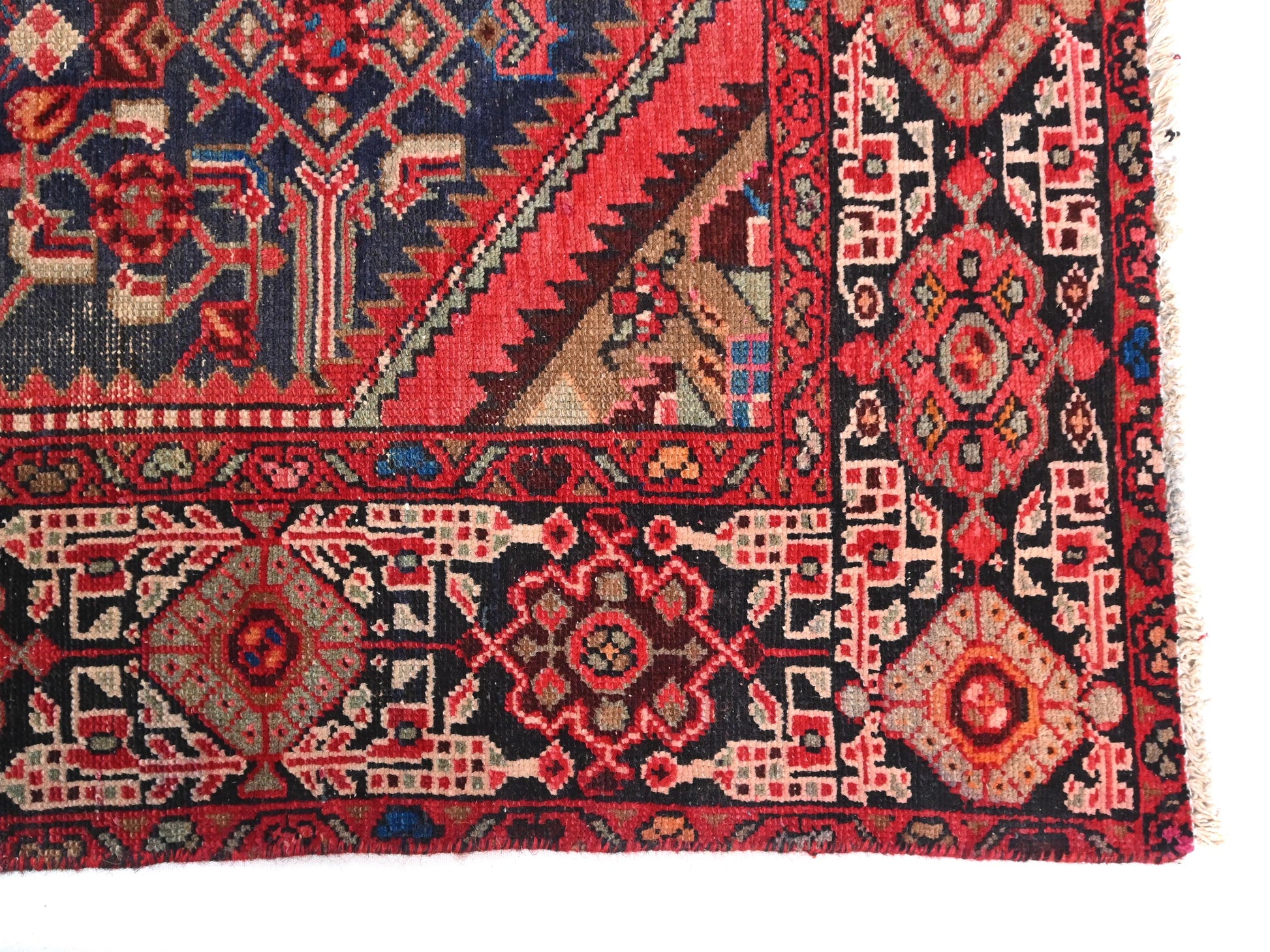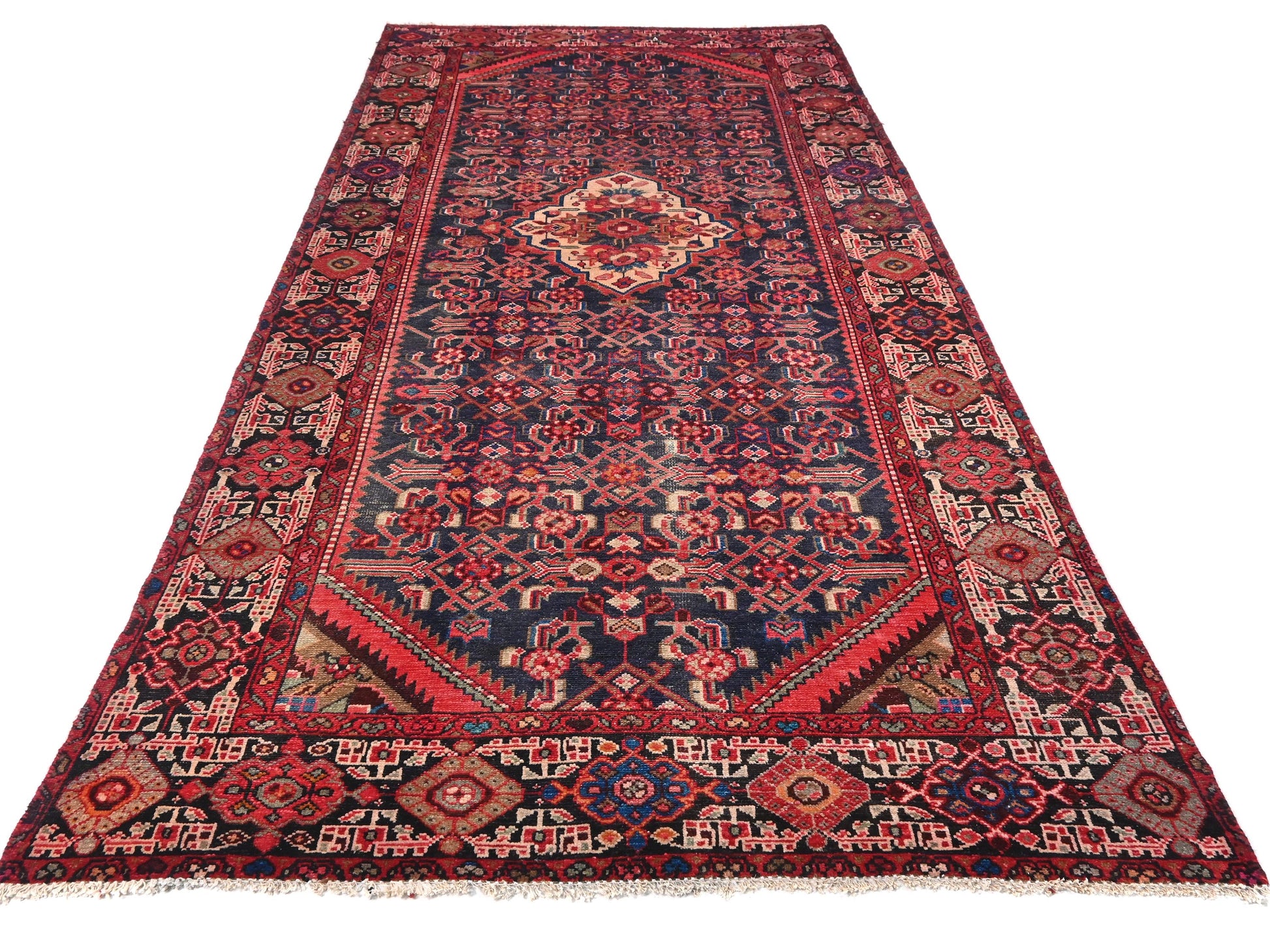 This 5x10 handmade Turkish tribal rug from 1970 commands attention with its intricate center medallion, woven with hues of ivory and rust over a navy blue and red floral field. The diagonal corner motifs and richly decorated borders create a balanced and ornate look that instantly elevates any room.