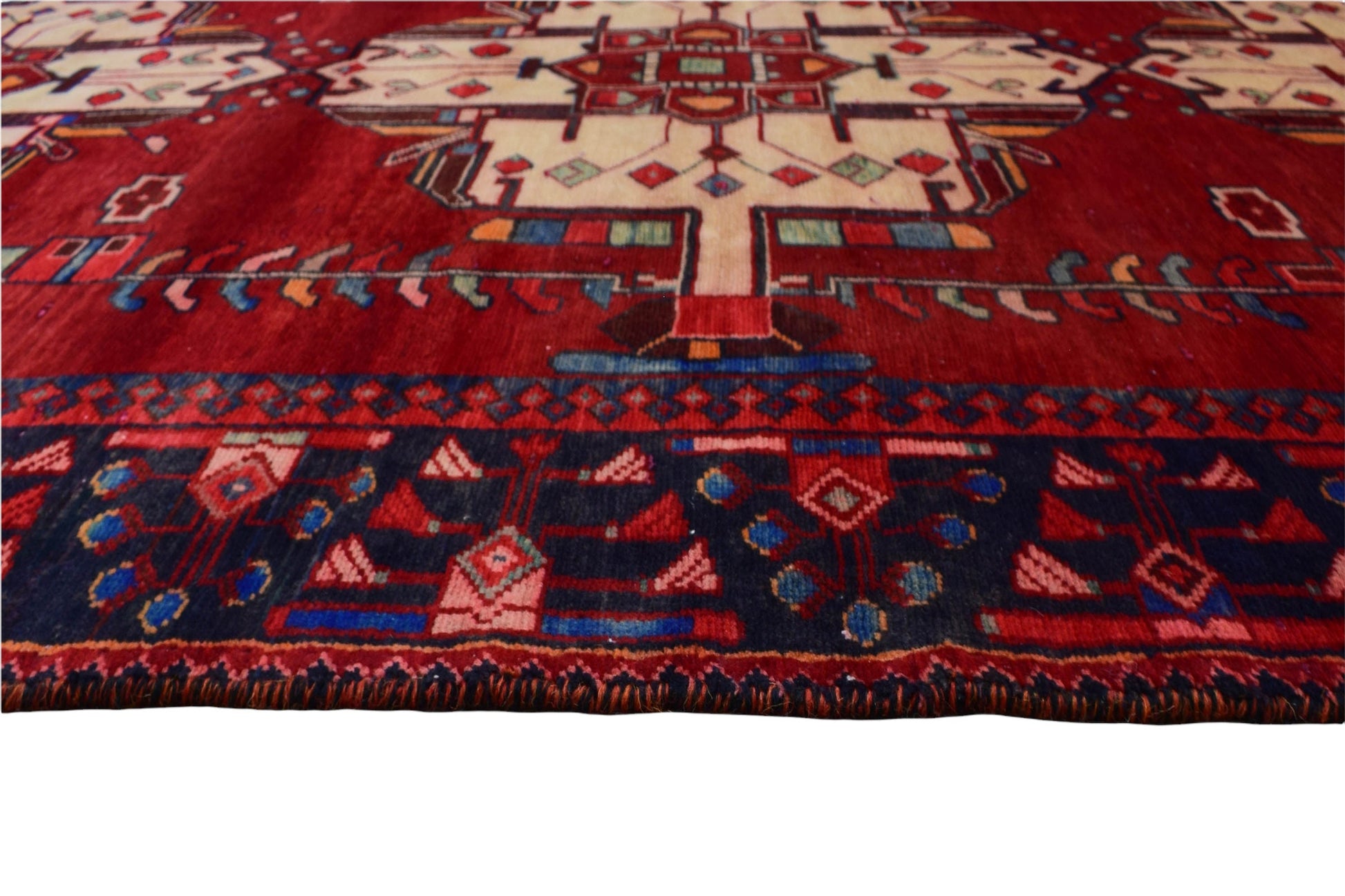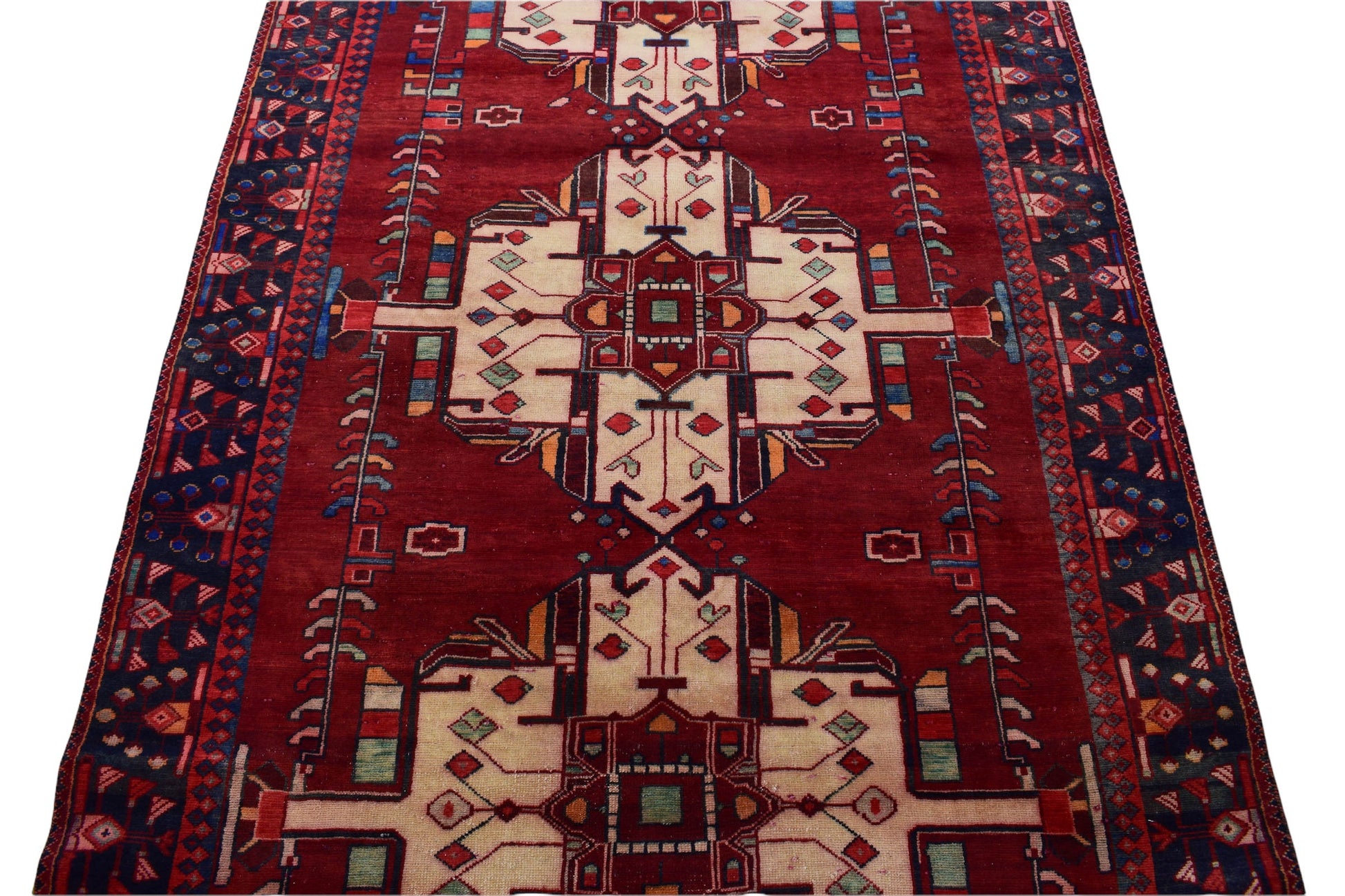 The vintage rugs in our collection have a rich and deep color palette and feature the characteristic design of a central pole medallion interspersed with geometric patterns and symmetrical shapes. Across their borders are often smaller bands encompassing a larger band with palm and leaf designs. A common theme in these rugs is geometric floral motives in various colors.