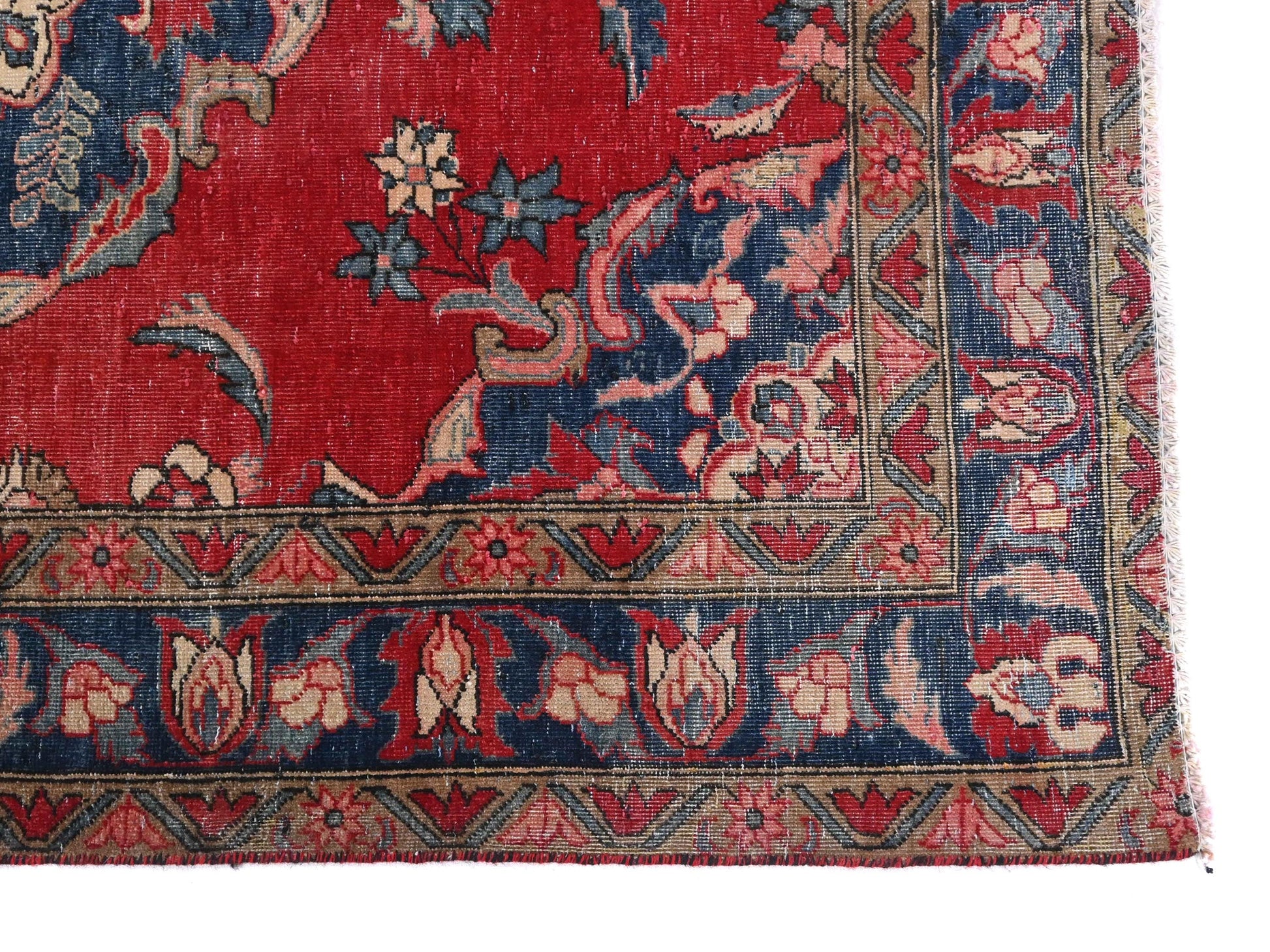 This 5x6 handmade Turkish vintage rug from 1980 features a rich red field anchored by a dramatic navy and ivory central floral medallion. Surrounding the centerpiece is an elegant arrangement of scrolling vines and floral sprays that extend outward in perfect symmetry. The saturated border is wrapped in alternating blues, greens, and soft pinks with an ornate vine-scroll pattern, giving the piece both regal structure and botanical charm.