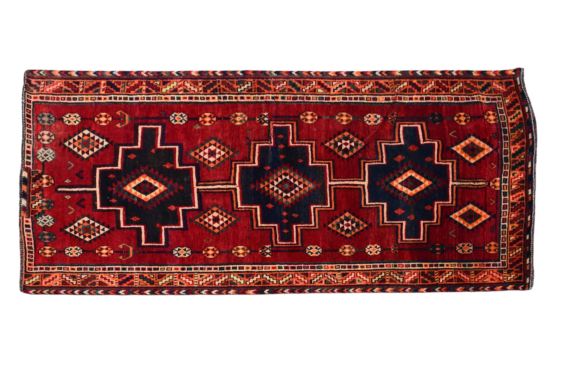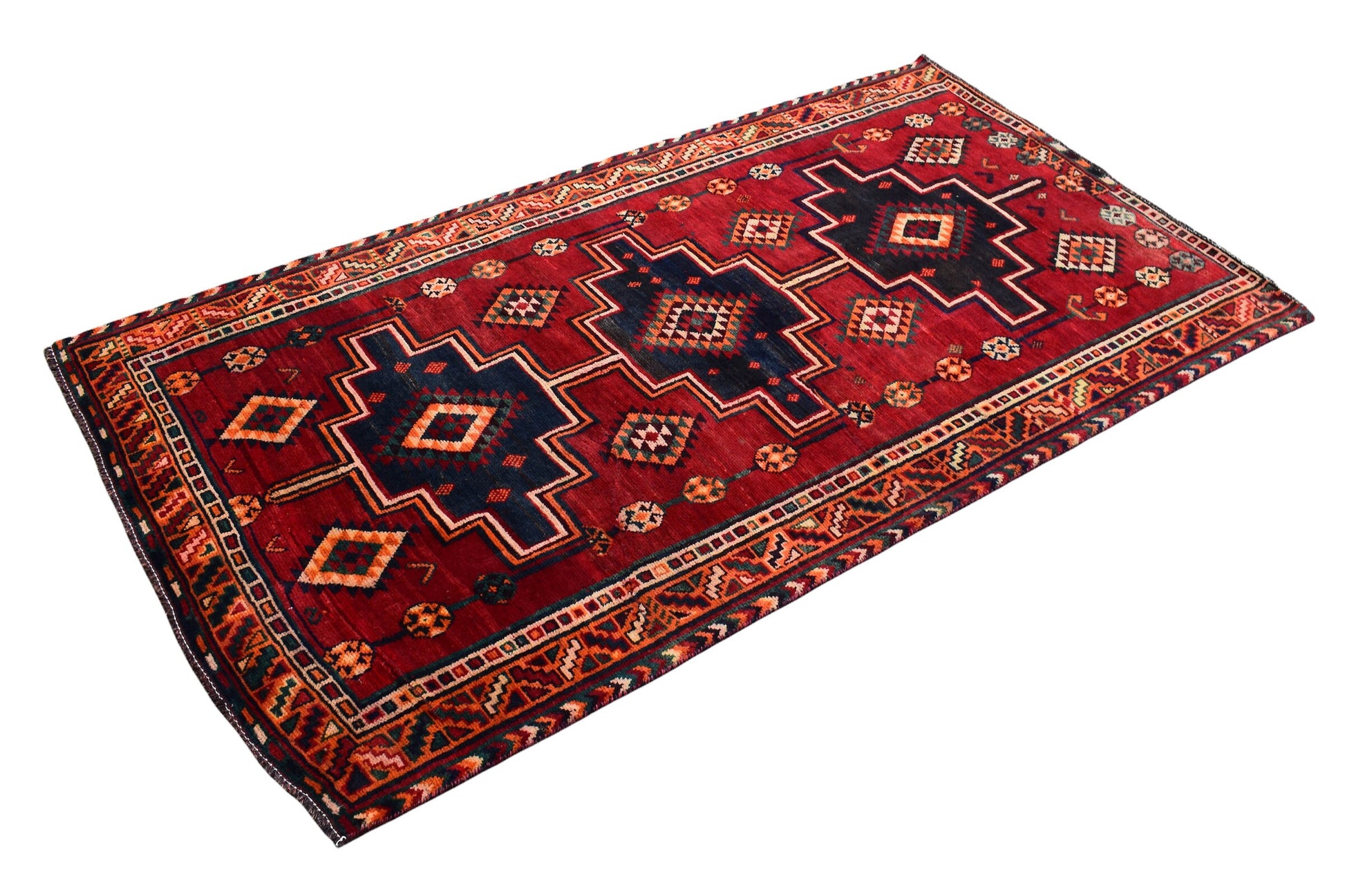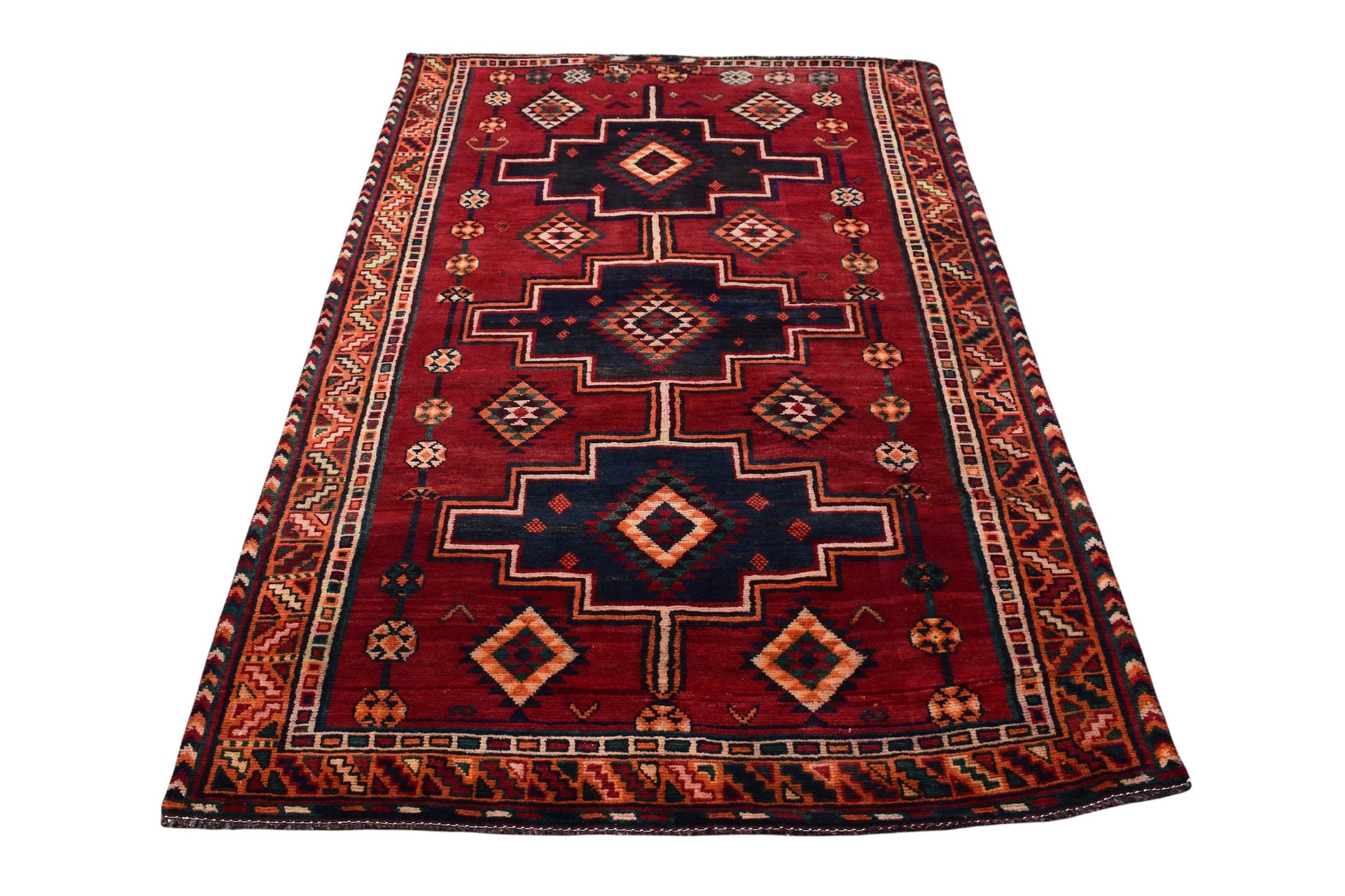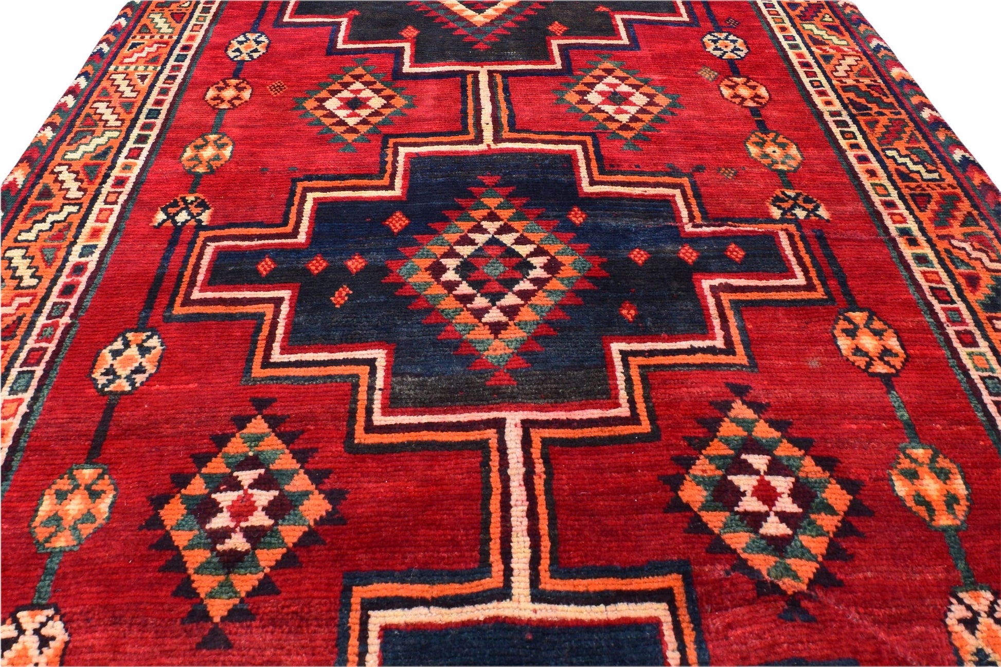 The vintage rugs in our collection have a rich and deep color palette and feature the characteristic design of a central pole medallion interspersed with geometric patterns and symmetrical shapes. Across their borders are often smaller bands encompassing a larger band with palm and leaf designs. A common theme in these rugs is geometric floral motives in various colors.