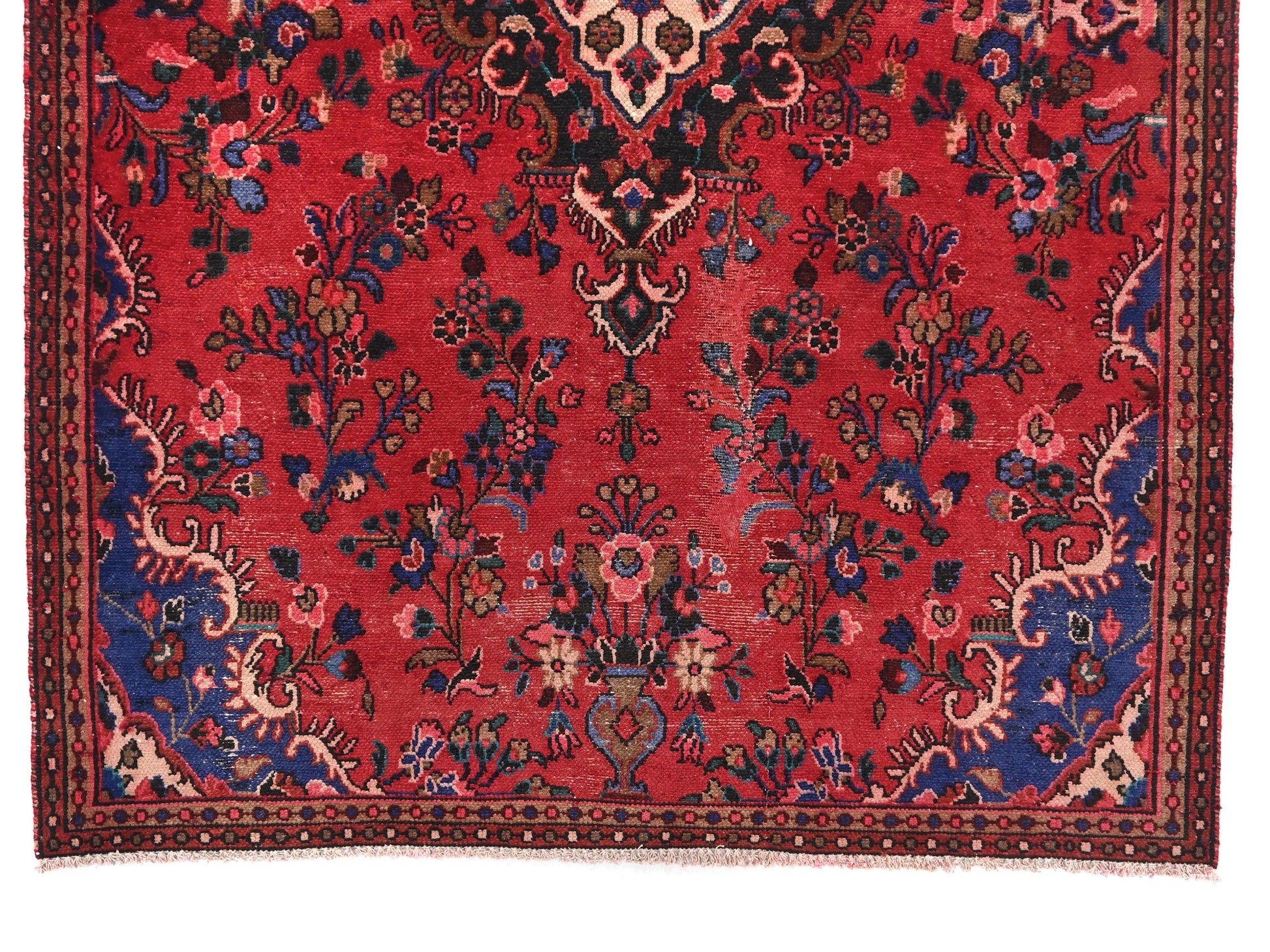 This 5x8 handmade Turkish vintage tribal rug from 1980 features a captivating central diamond medallion with ivory floral detailing, nestled against a deep red field. Surrounded by layers of blue and navy corner spandrels and finely knotted floral motifs, the entire design flows outward in symmetrical harmony, creating a perfect visual balance. The navy floral border frames the rug like a gallery, adding elegance and timeless structure.