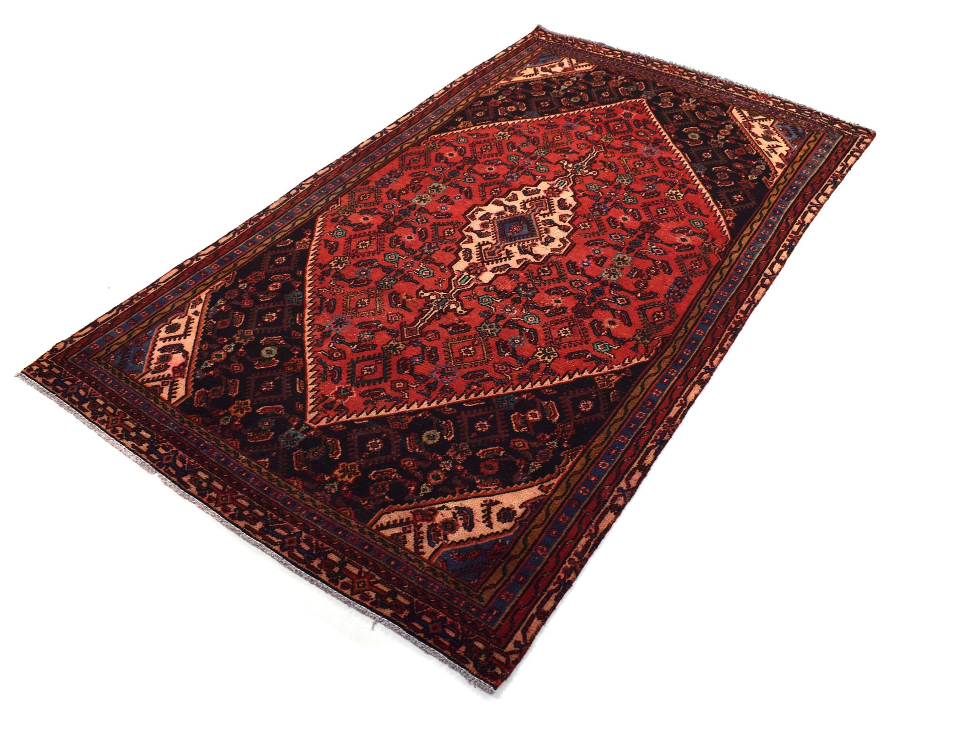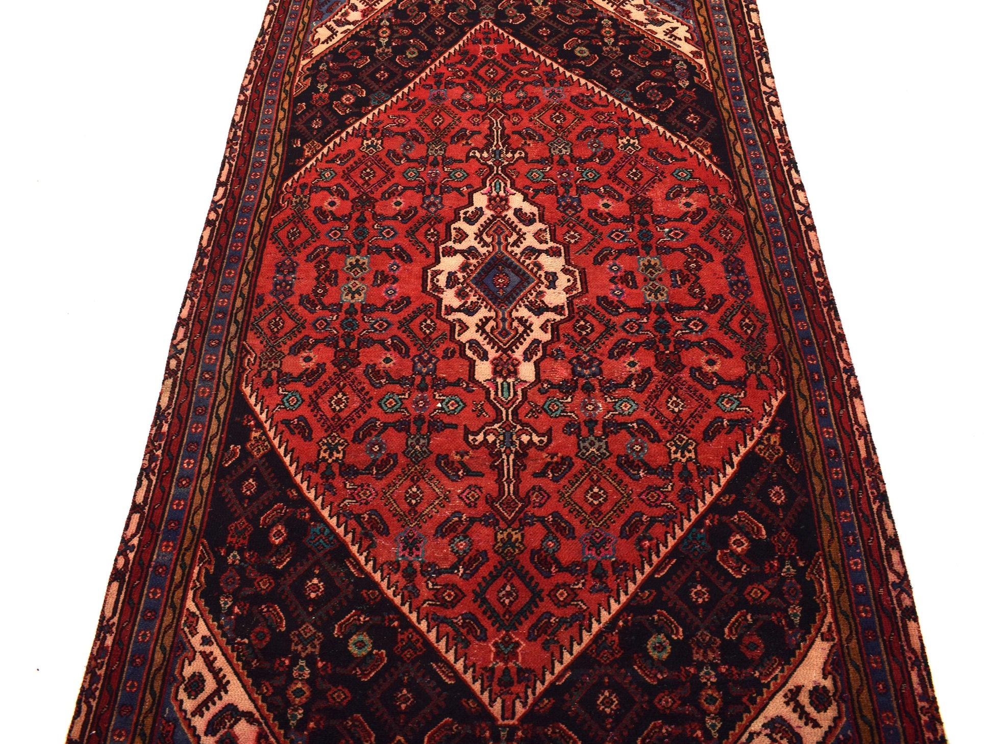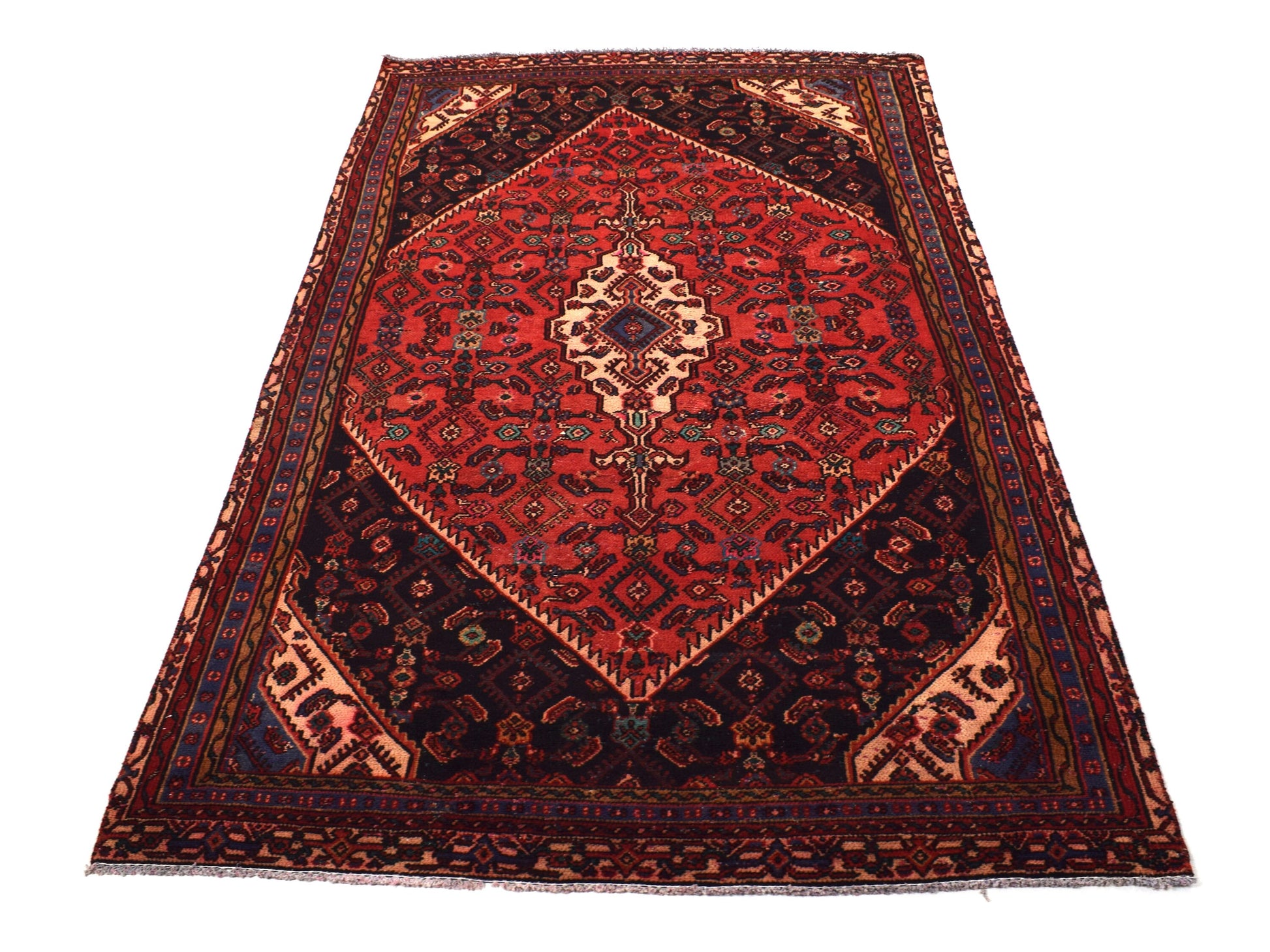 The vintage rugs in our collection have a rich and deep color palette and feature the characteristic design of a central pole medallion interspersed with geometric patterns and symmetrical shapes. Across their borders are often smaller bands encompassing a larger band with palm and leaf designs. A common theme in these rugs is geometric floral motives in various colors.