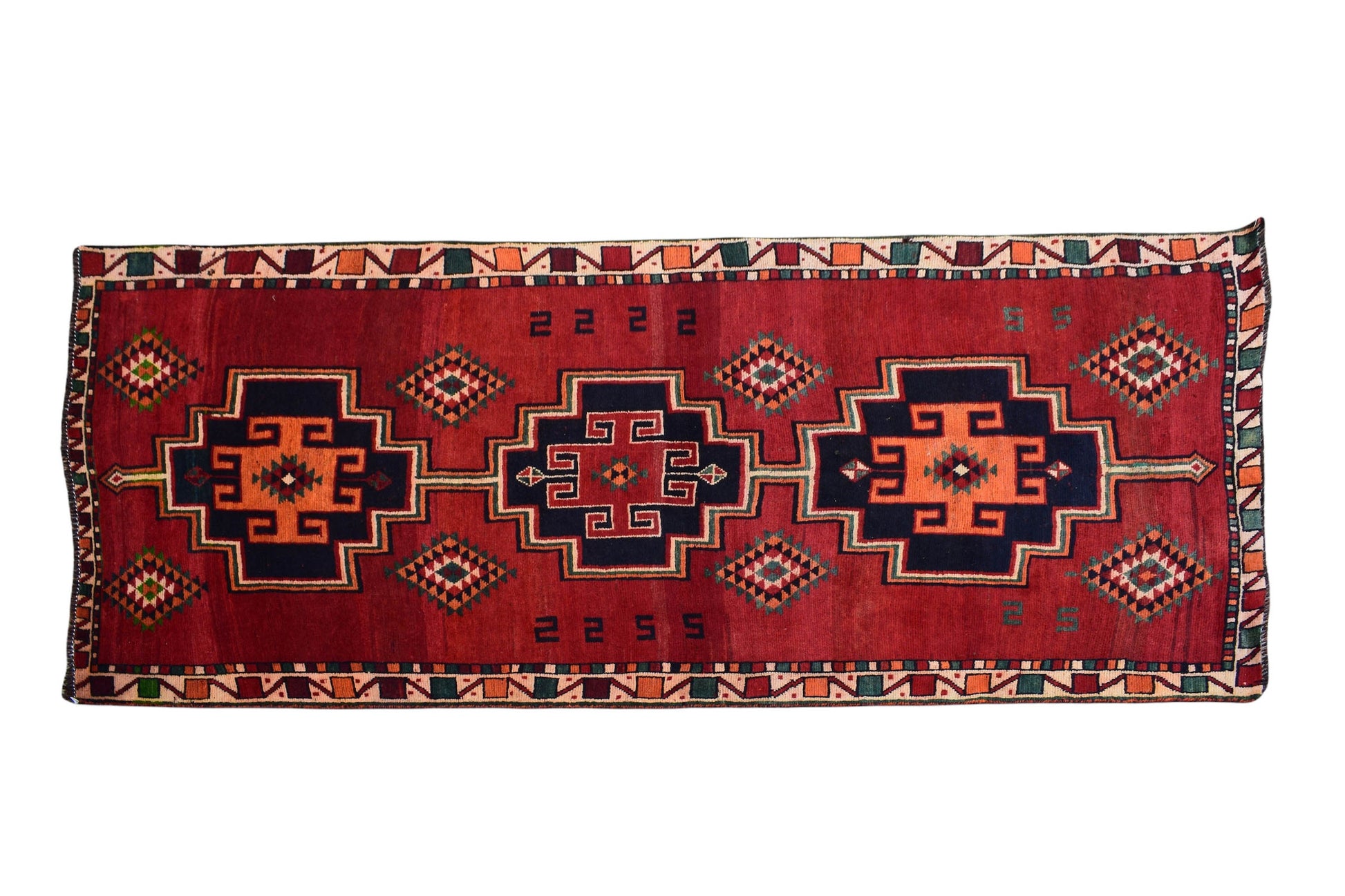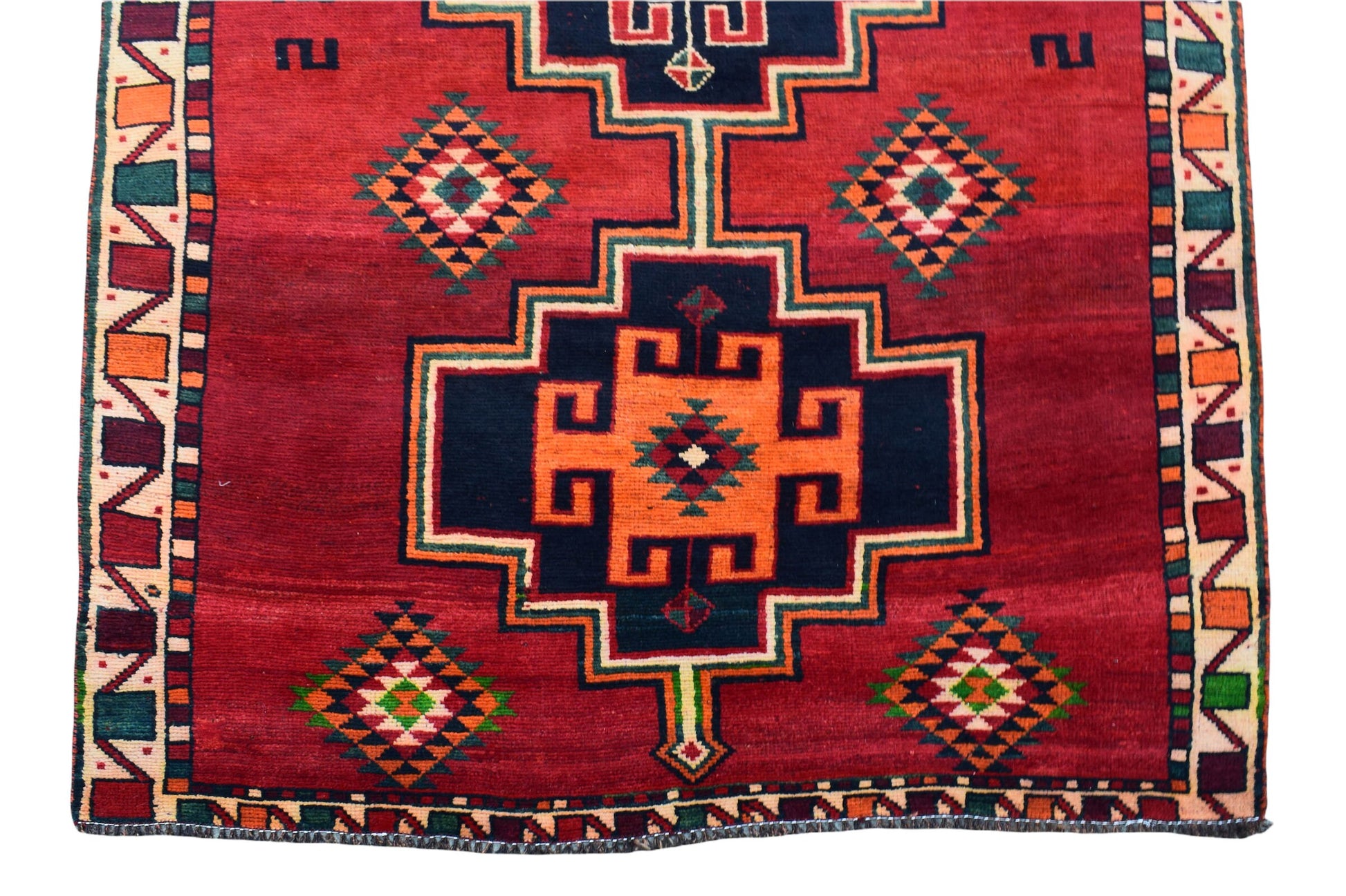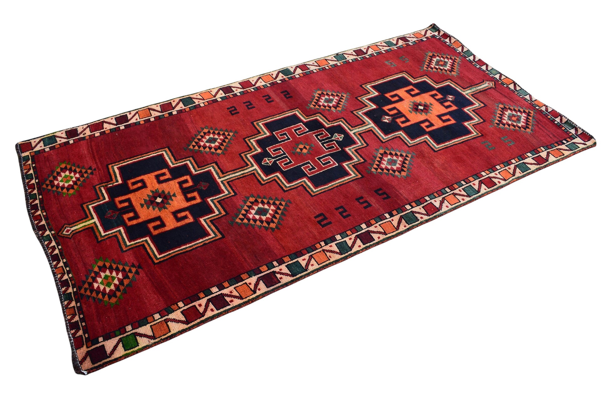The vintage rugs in our collection have a rich and deep color palette and feature the characteristic design of a central pole medallion interspersed with geometric patterns and symmetrical shapes. Across their borders are often smaller bands encompassing a larger band with palm and leaf designs. A common theme in these rugs is geometric floral motives in various colors.