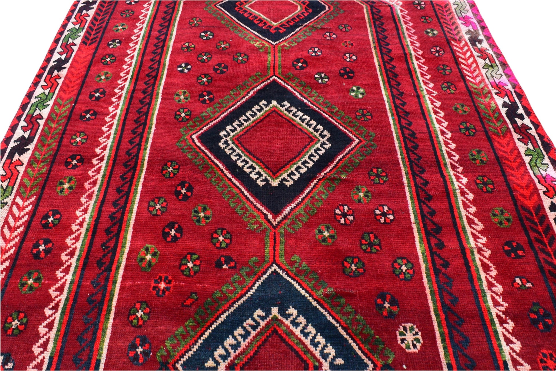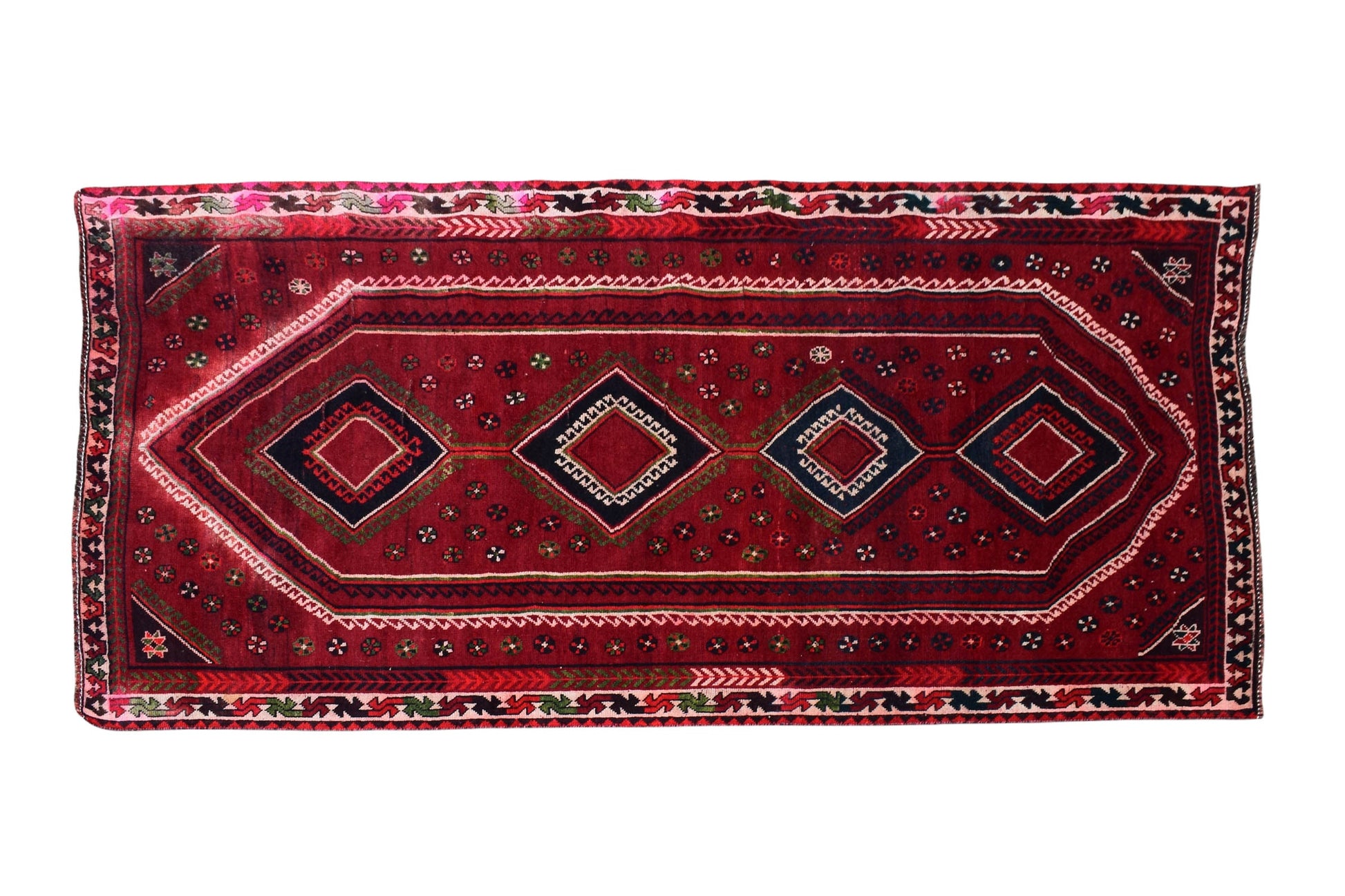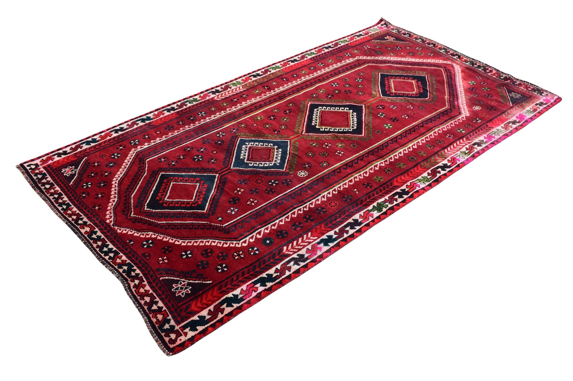 The vintage rugs in our collection have a rich and deep color palette and feature the characteristic design of a central pole medallion interspersed with geometric patterns and symmetrical shapes. Across their borders are often smaller bands encompassing a larger band with palm and leaf designs. A common theme in these rugs is geometric floral motives in various colors.
