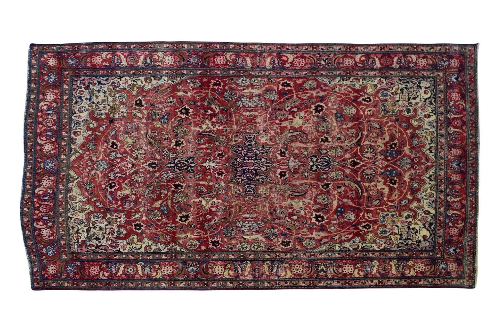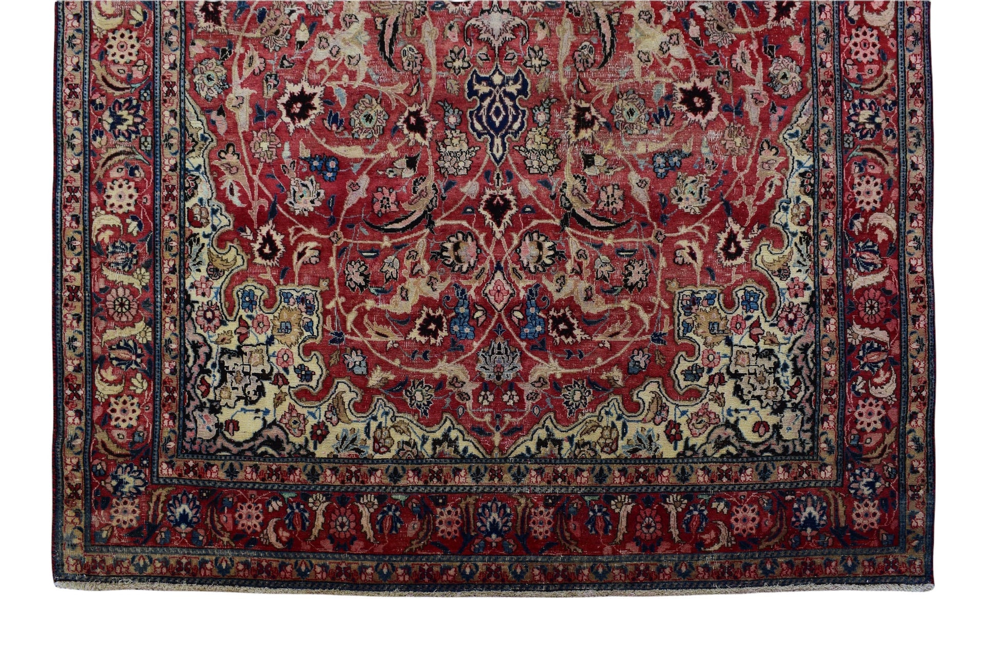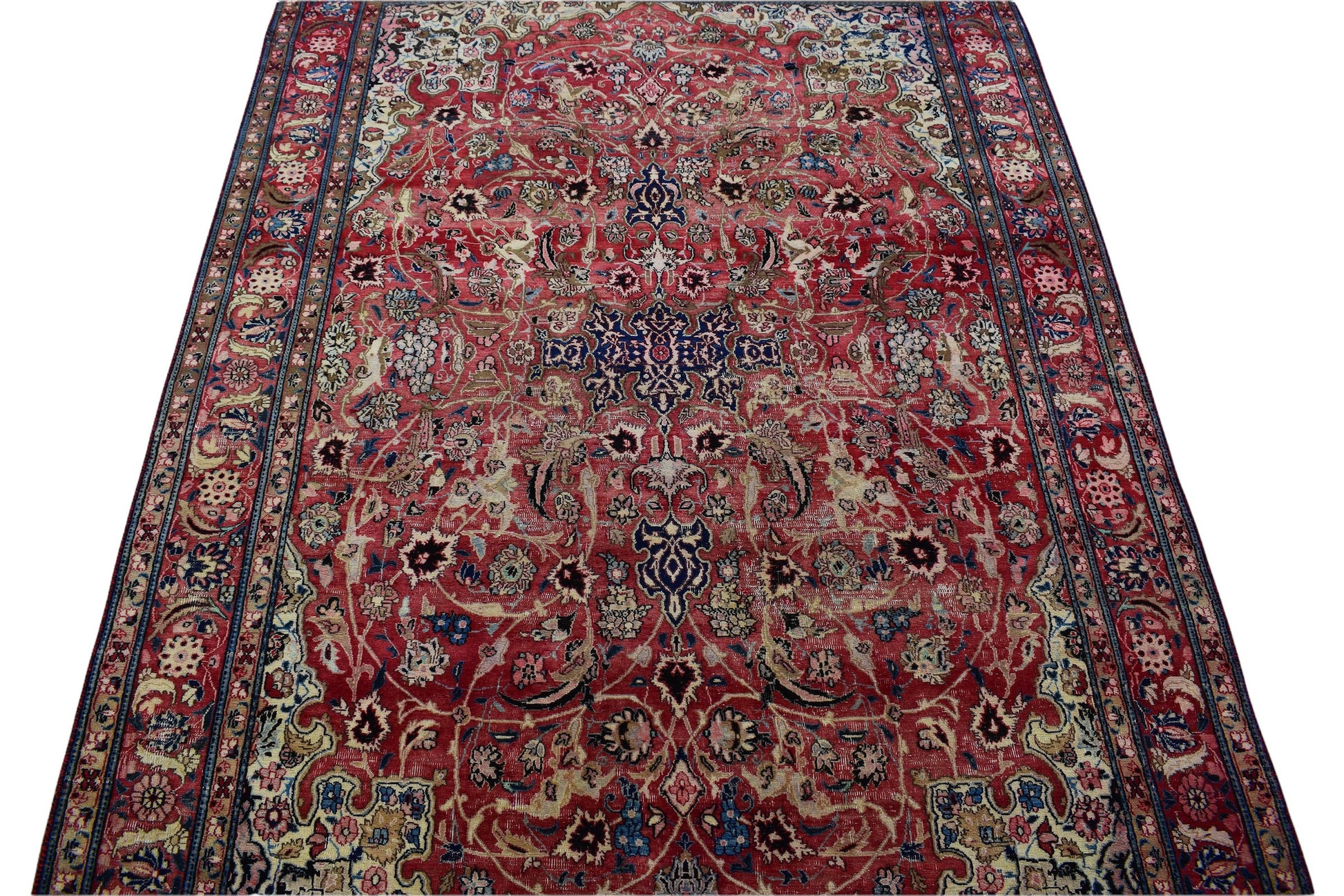 The vintage rugs in our collection have a rich and deep color palette and feature the characteristic design of a central pole medallion interspersed with geometric patterns and symmetrical shapes. Across their borders are often smaller bands encompassing a larger band with palm and leaf designs. A common theme in these rugs is geometric floral motives in various colors.