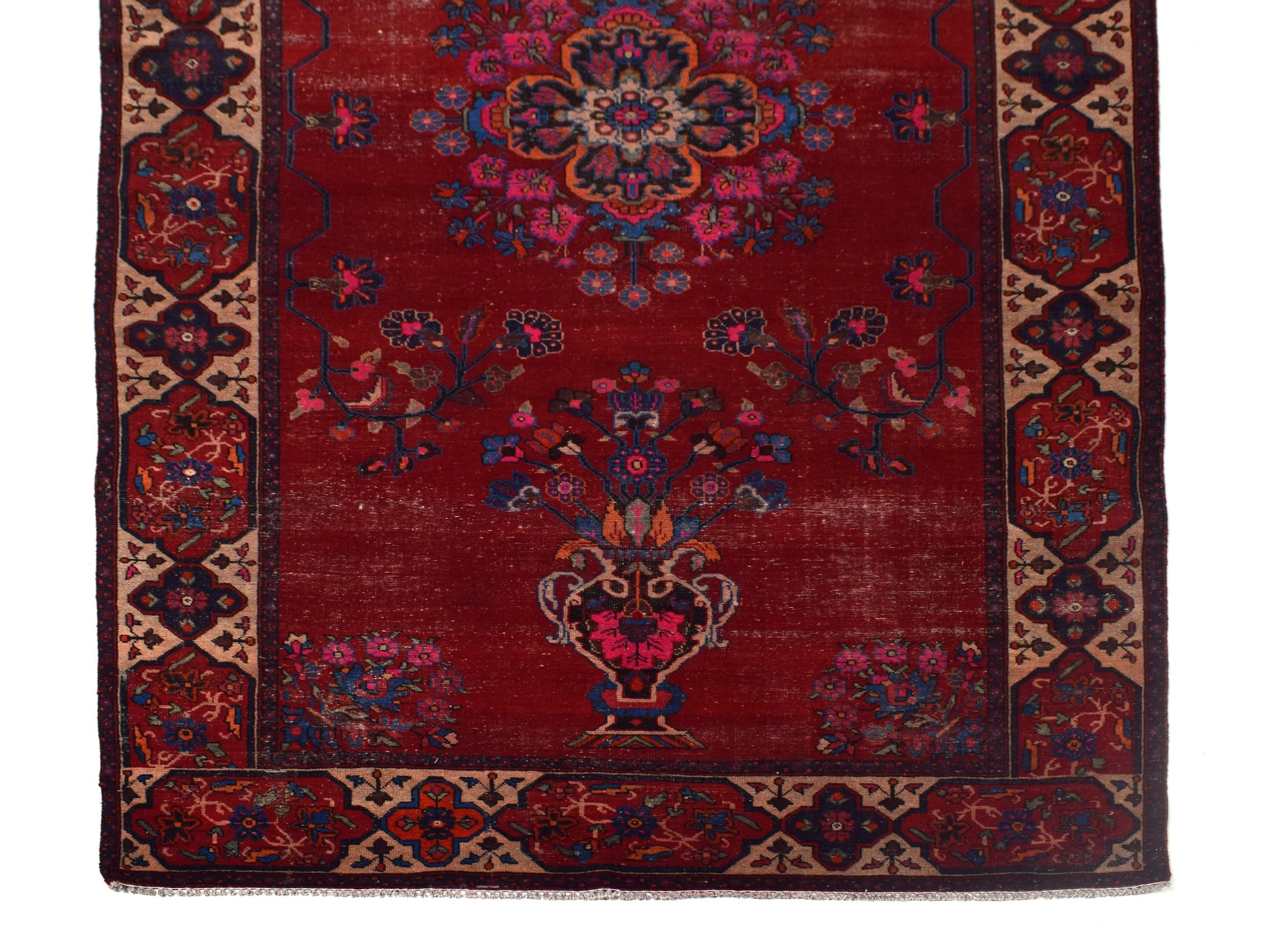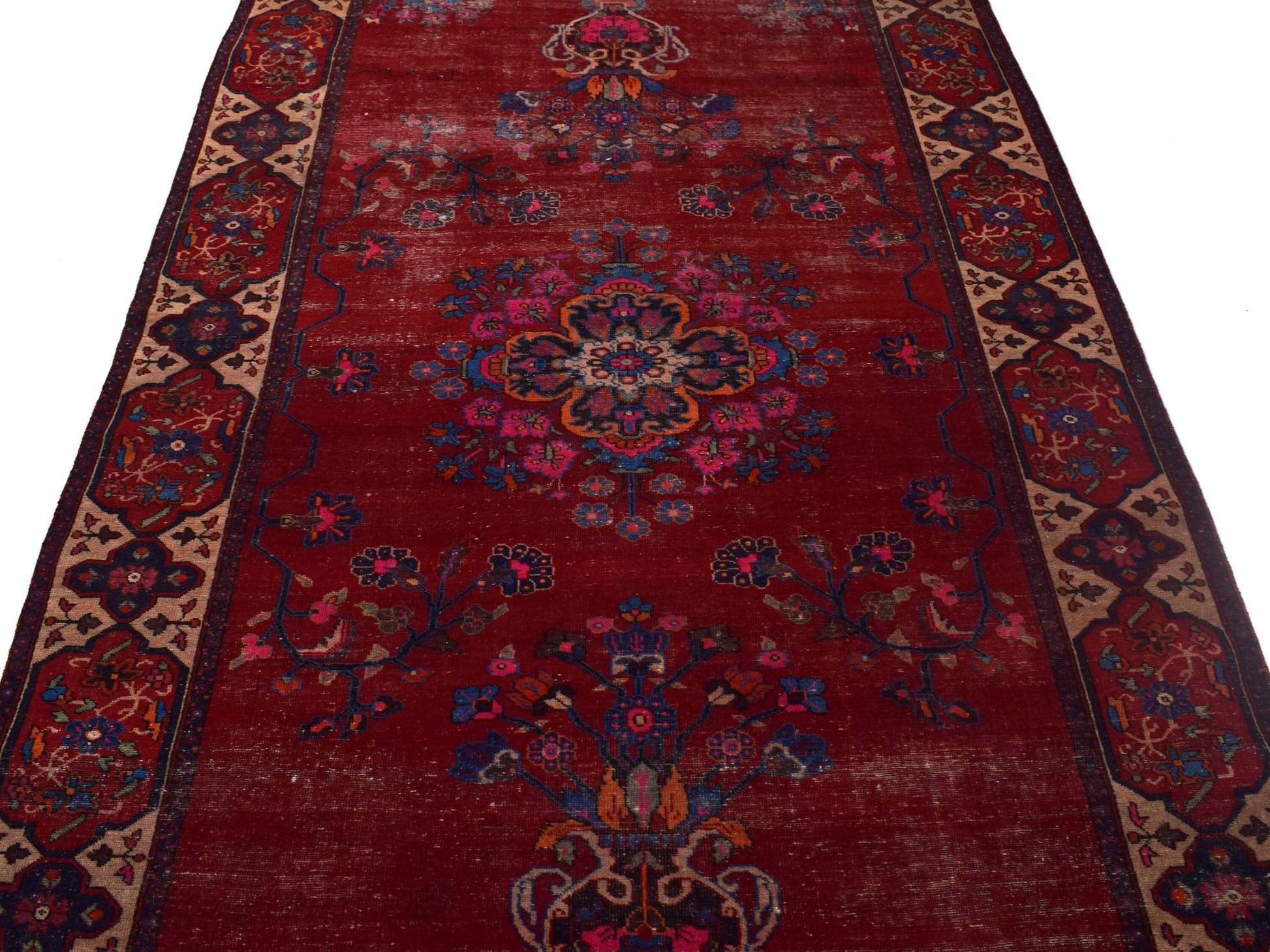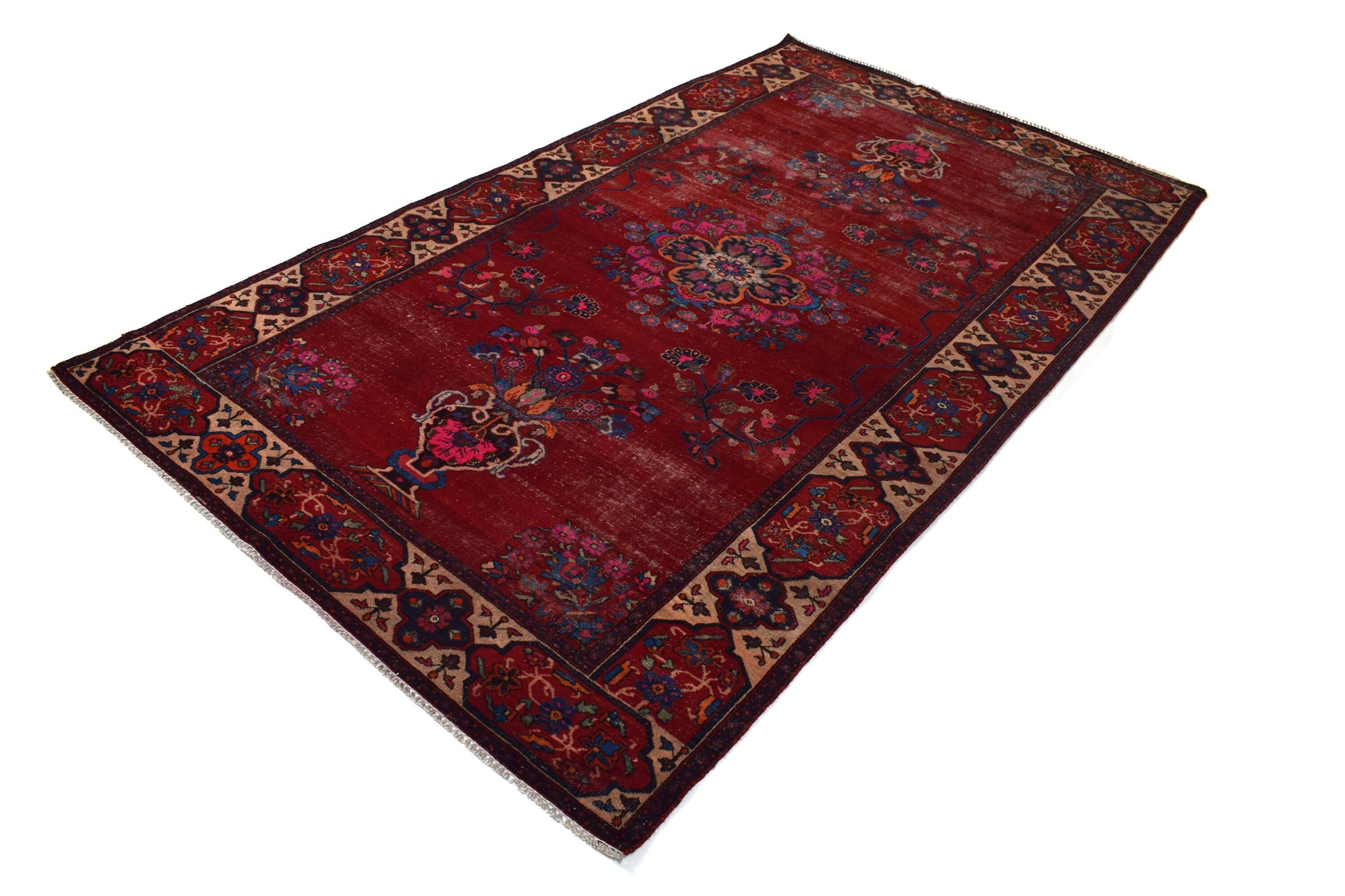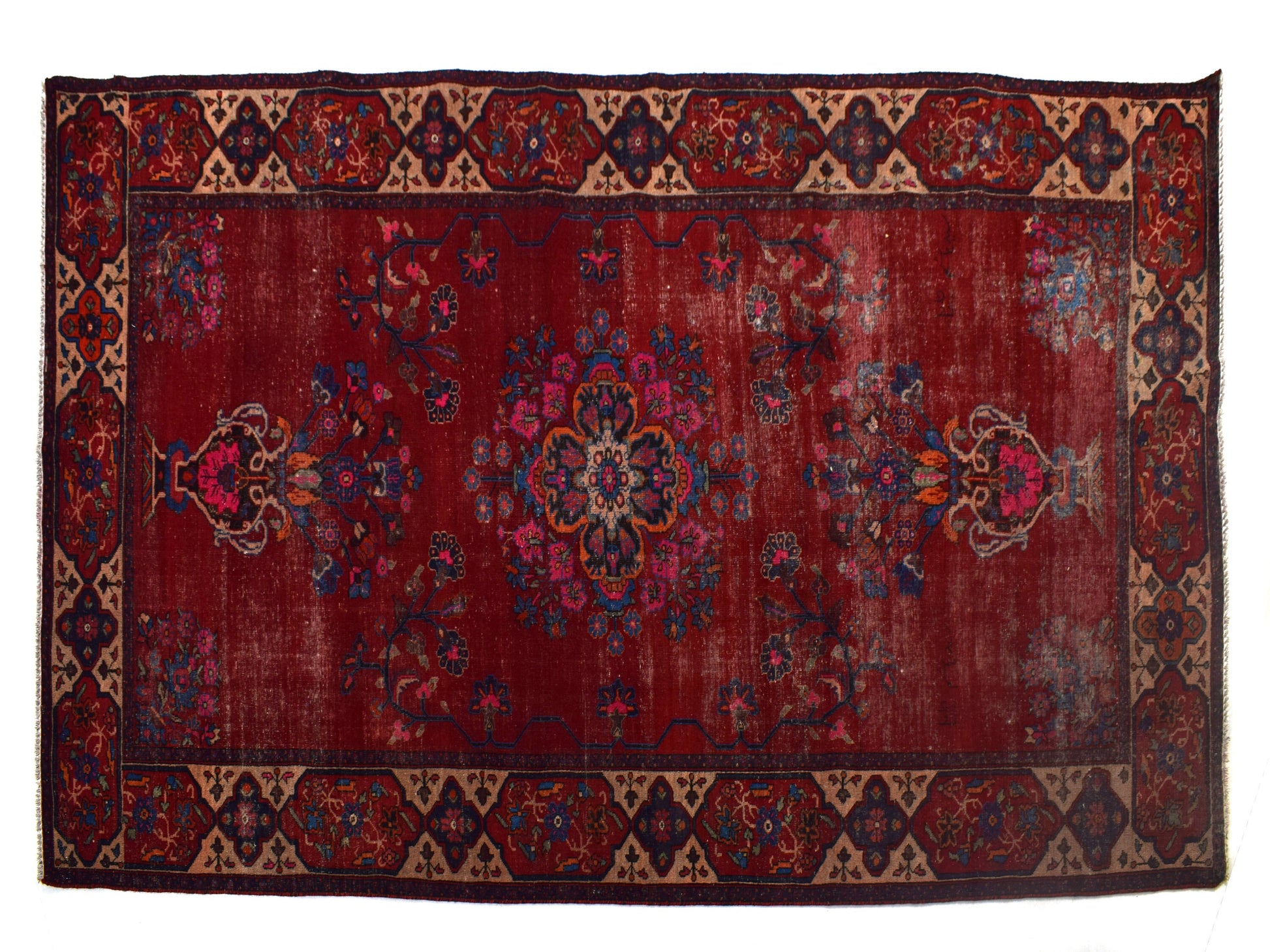 The vintage rugs in our collection have a rich and deep color palette and feature the characteristic design of a central pole medallion interspersed with geometric patterns and symmetrical shapes. Across their borders are often smaller bands encompassing a larger band with palm and leaf designs. A common theme in these rugs is geometric floral motives in various colors.