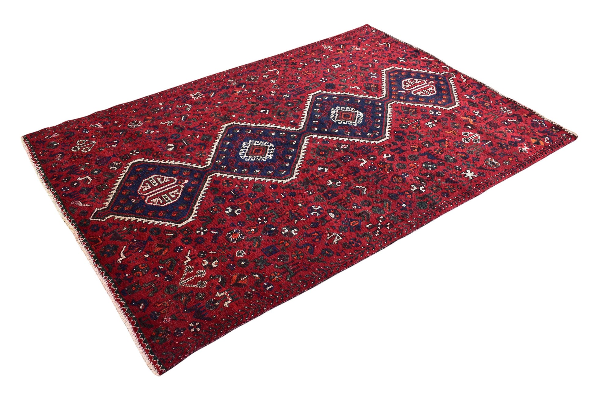 The vintage rugs in our collection have a rich and deep color palette and feature the characteristic design of a central pole medallion interspersed with geometric patterns and symmetrical shapes. Across their borders are often smaller bands encompassing a larger band with palm and leaf designs. A common theme in these rugs is geometric floral motives in various colors.