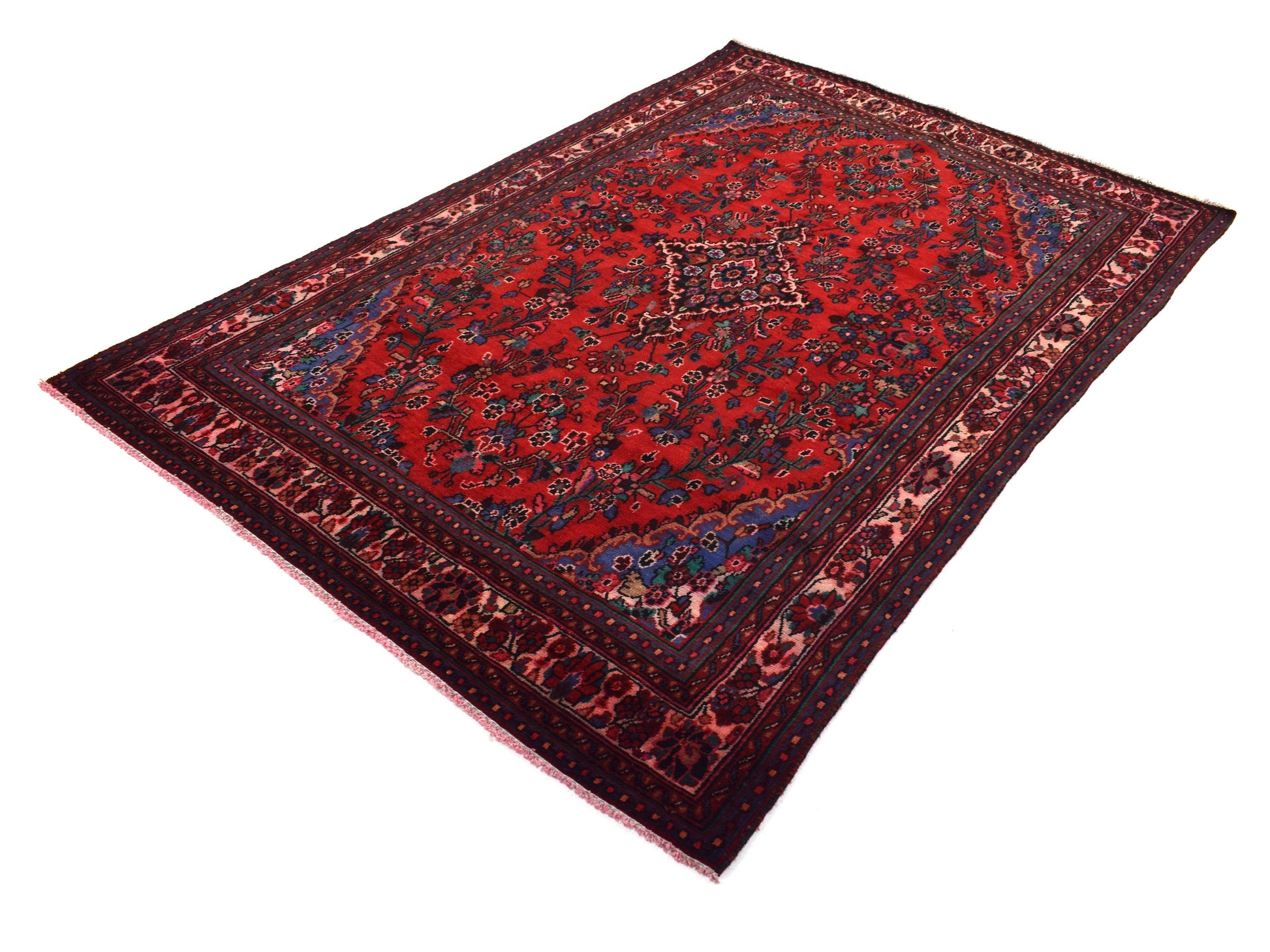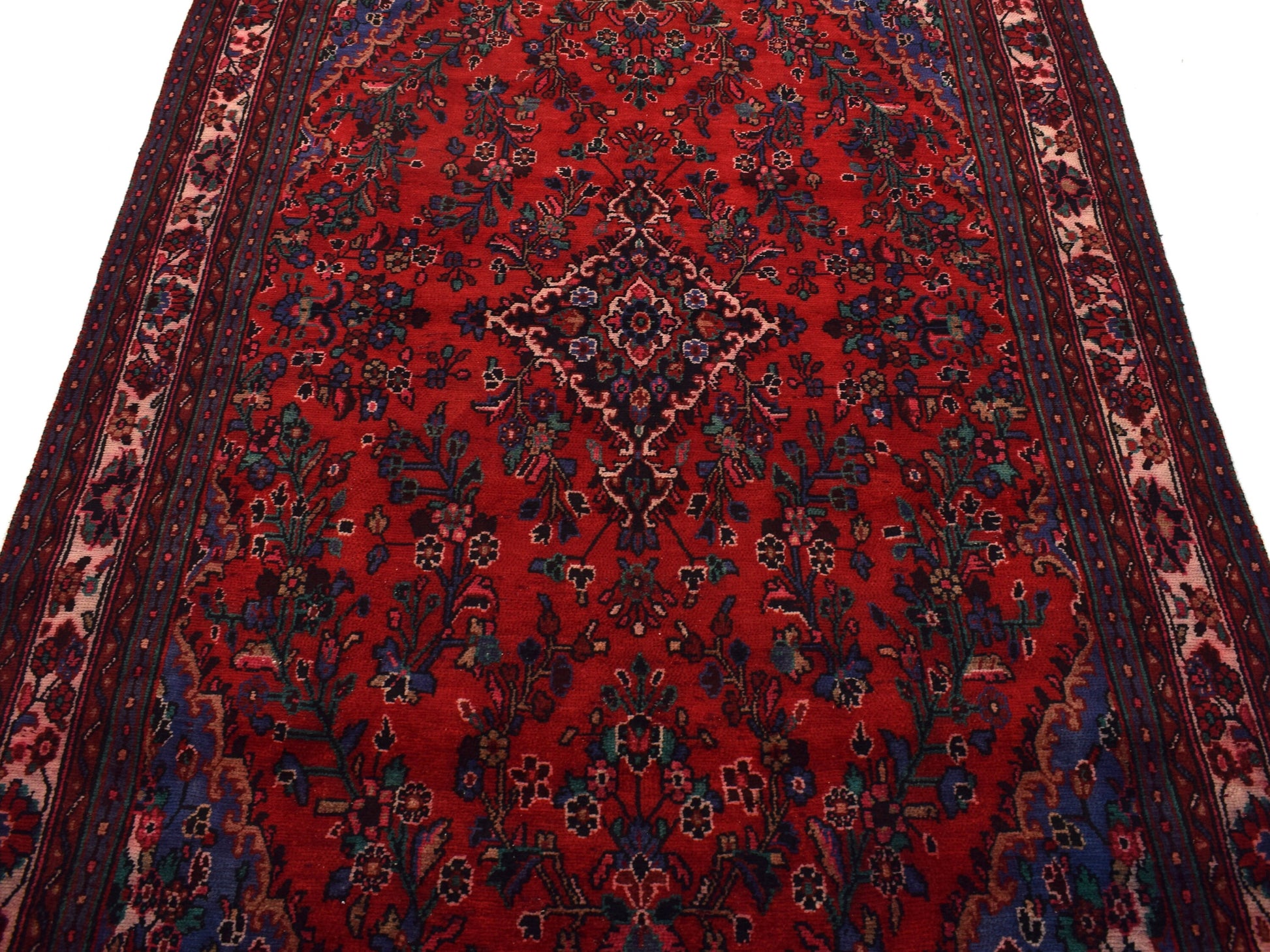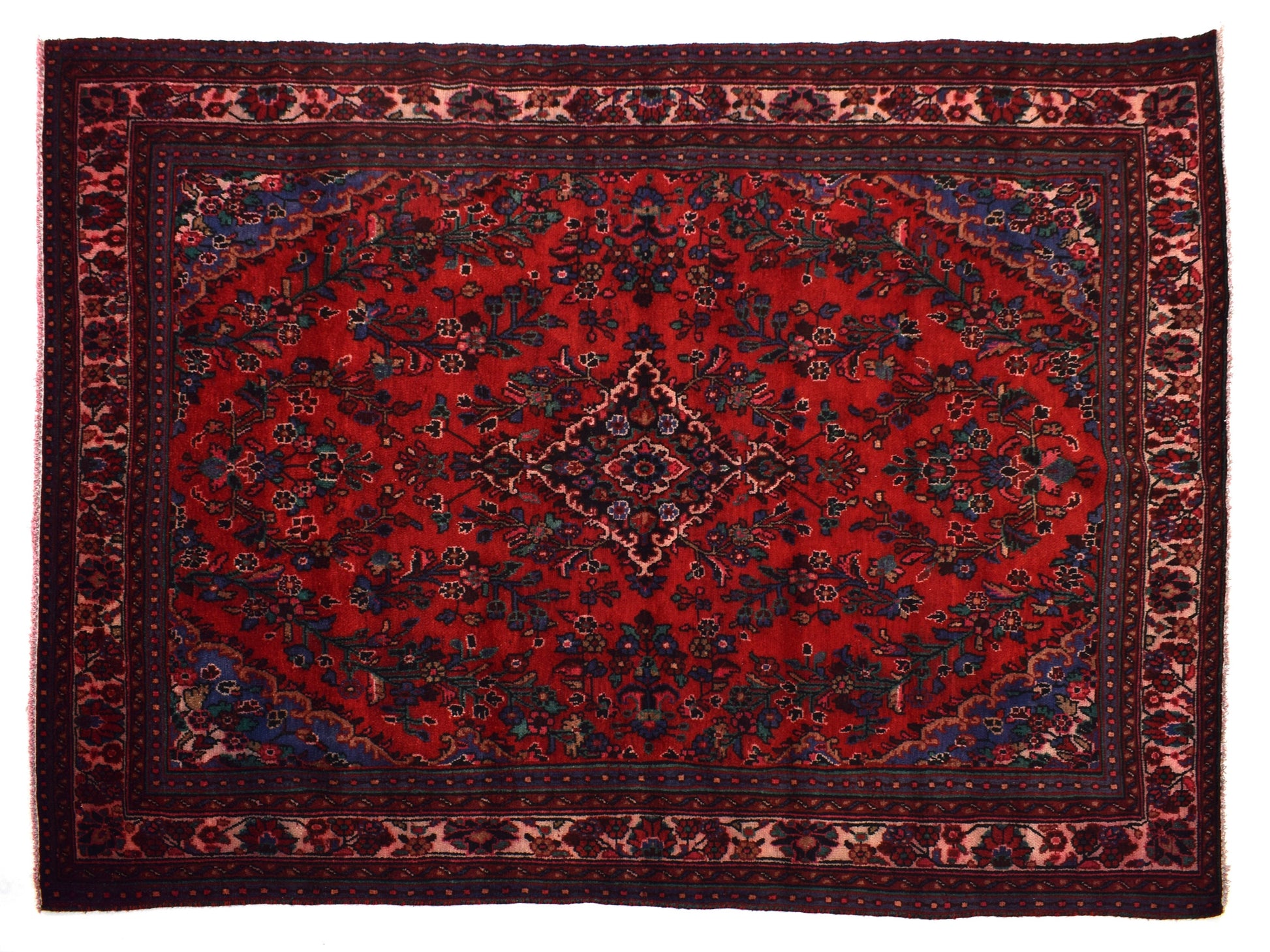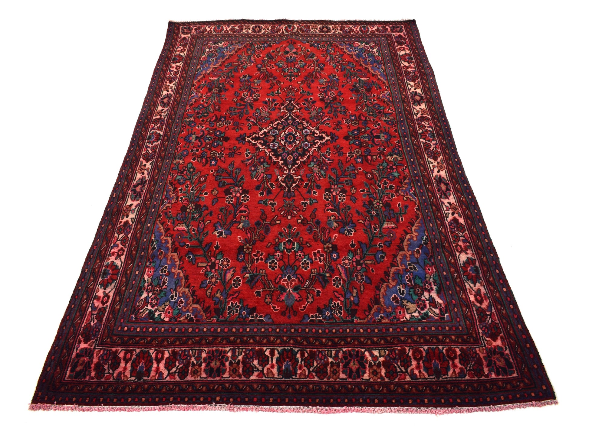 The vintage rugs in our collection have a rich and deep color palette and feature the characteristic design of a central pole medallion interspersed with geometric patterns and symmetrical shapes. Across their borders are often smaller bands encompassing a larger band with palm and leaf designs. A common theme in these rugs is geometric floral motives in various colors.