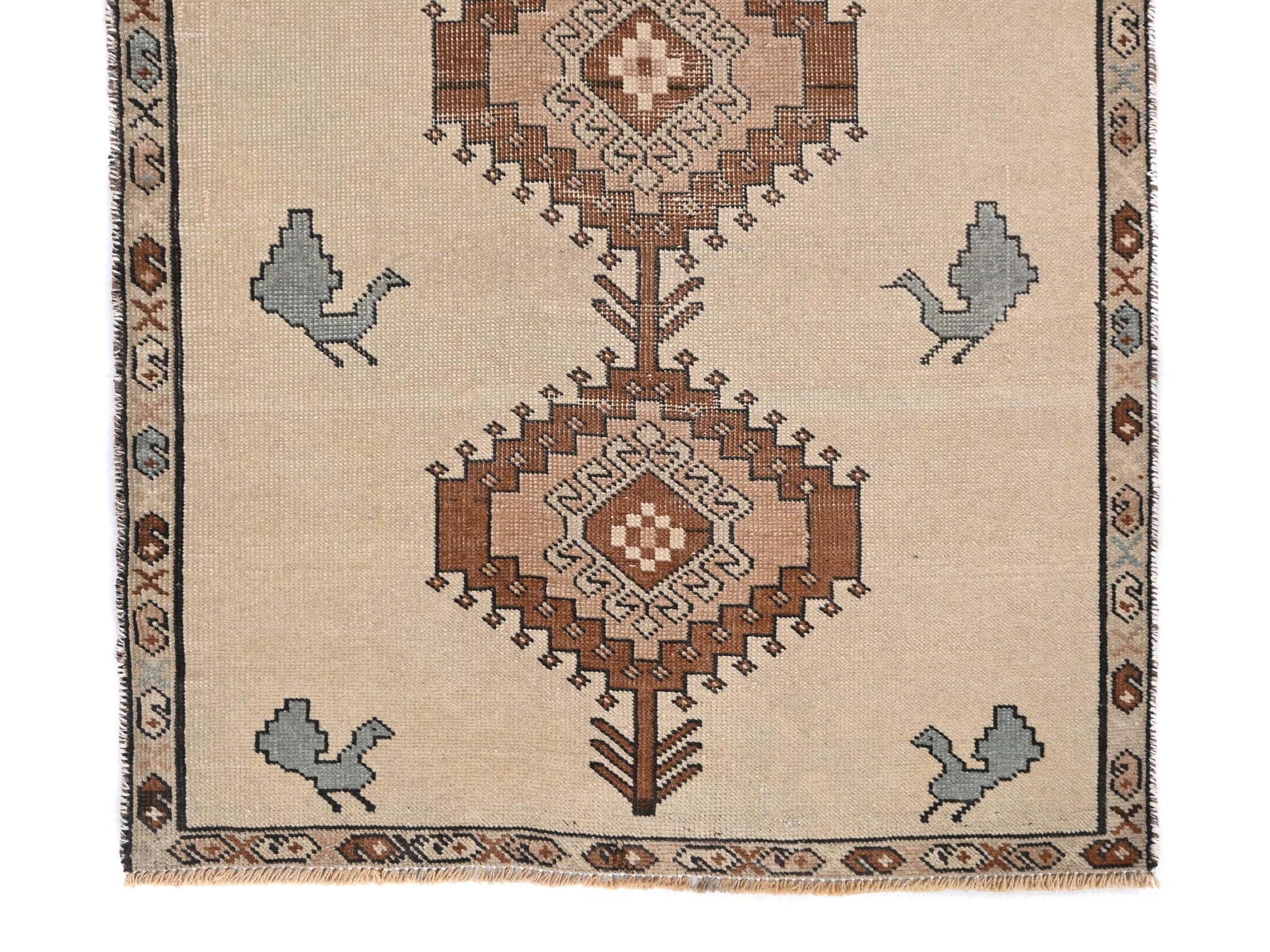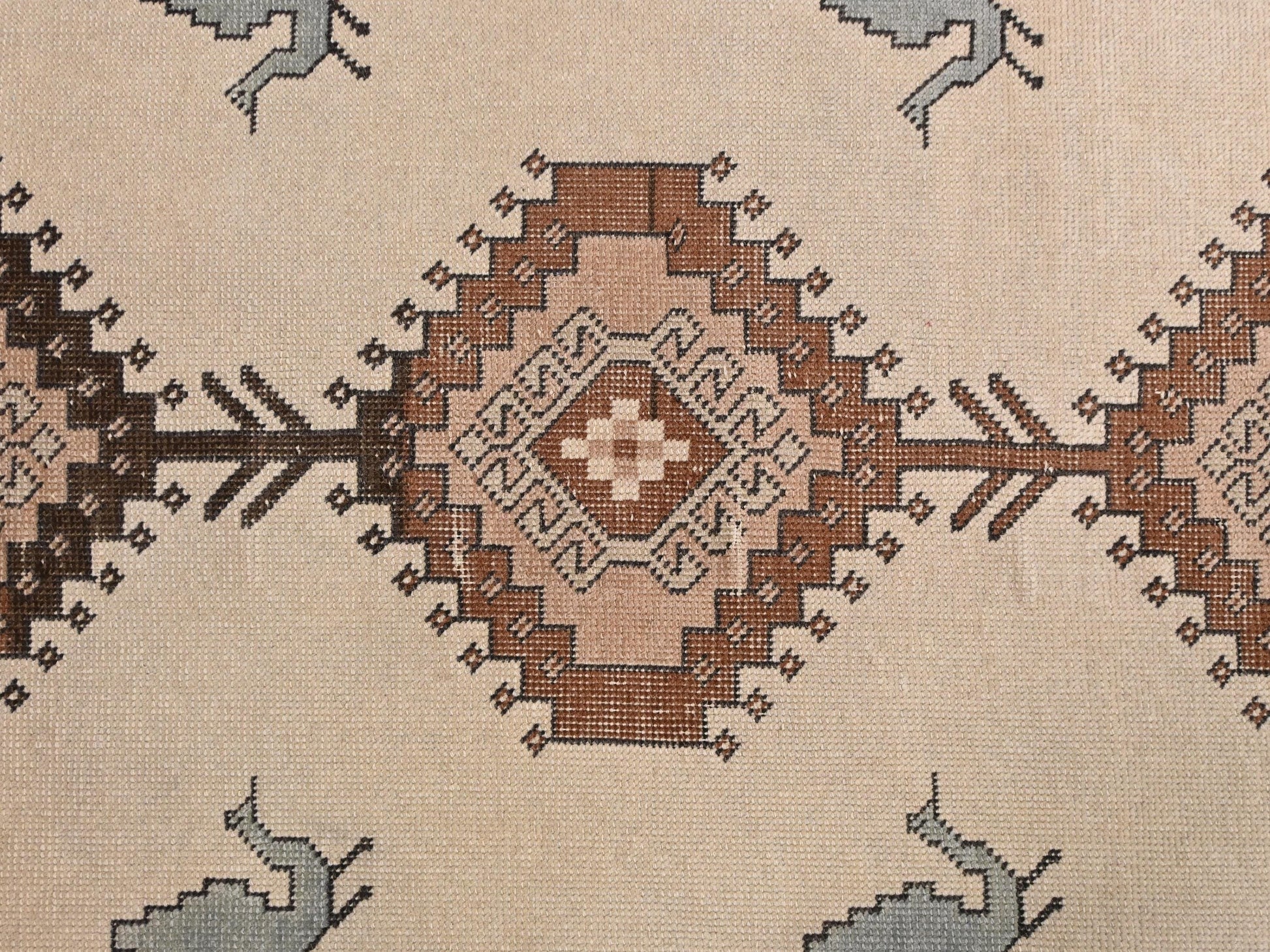 This rare 9x6 Turkish vintage tribal rug features a serene beige field punctuated by four stacked geometric medallions in earthy brown tones, each carefully woven with intricate patterns resembling ancient Anatolian motifs. Sky-blue dove figures are thoughtfully scattered throughout, adding both symmetry and symbolism, making this piece feel calm, grounded, and deeply meaningful.